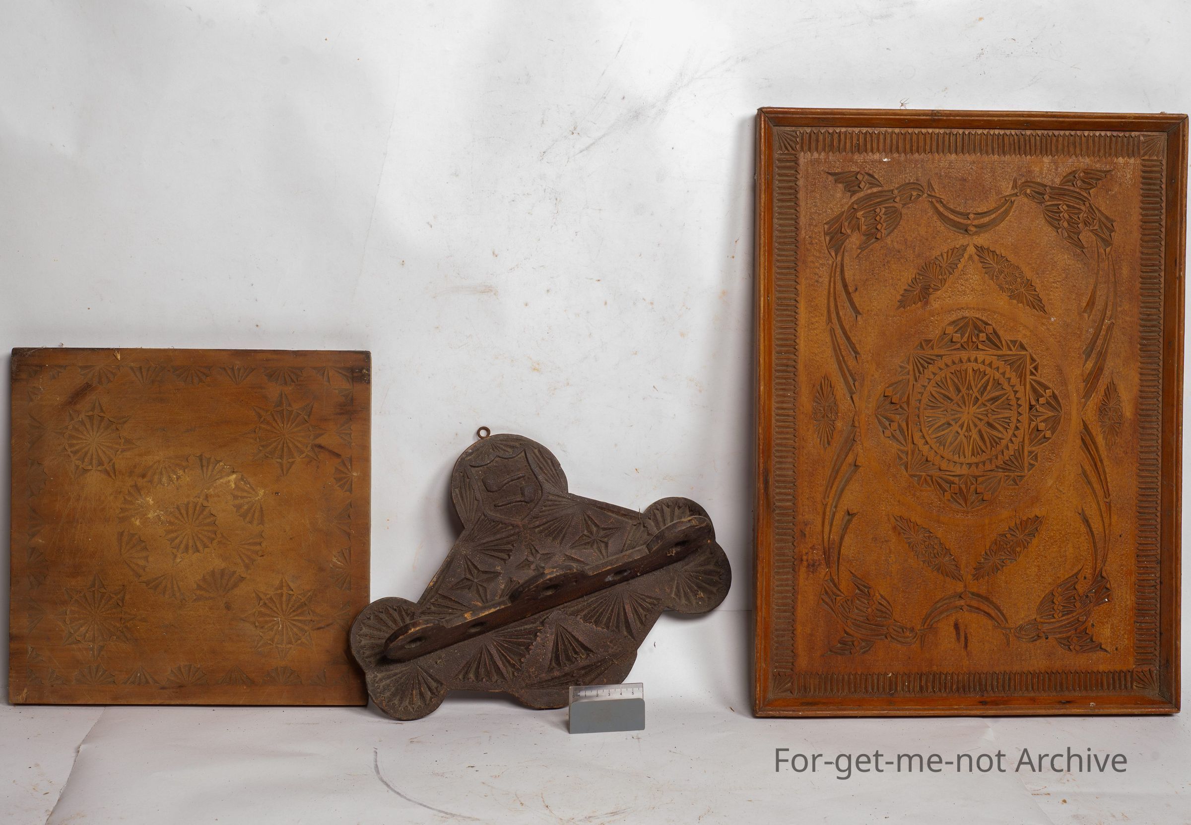 These are 3 different pieces of chipcraft. 1 a tray, 1 a pipe holder, the other one, a decorated, cutting board, all nicely done, all made, all done on wood.