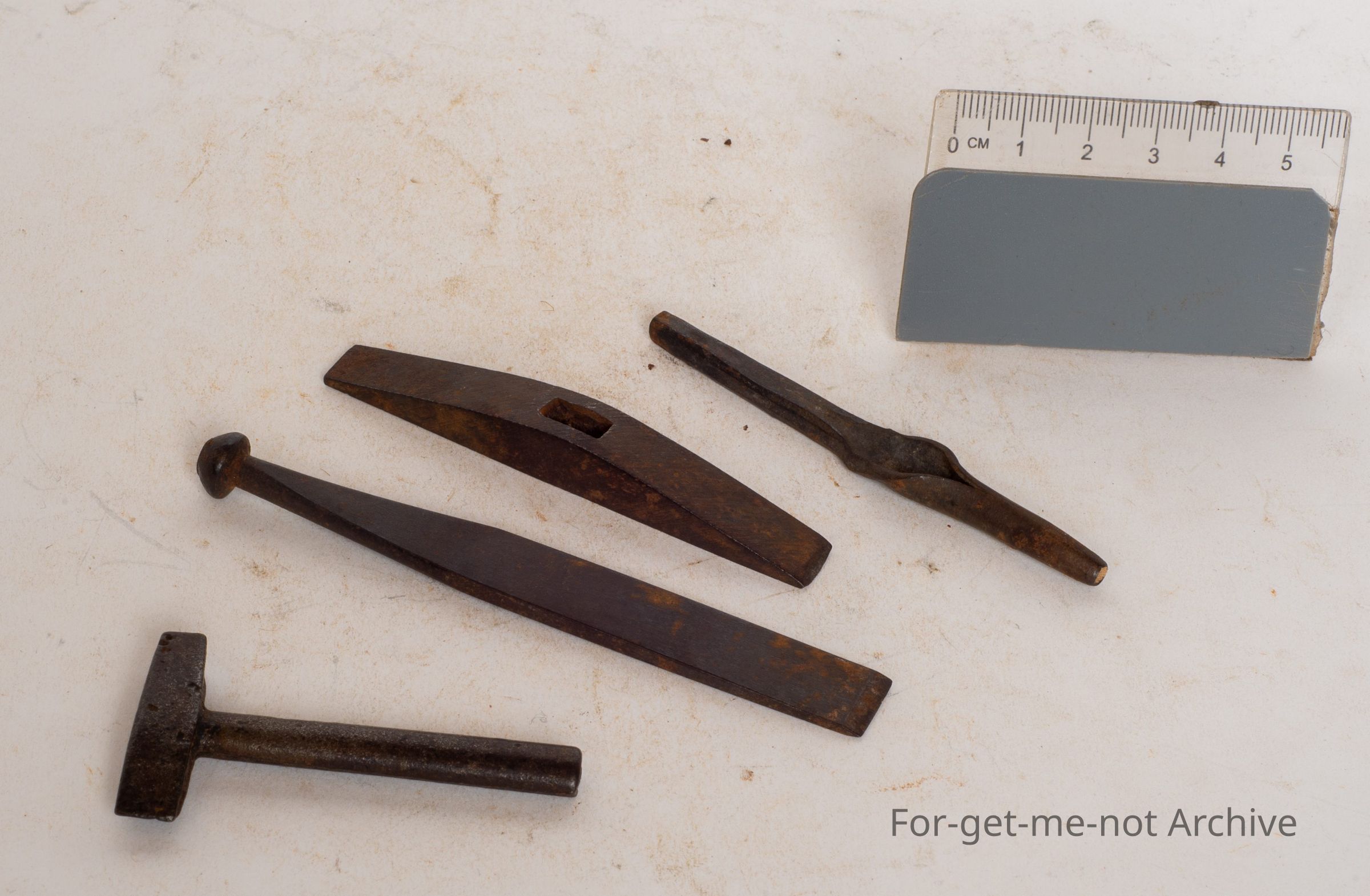 This is a group of 4 small tools like a chisel, a reamer, a hammer, and a pick head. Unknown purposes look well made.