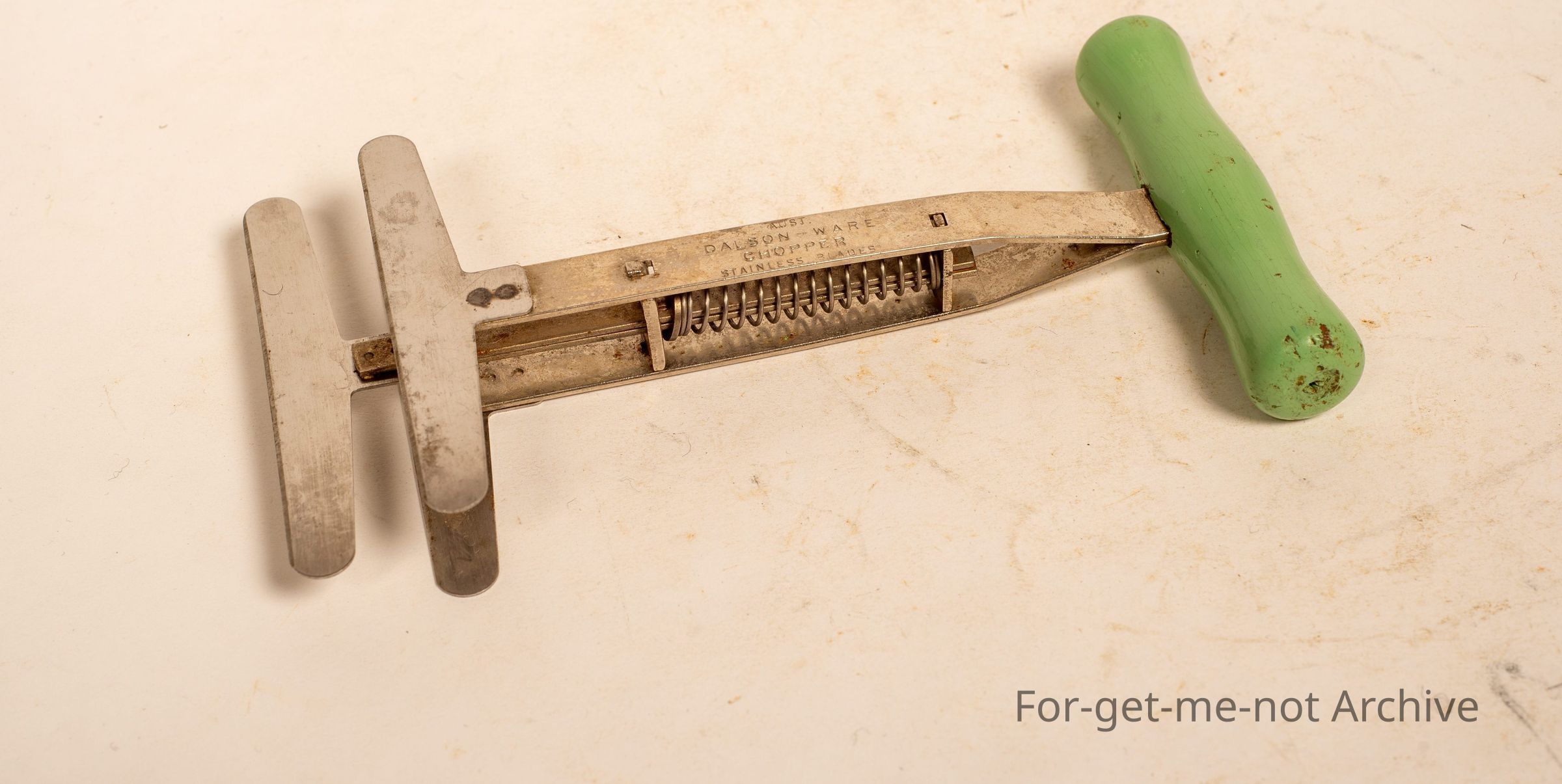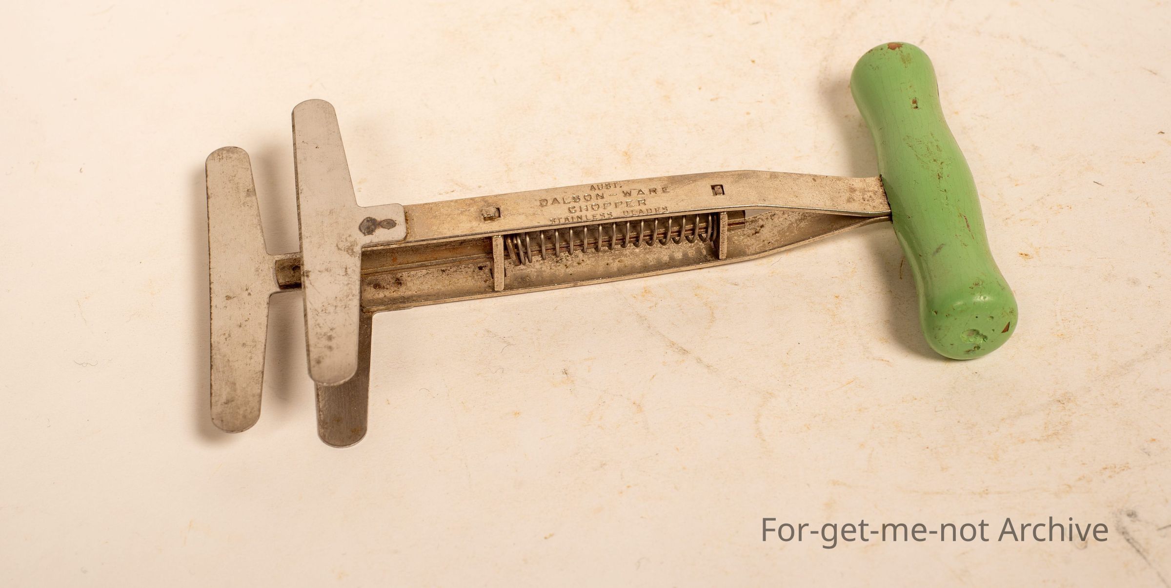 Wooden handle called Delson Ware Chopper, stainless blades made in Australia. Spring operated. Very good nick.