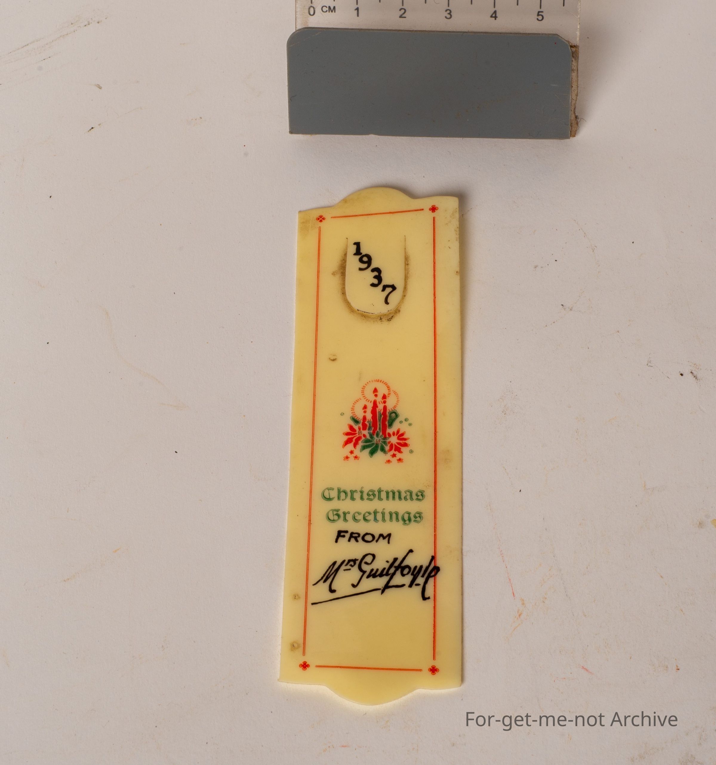 This is a beautiful little plastic, Christmas greetings piece dated 1937. Christmas greetings from missus Guilfoyle,