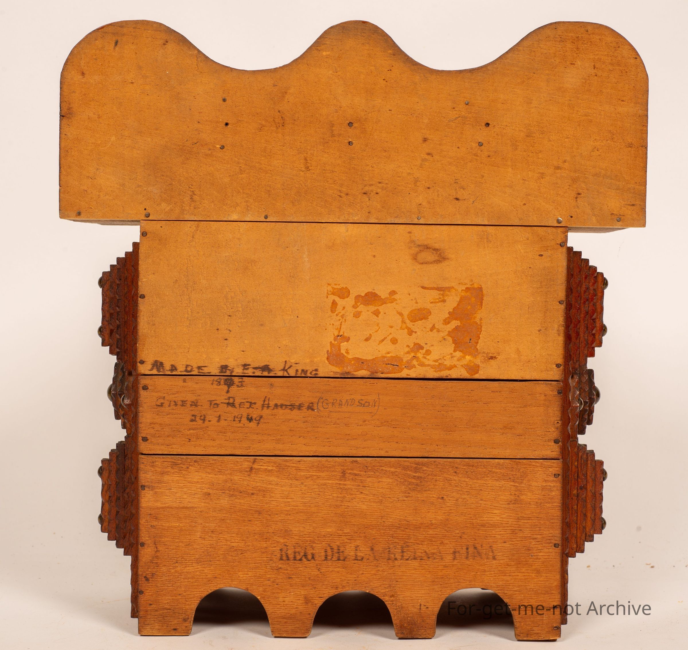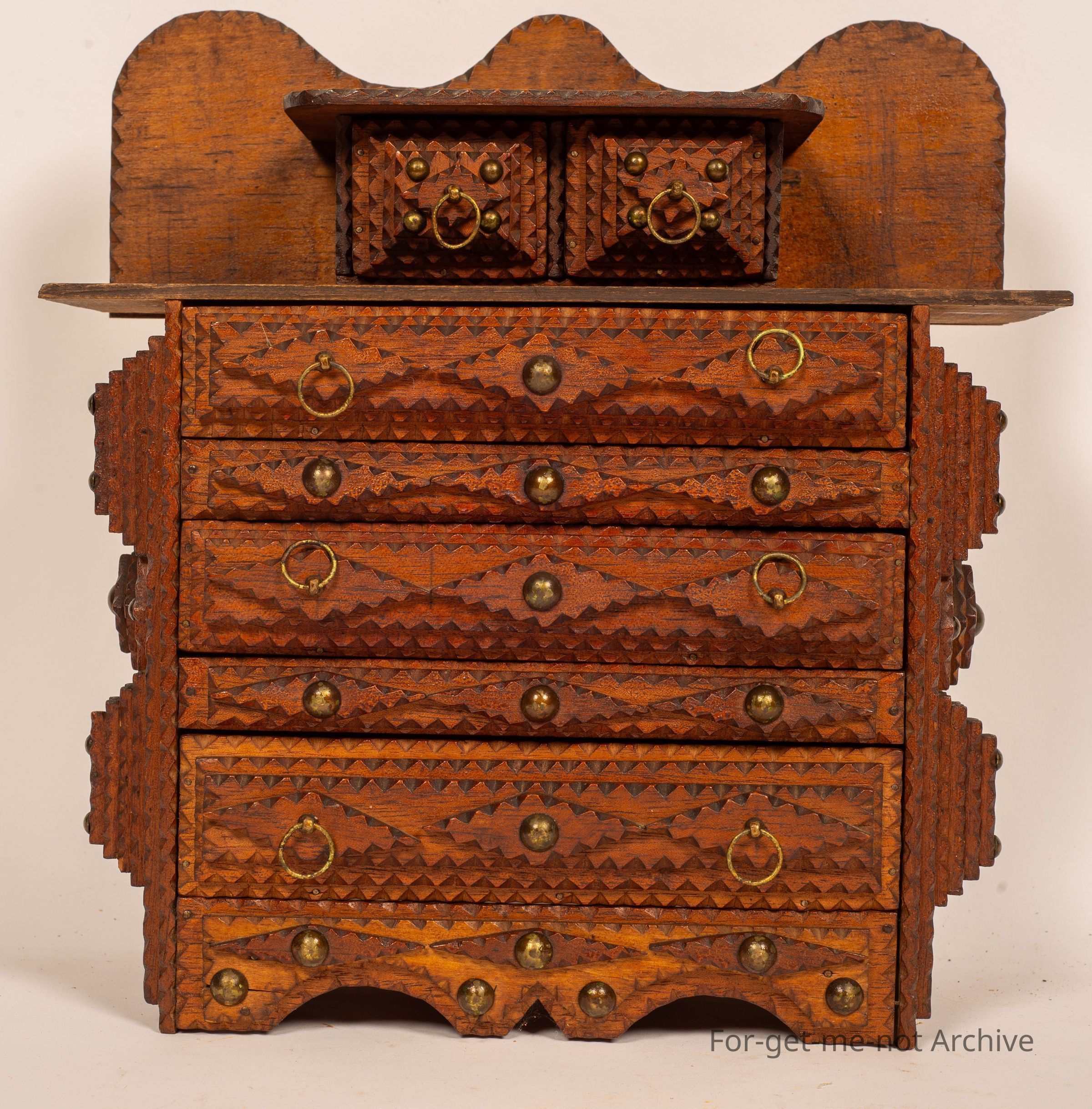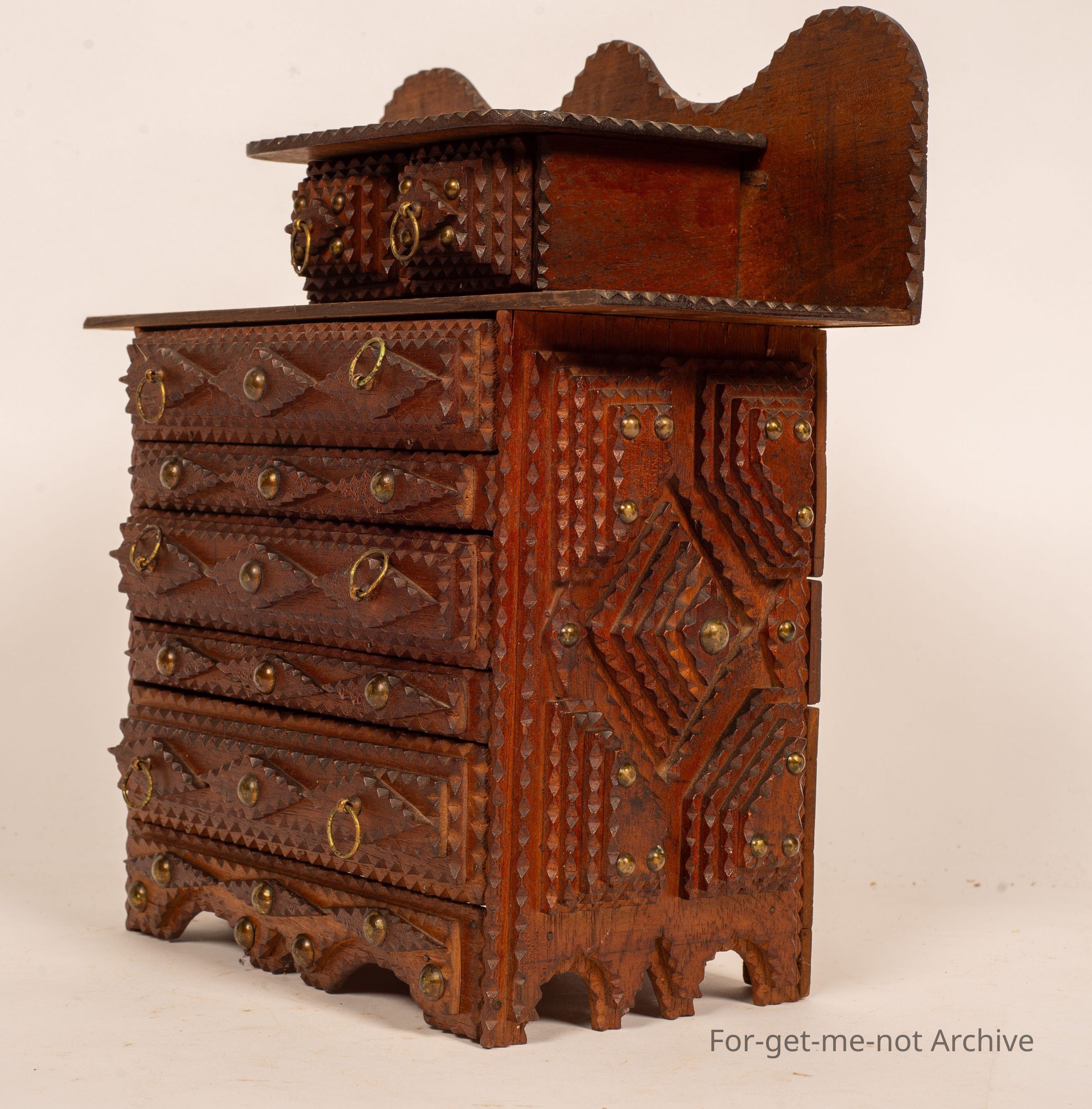 Is a small chest of drawers of tramp art. These pieces were made of discarded cigar boxes with layered carving, sometimes in layers of 1 to 6 or 8. This one has 3 drawers right across with 2, very small drawers on the top layer. A wonderful example of this craft, All the trays are made of cigar boxes. . I should mention. This particular one is signed on the back, made by the urn, might be, king 18/93. Given to Rex Hadza, a grandson, in 1949. It's quite rare to see any particulars like that so that adds a wonderful aspect to this one. Every part of it is made from the scar box.Collection