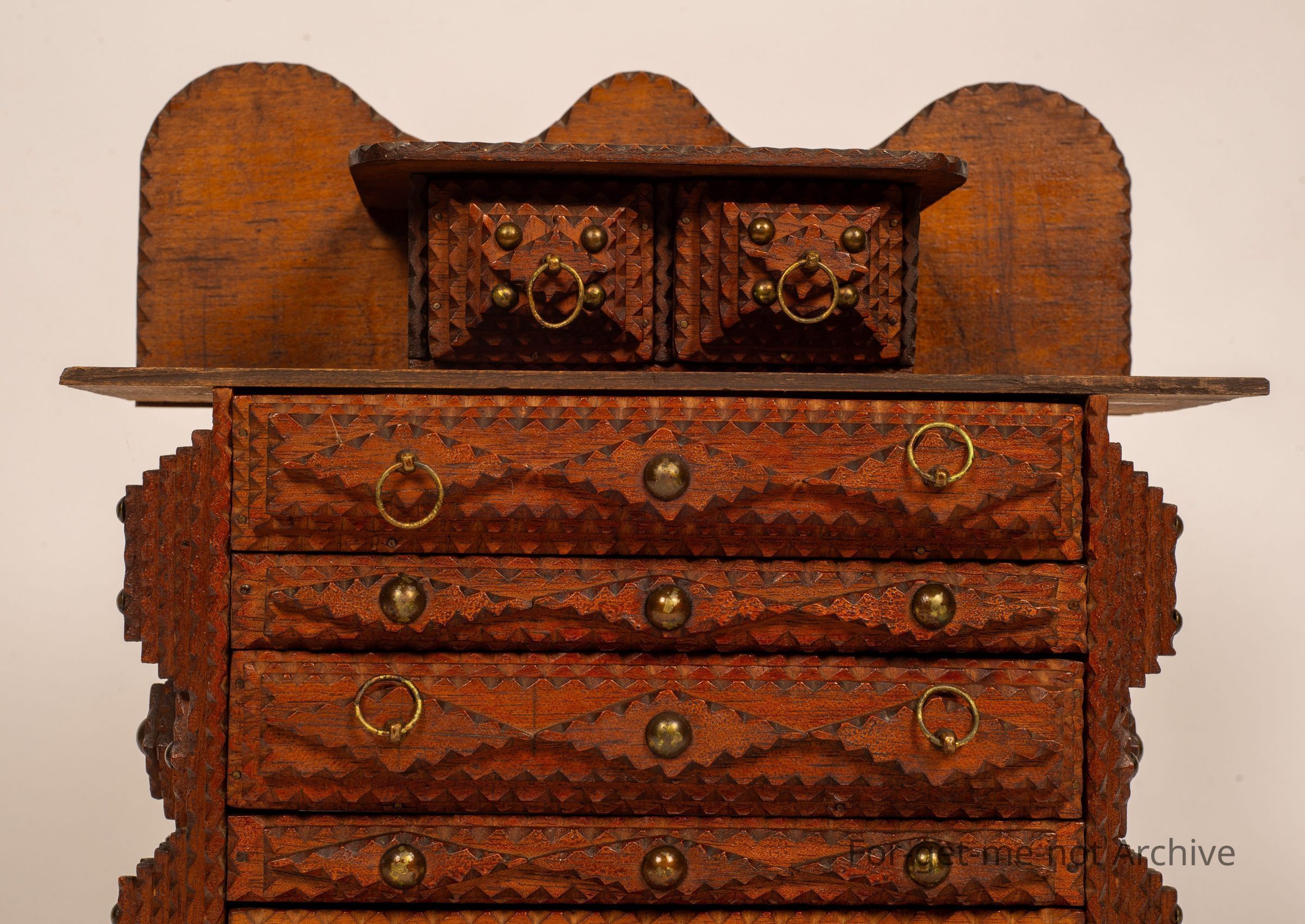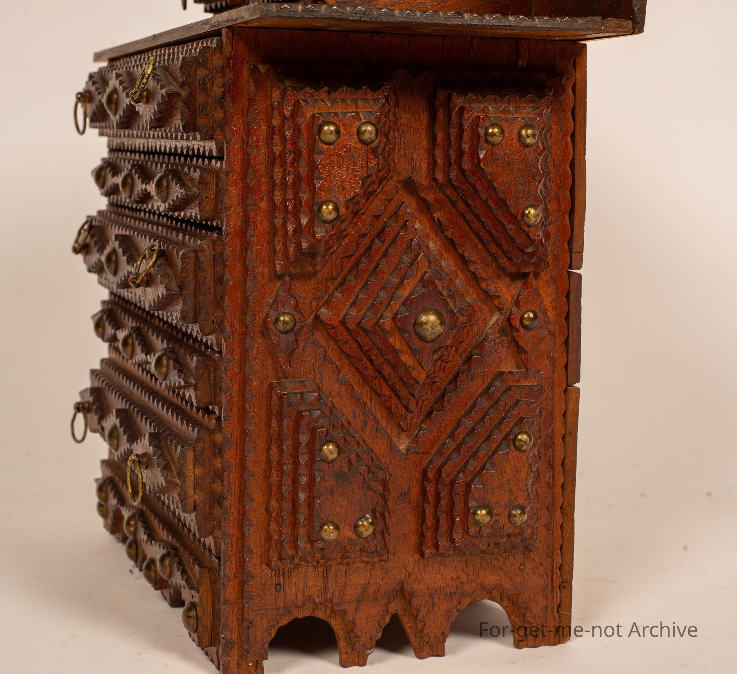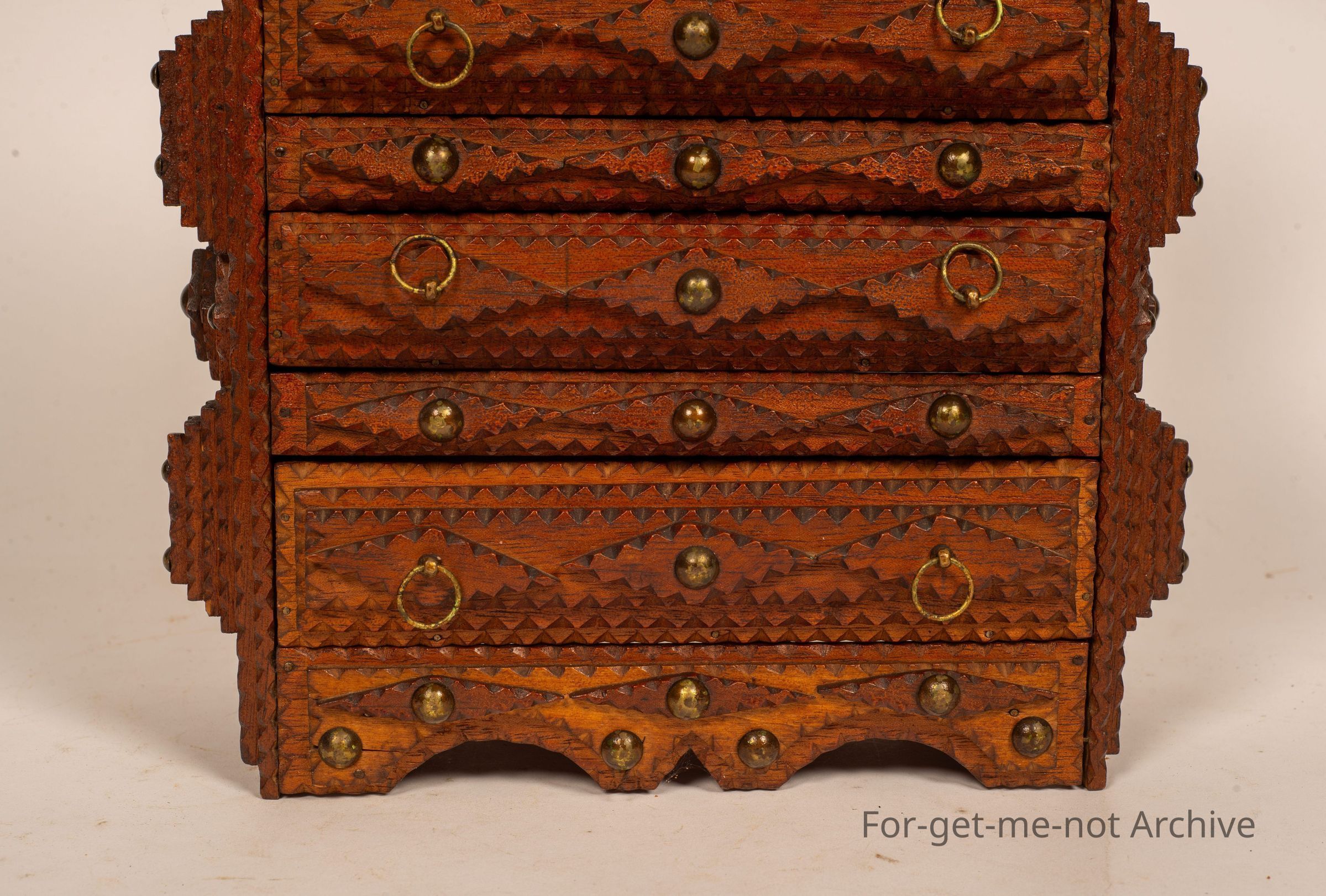 Is a small chest of drawers of tramp art. These pieces were made of discarded cigar boxes with layered carving, sometimes in layers of 1 to 6 or 8. This one has 3 drawers right across with 2, very small drawers on the top layer. A wonderful example of this craft, All the trays are made of cigar boxes. . I should mention. This particular one is signed on the back, made by the urn, might be, king 18/93. Given to Rex Hadza, a grandson, in 1949. It's quite rare to see any particulars like that so that adds a wonderful aspect to this one. Every part of it is made from the scar box.Collection