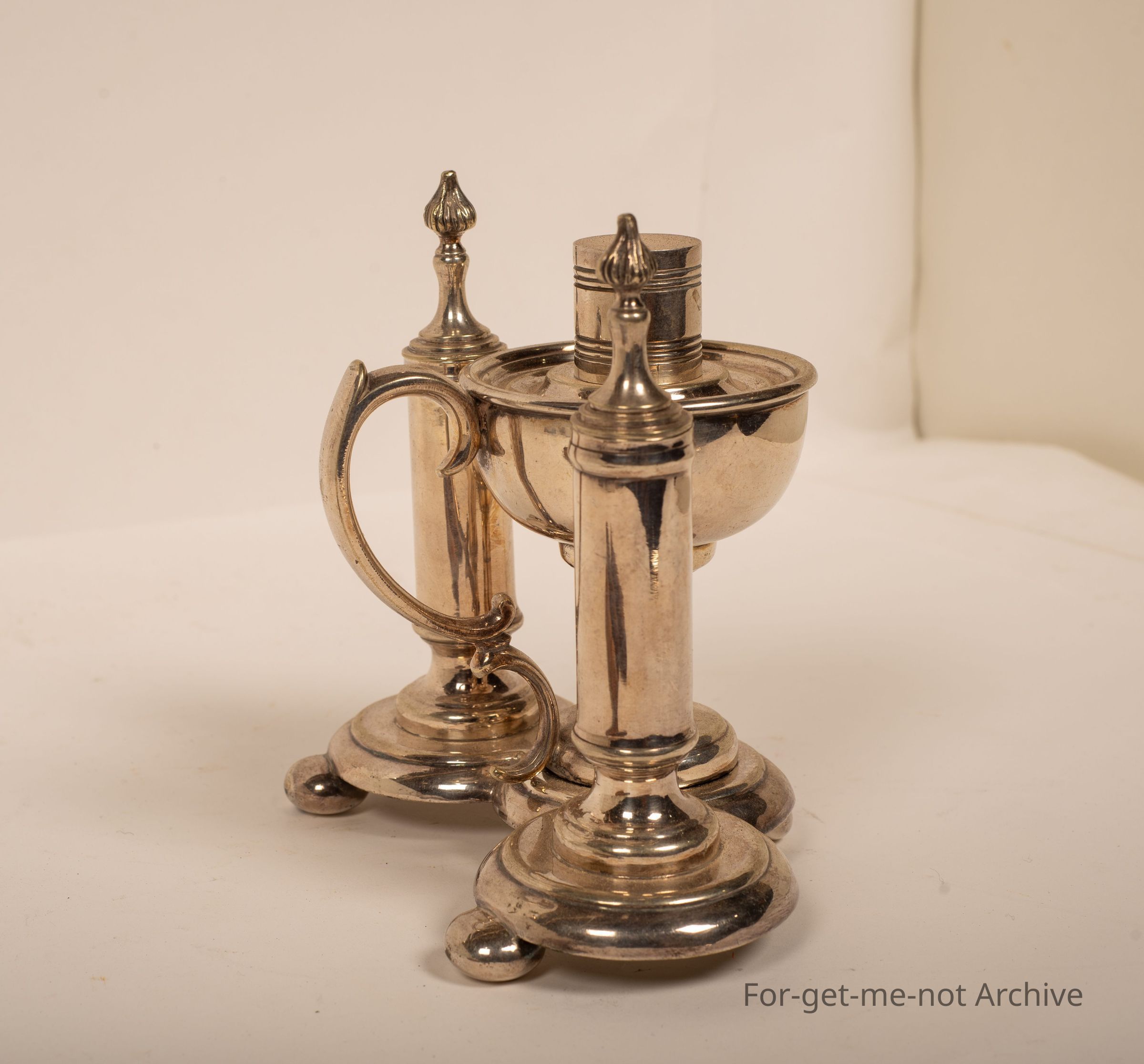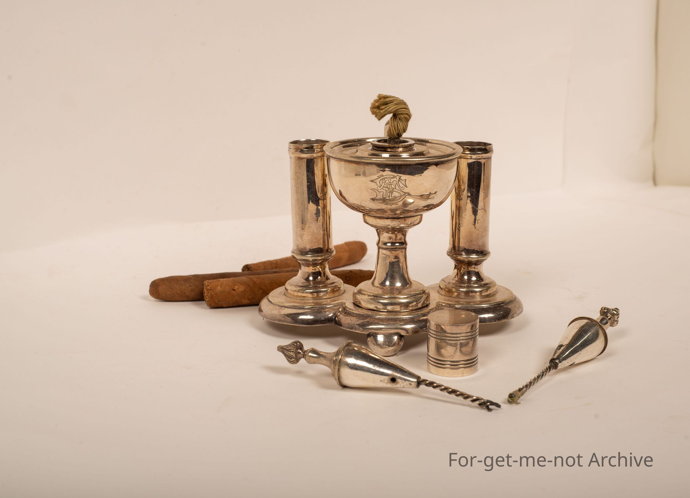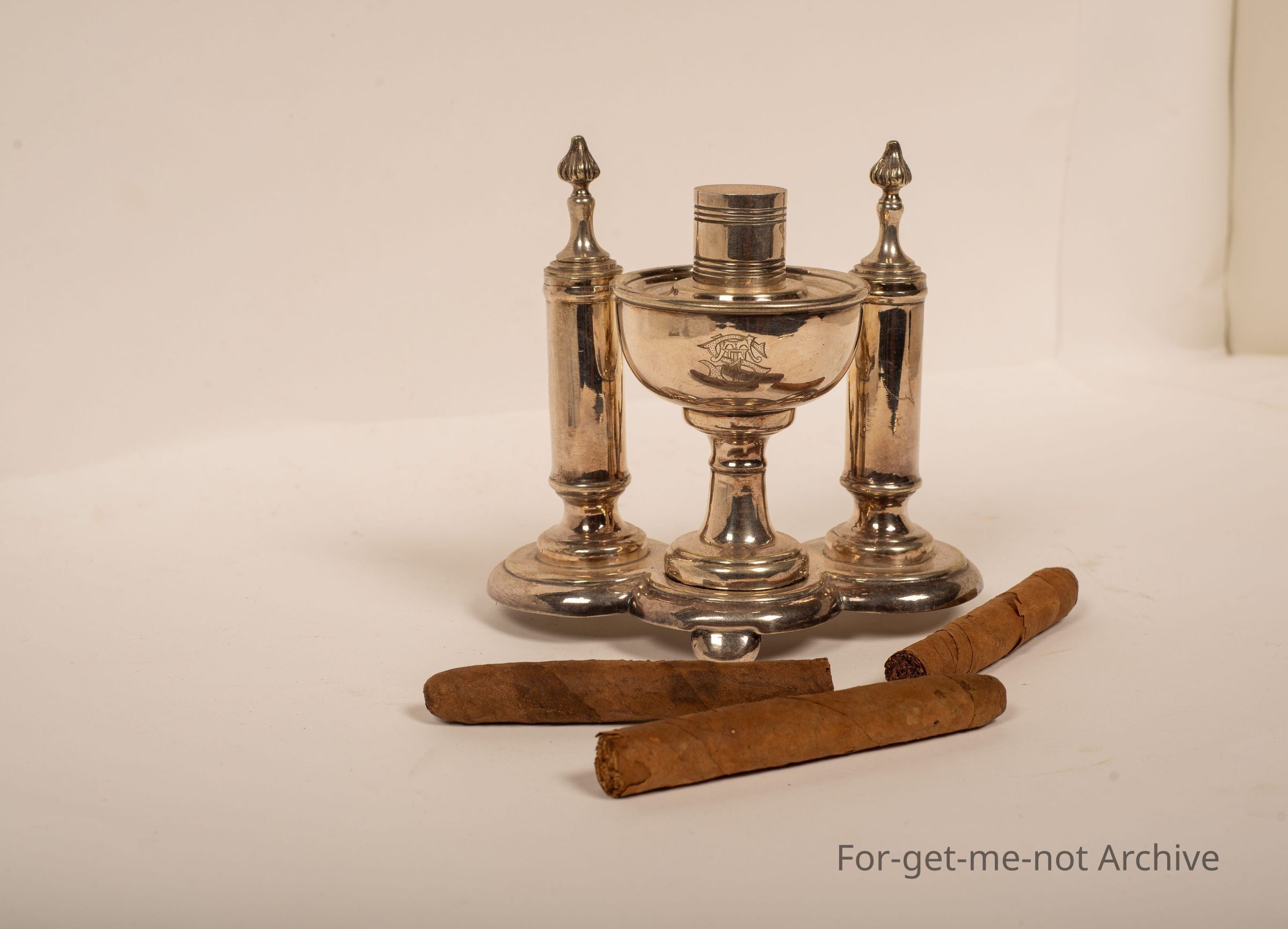 Is a cigar lighter kit probably from a men's club. Very ornate, beautiful silver plating with 3 Havana Cigars to sit on the stands.
