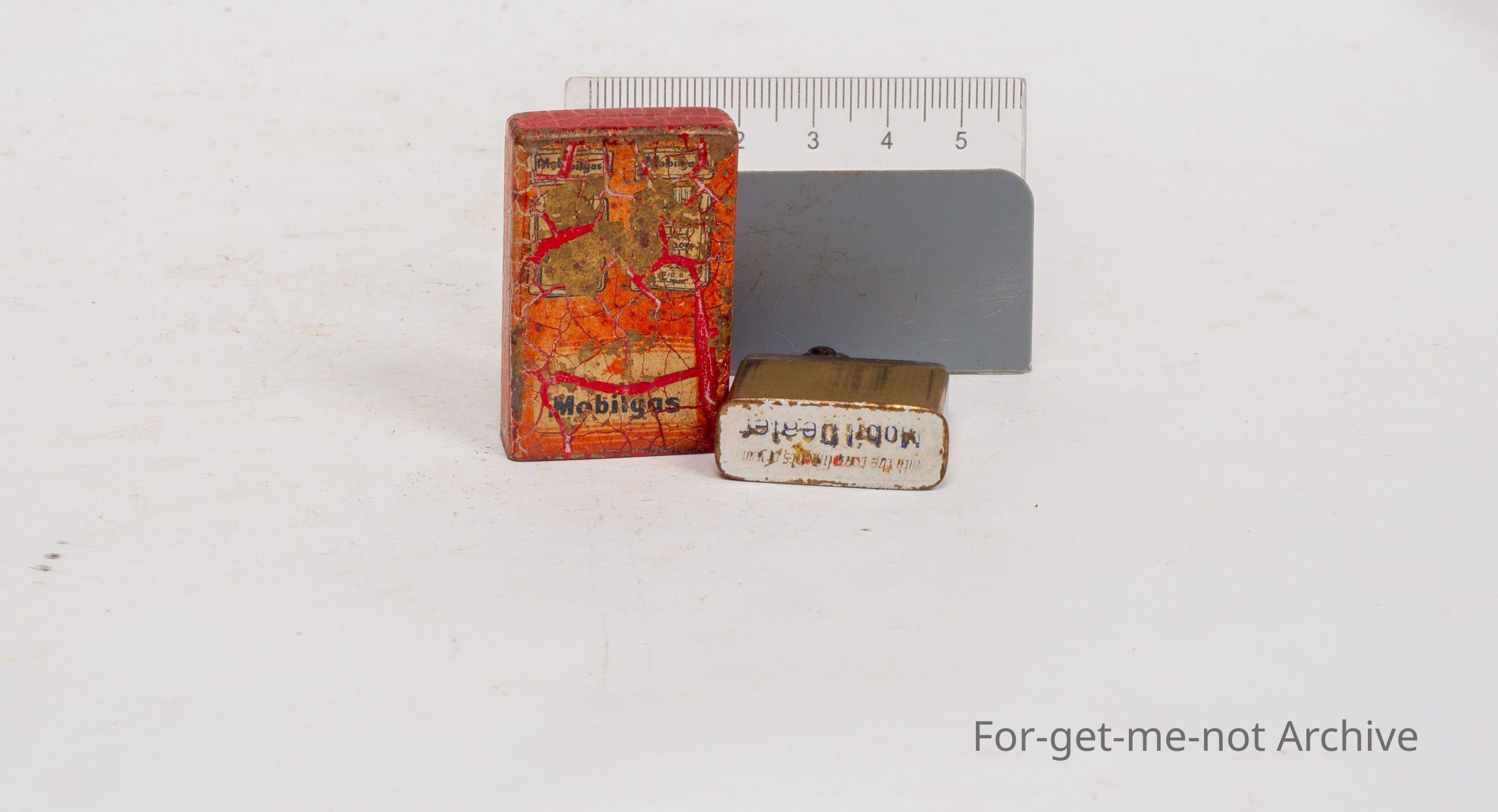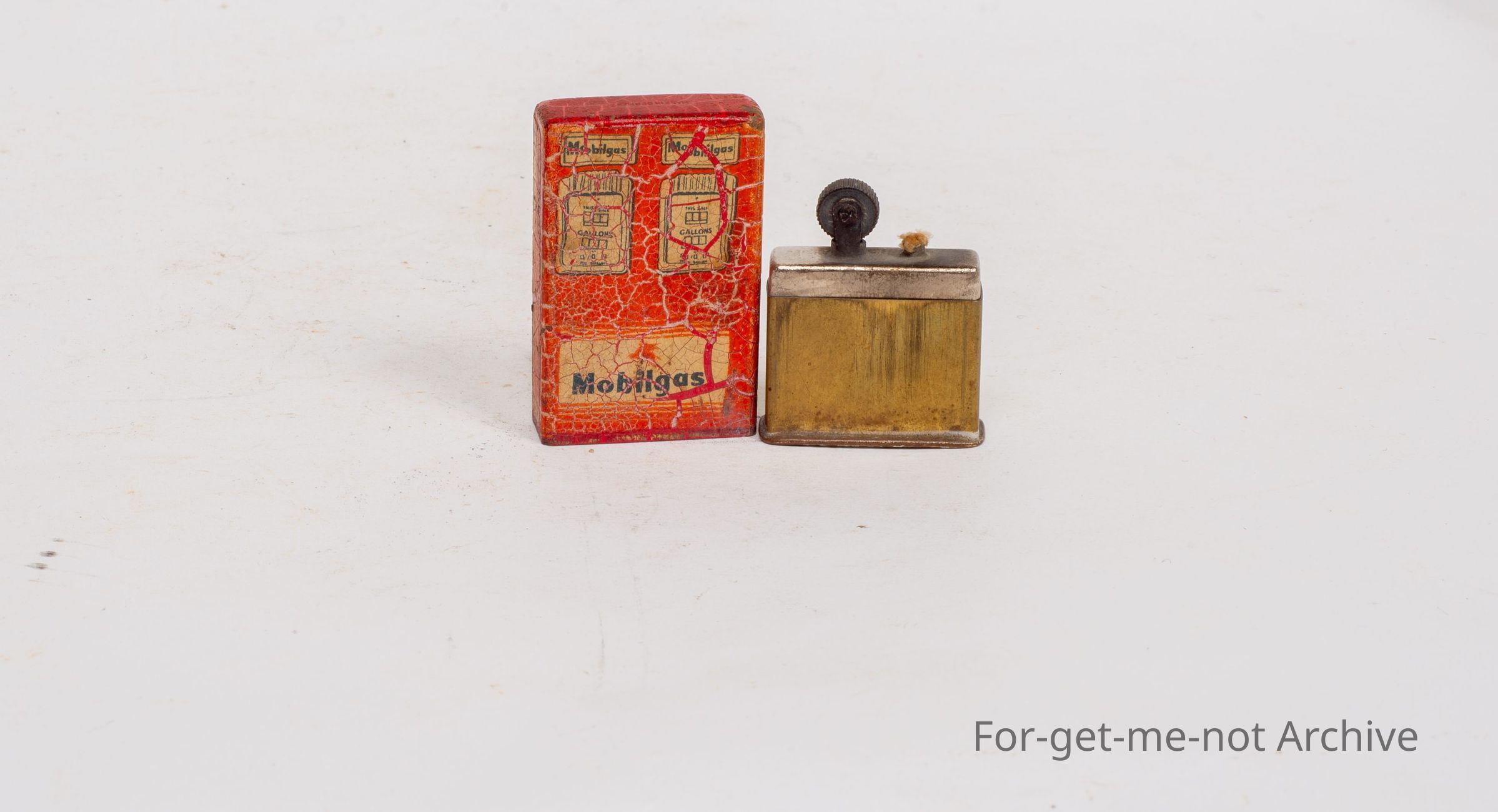 This is a cigarette lighter from Mobil Gas. The cover knocked around a bit. The cigarette lighter is intact with stamped on the bottom, mobile dealer with maybe the name above that but can't read it.Collection