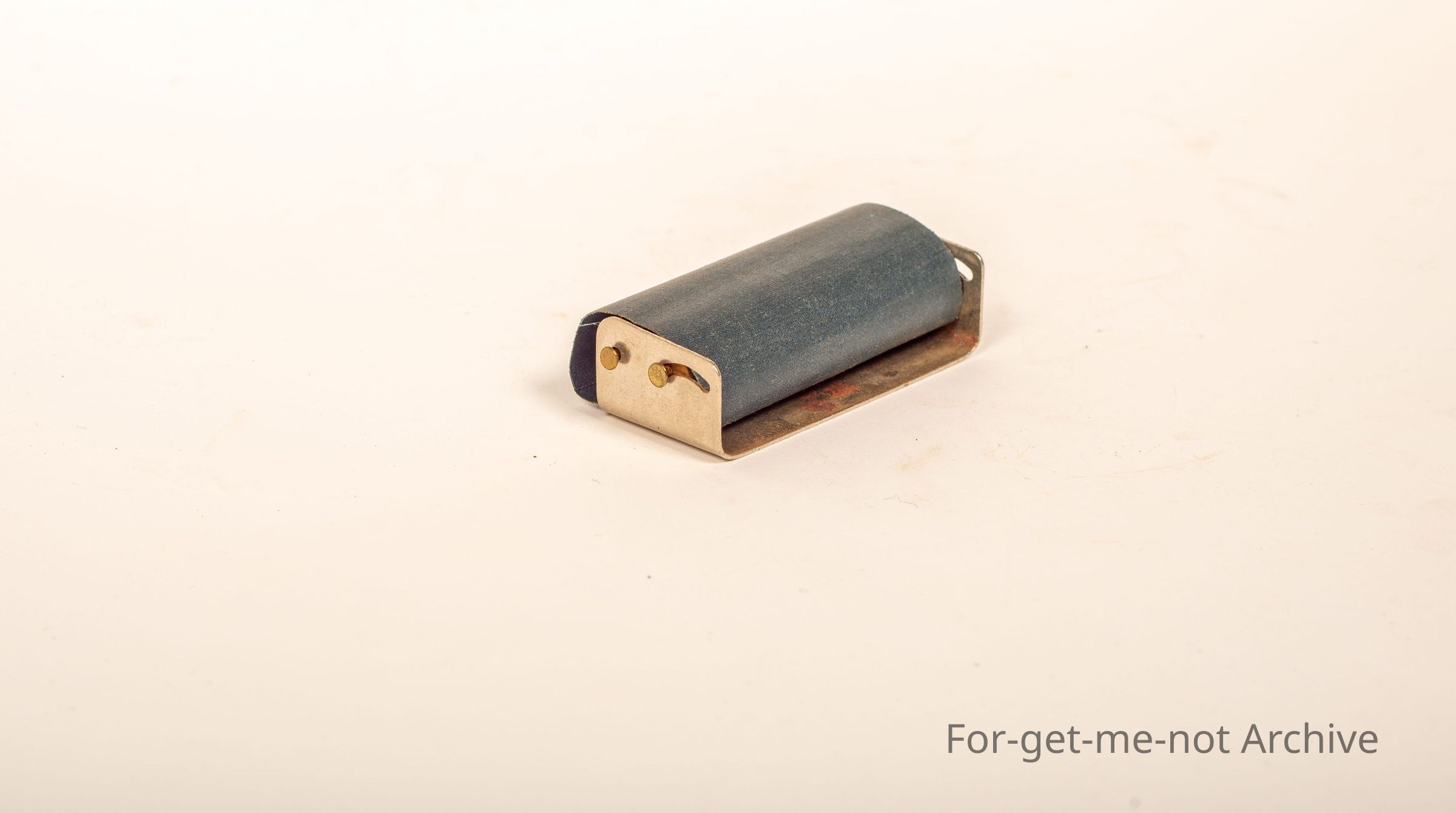 A metal cigarette roller with a canvas type railing part. Doesn't appear to have any make or name,