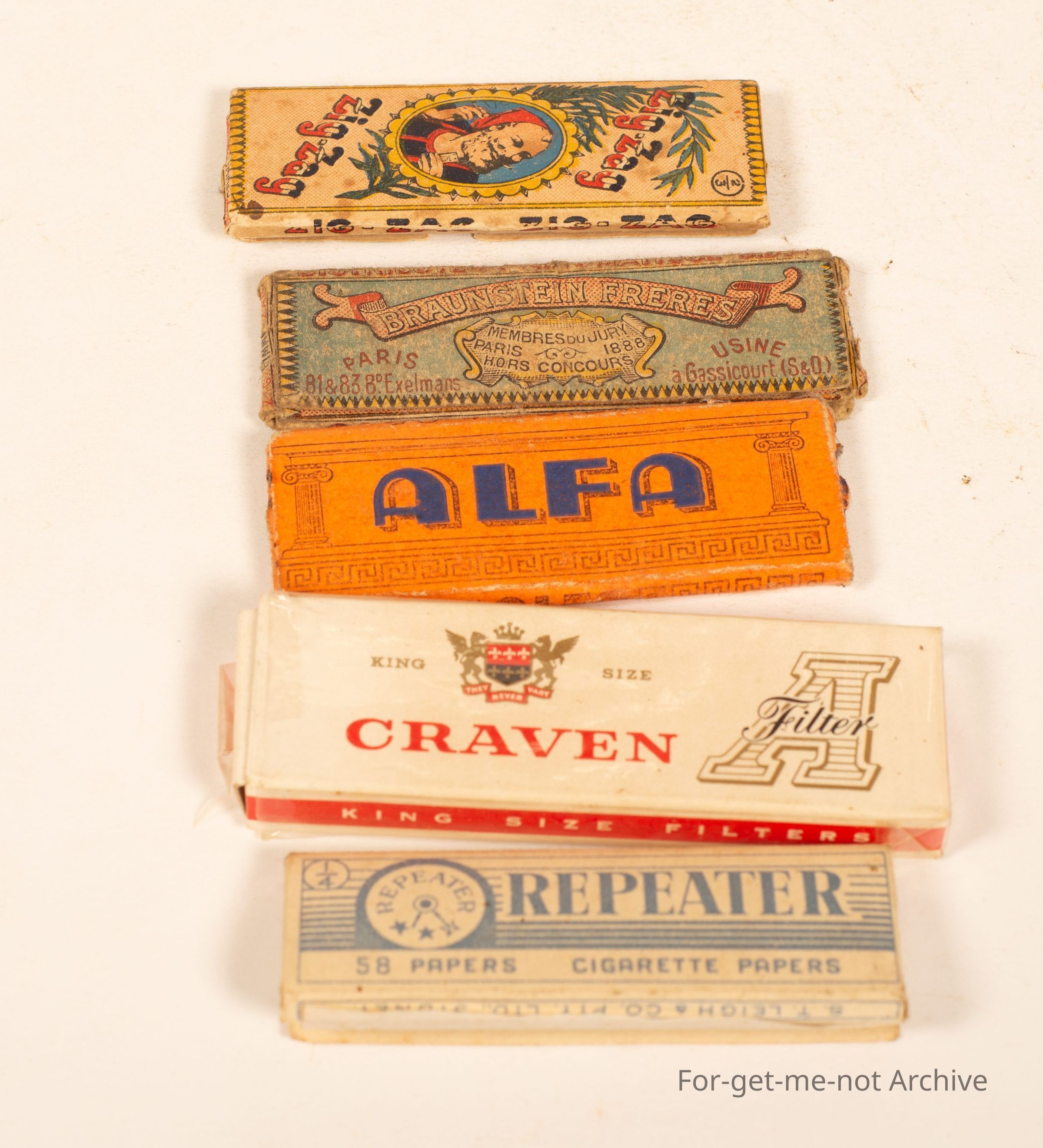Another group of 5 packets of cigarette rollies consisting of Zig Zag, Craven A, Alpha, Ferreze, and Repeater.