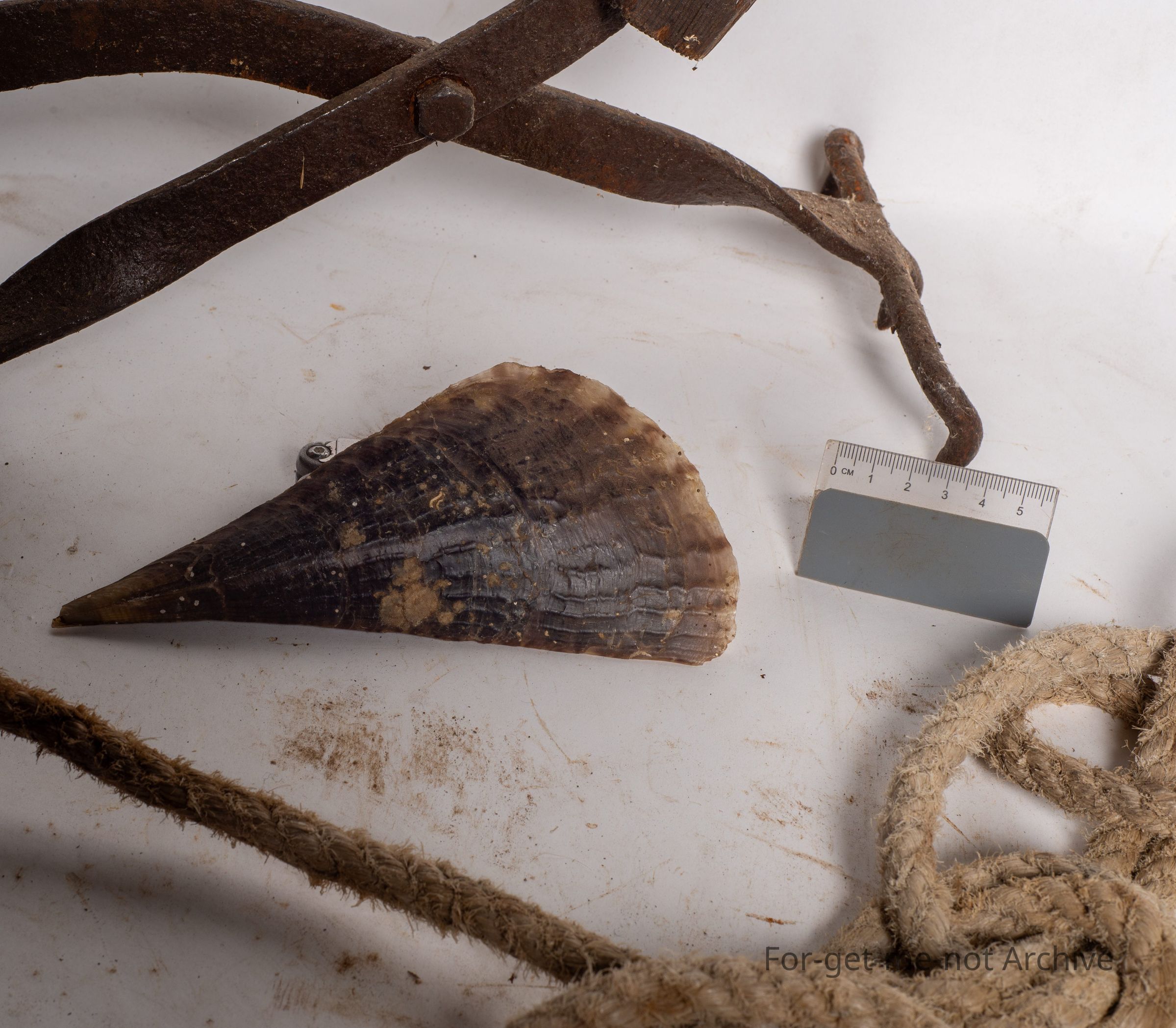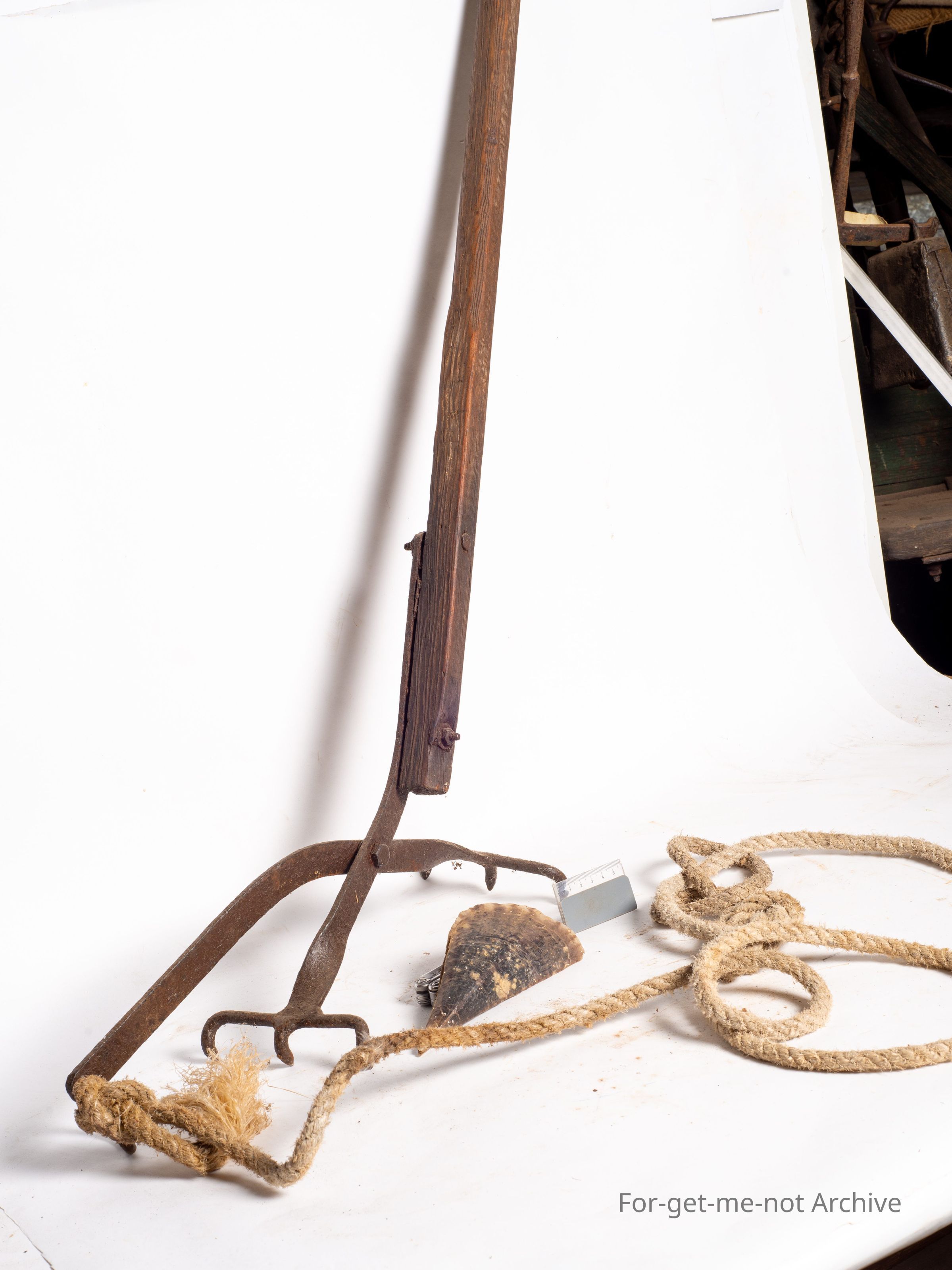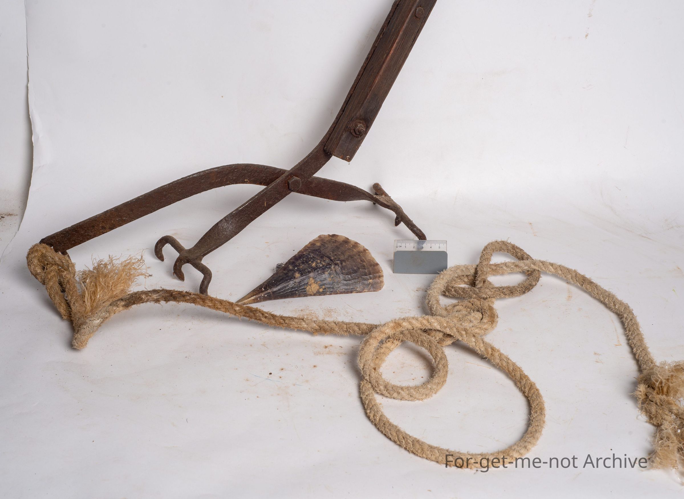 This is the clamp used for getting razor fish out of the seagrass beds in South Australia. Once prolific. Today, very hard to find. Almost gone. The unfortunate aspect, these, razor fish shells, they were considered to be excellent bait for catching other species of fish. And because of the over harvesting of them, they are no longer prolific at all. Value of the clamp with the rope that operated the clampCollection