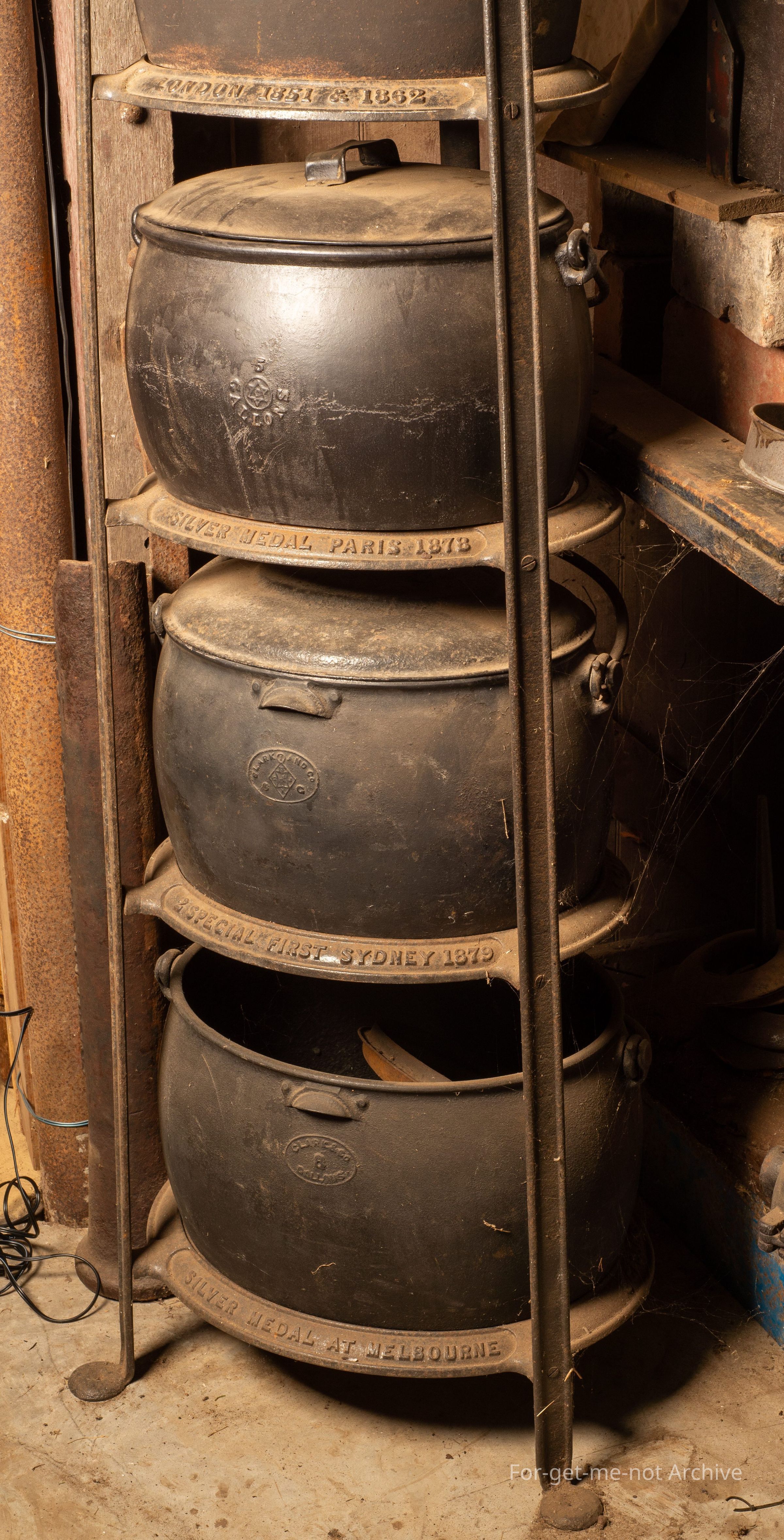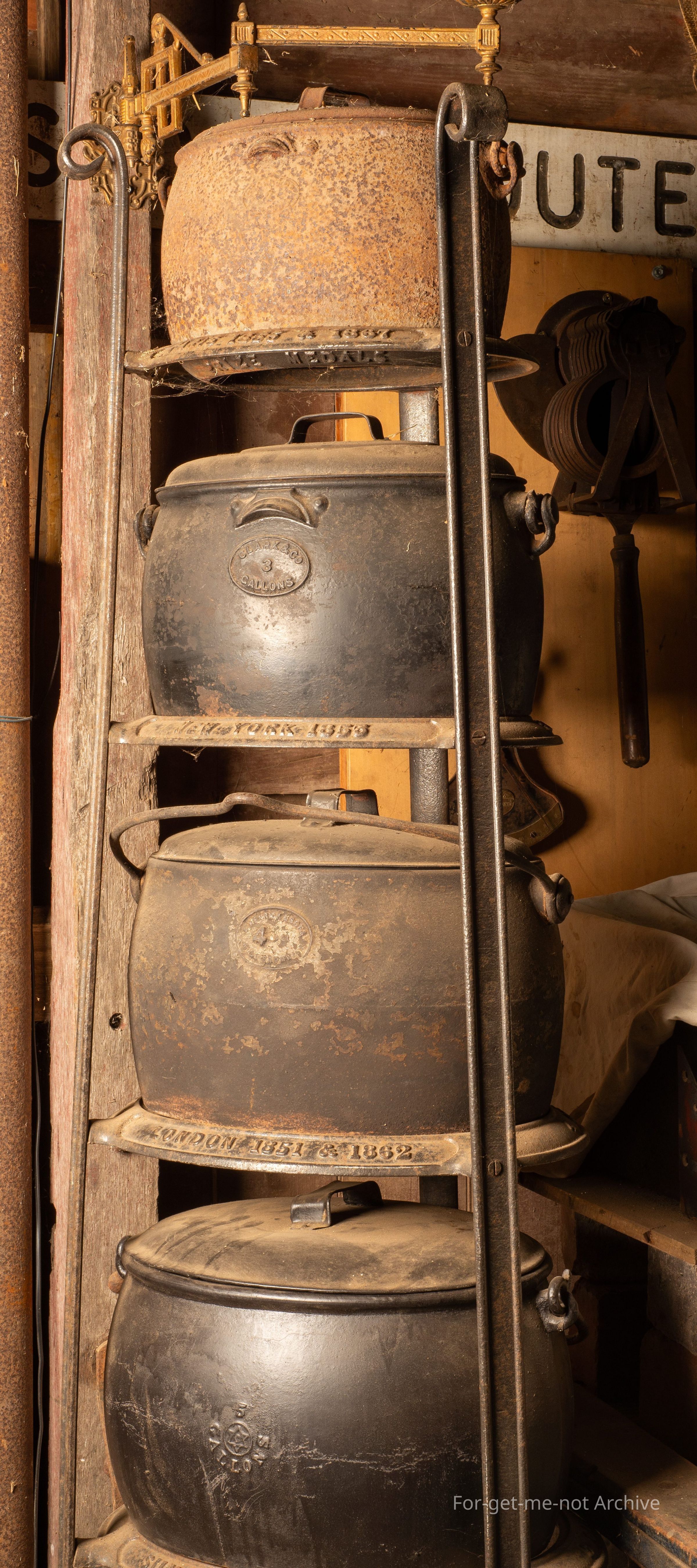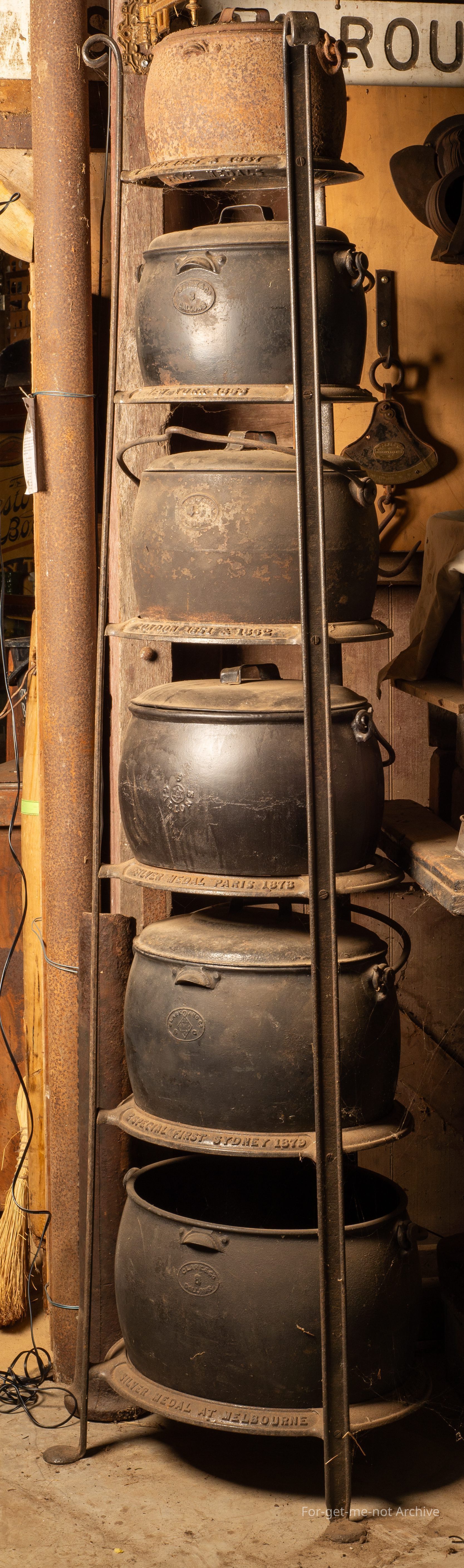 Description, this is a boiler stand, not a saucepan stand, going from 8 gallon to 2 gallon at the top. 6 tiers altogether. Each tier has, in the embossed in the casting descriptions or information from each international World Fair. This goes from Melbourne, Sydney, Paris, London, New York, Christchurch. Beautiful piece, very hard to find. This has, all the Clark boilers on it, with lids except 1.Collection