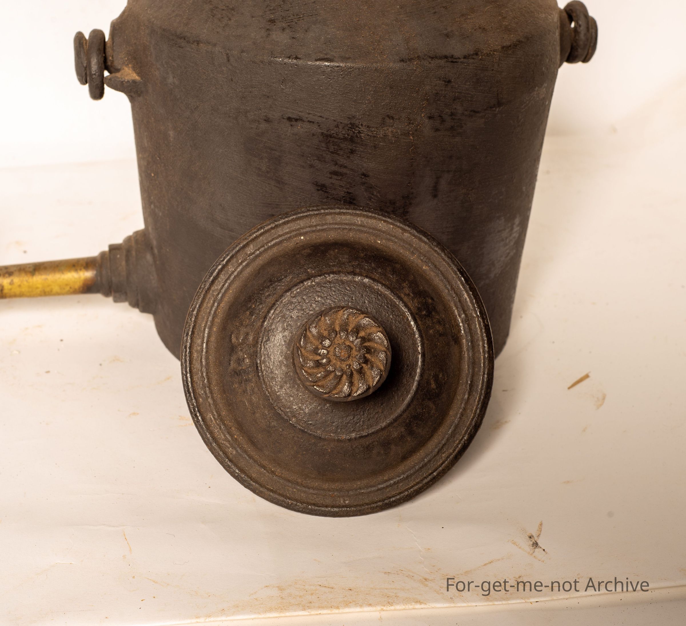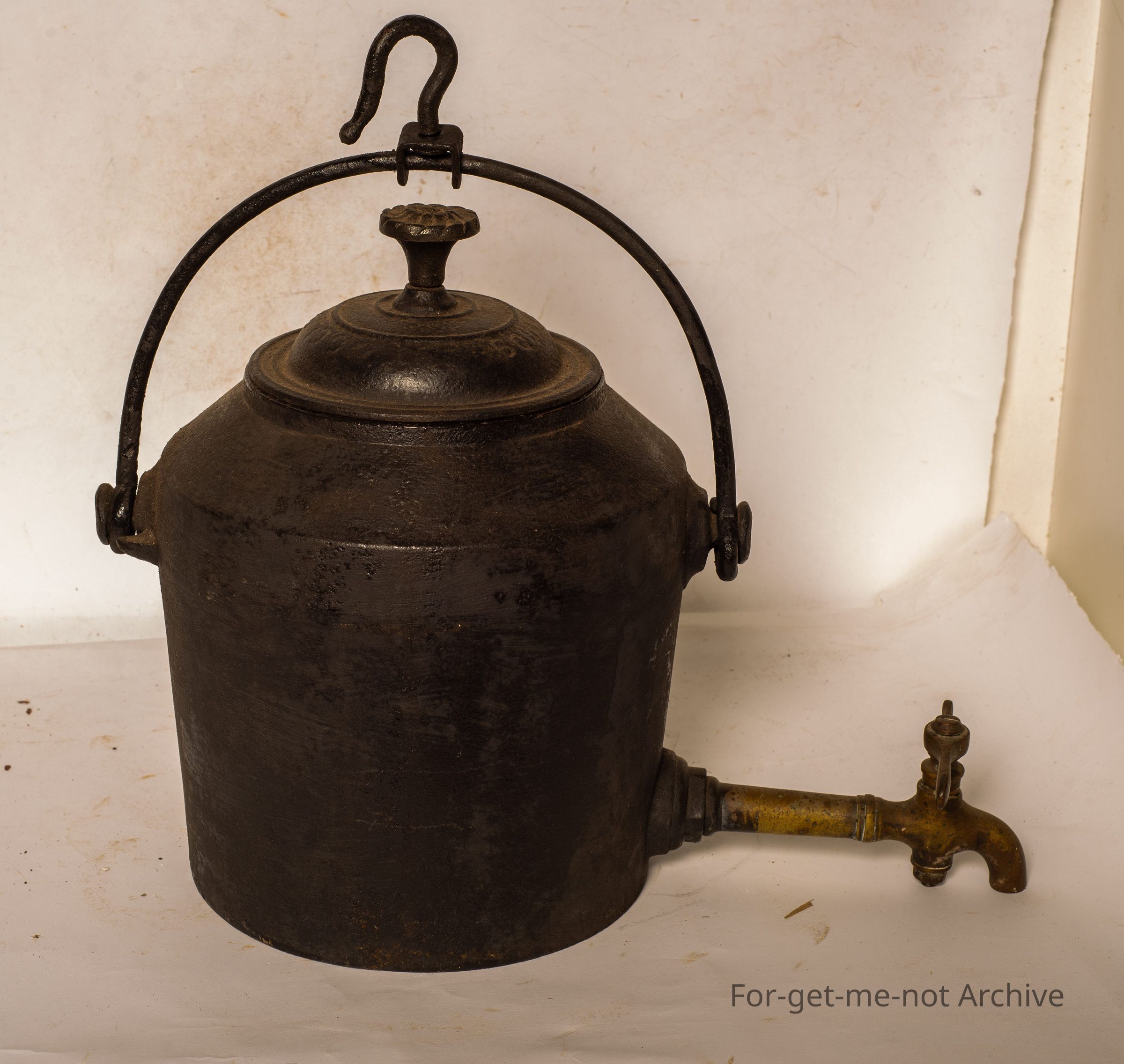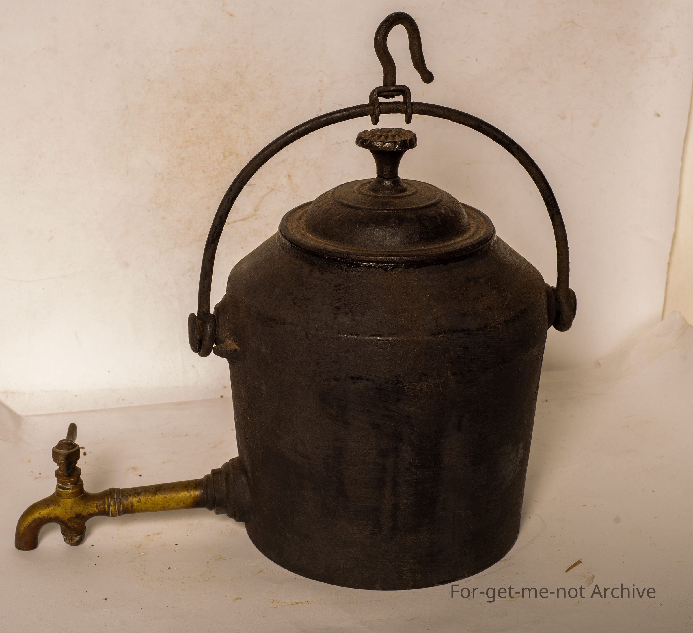 This is an item from the cast iron section. This is a cast iron water fountain. This is a hard to find 1 and a half gallon Clark water fountain with lid, original glass tap, and original hanger. Today, a very popular and sought after piece.Collection