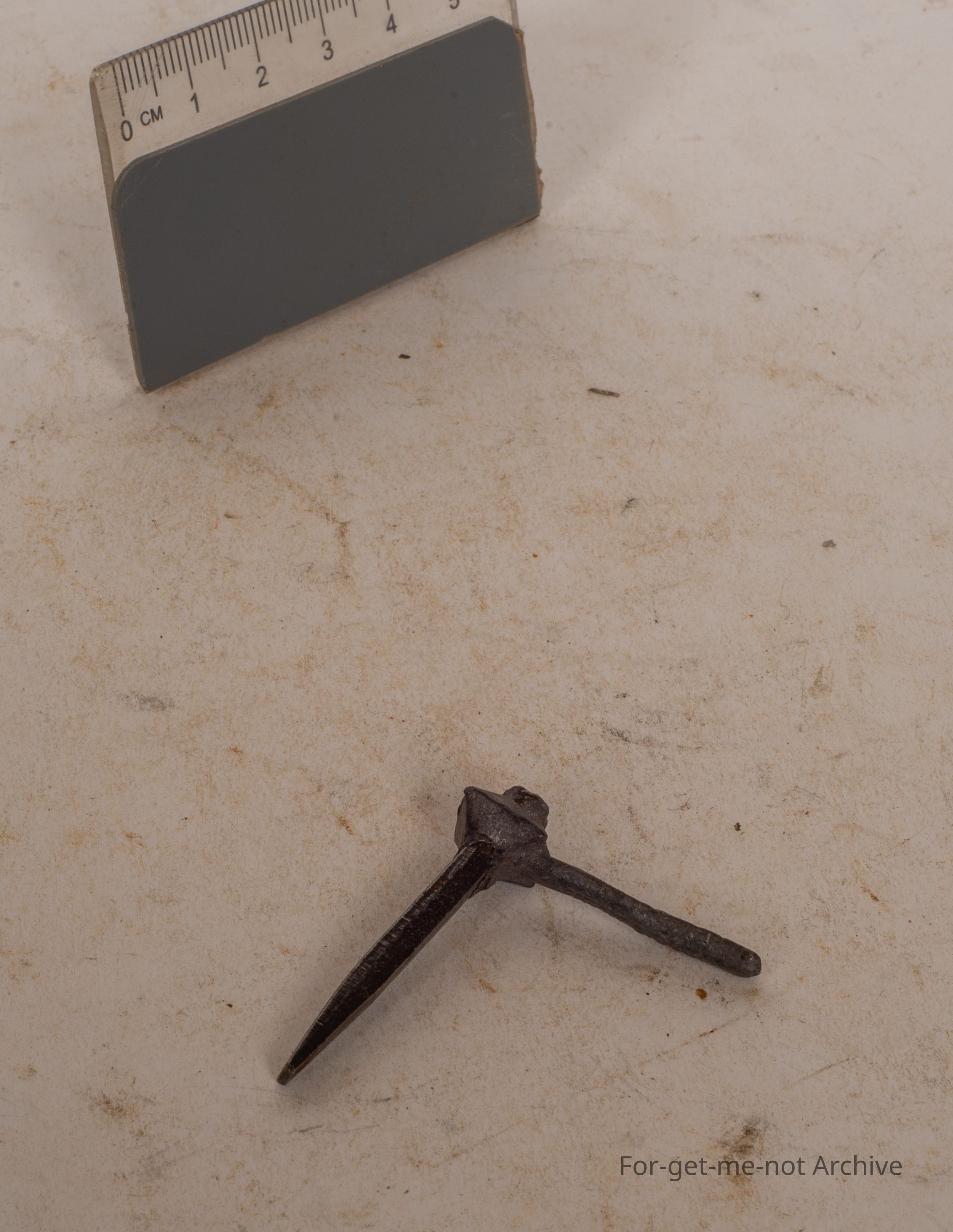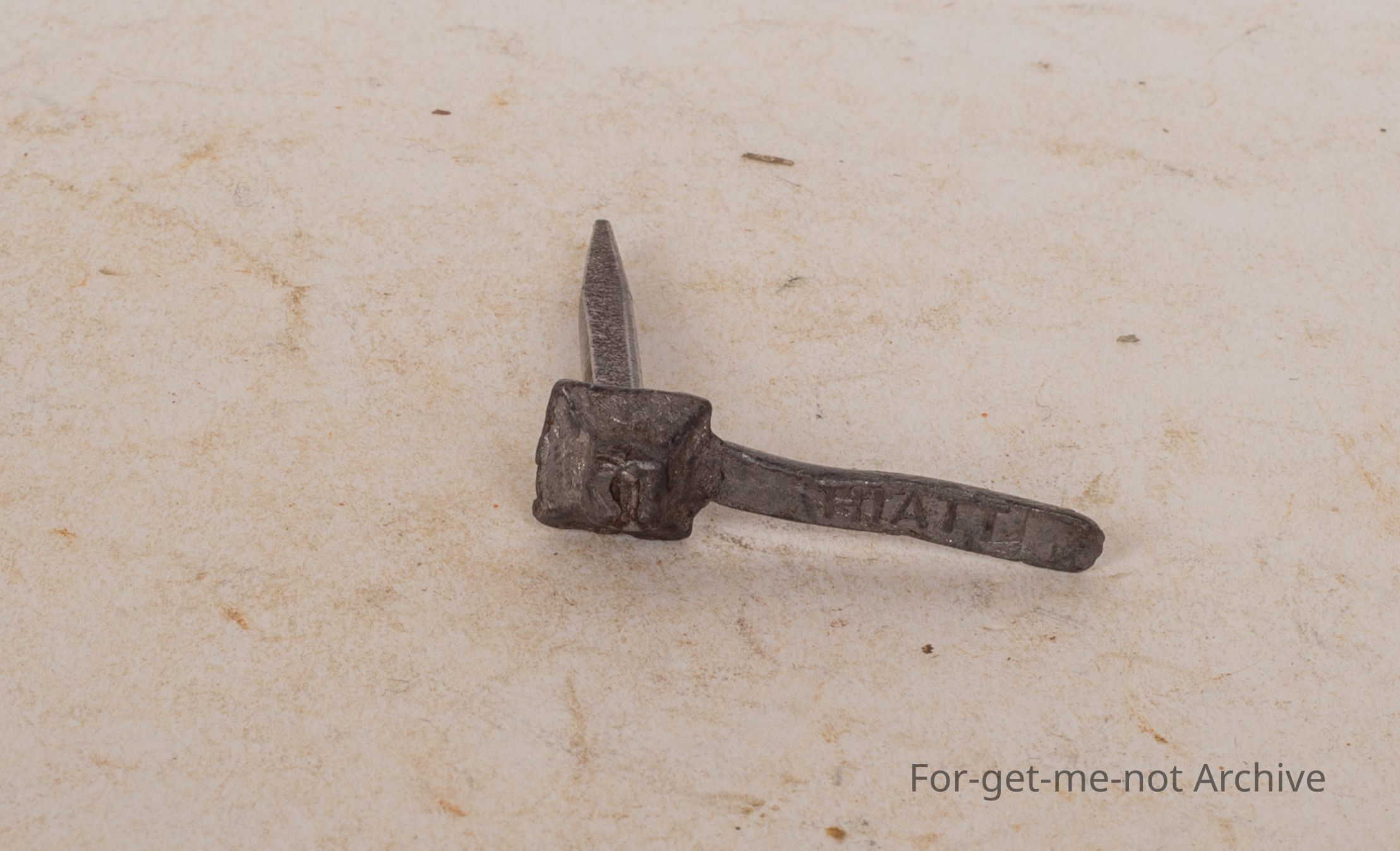 These nails are used to hold climbing plants onto masonry walls until they can hold themselves. The nails is hammered in and the lead tab is curled to hold plant , the soft lead allows plant growth. Stamped Hiatt The Hiatt company is renowned for making ferret muzzles and handcuffs.Collection