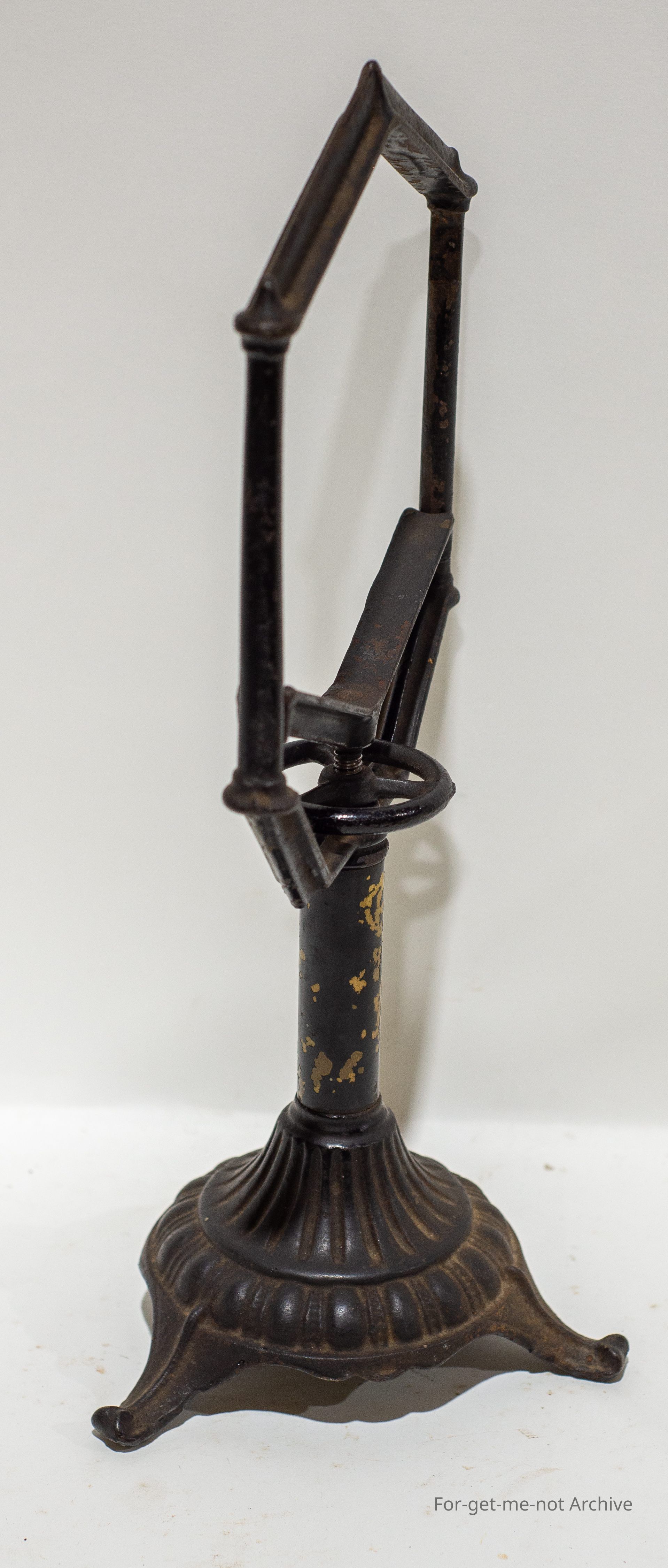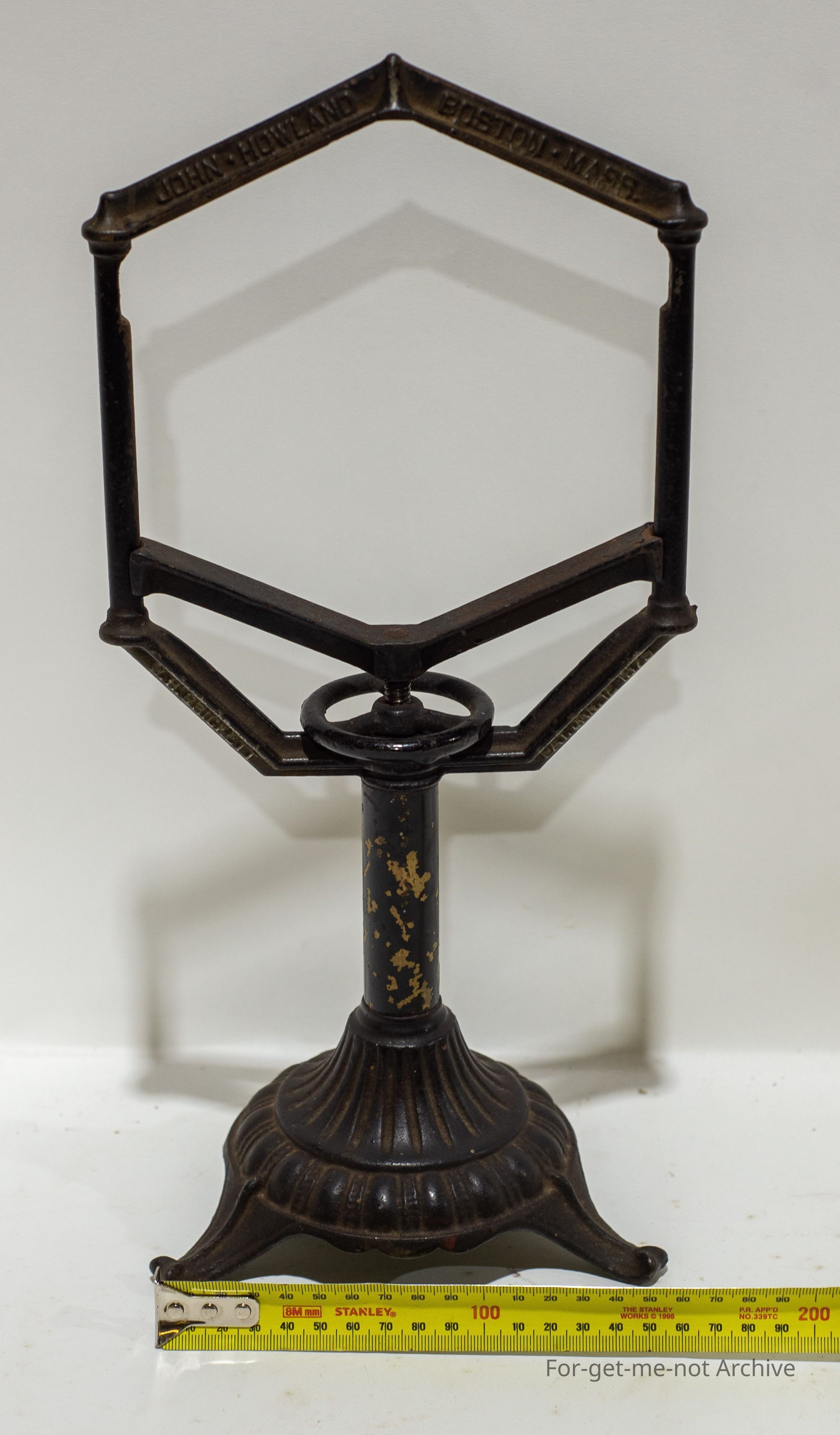 This is a clock makers stand, this device holds the clock firmly whilst the clockmaker works in the clock movement. 170mm high 180mm wide Has " John Howland, Boston, W.H. Crikett, patent 1879" on itemCollection