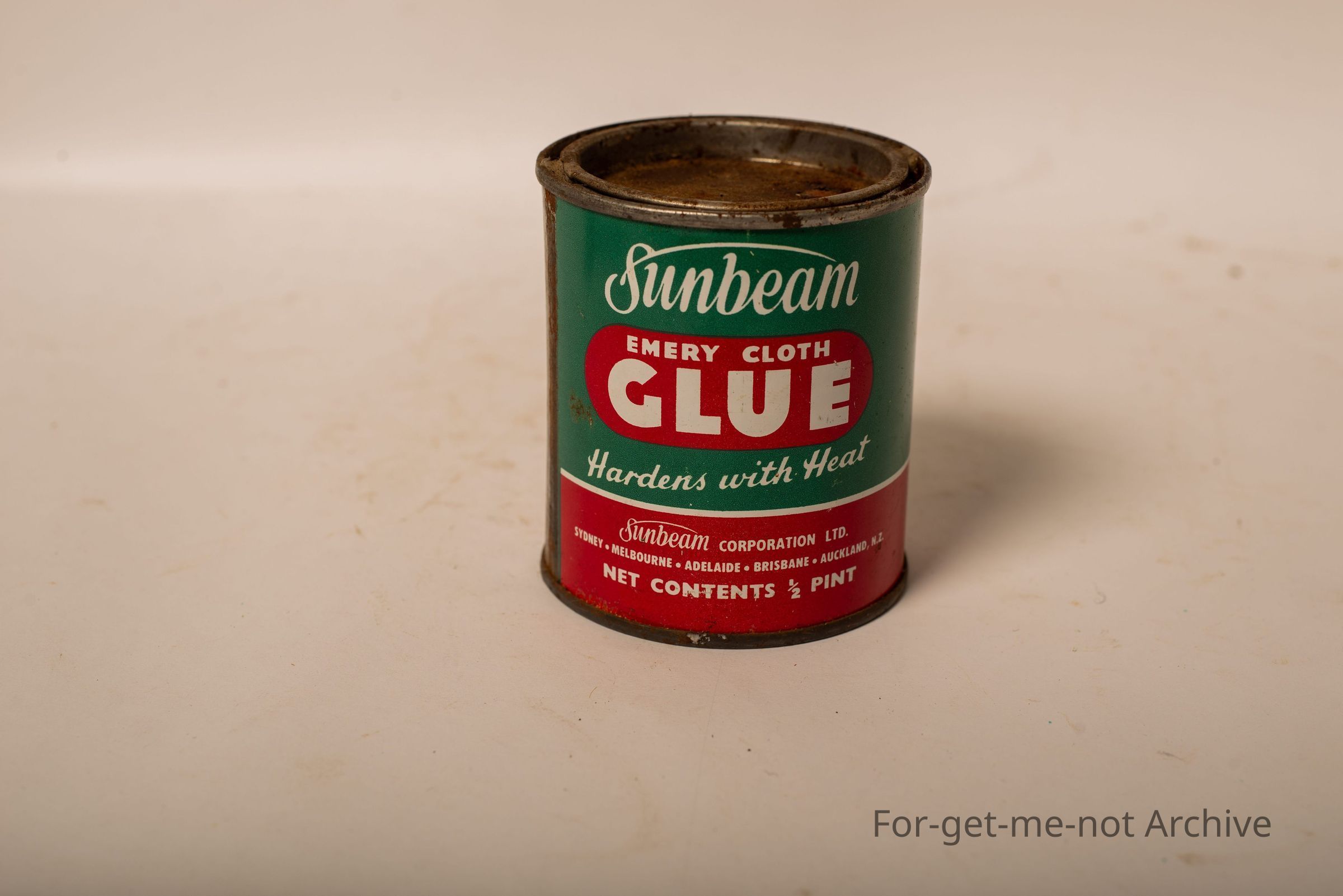 Is a tin of sunbeam emery cloth glue. Hardens with heat, contents. Half a pint. This tin is in good nick.