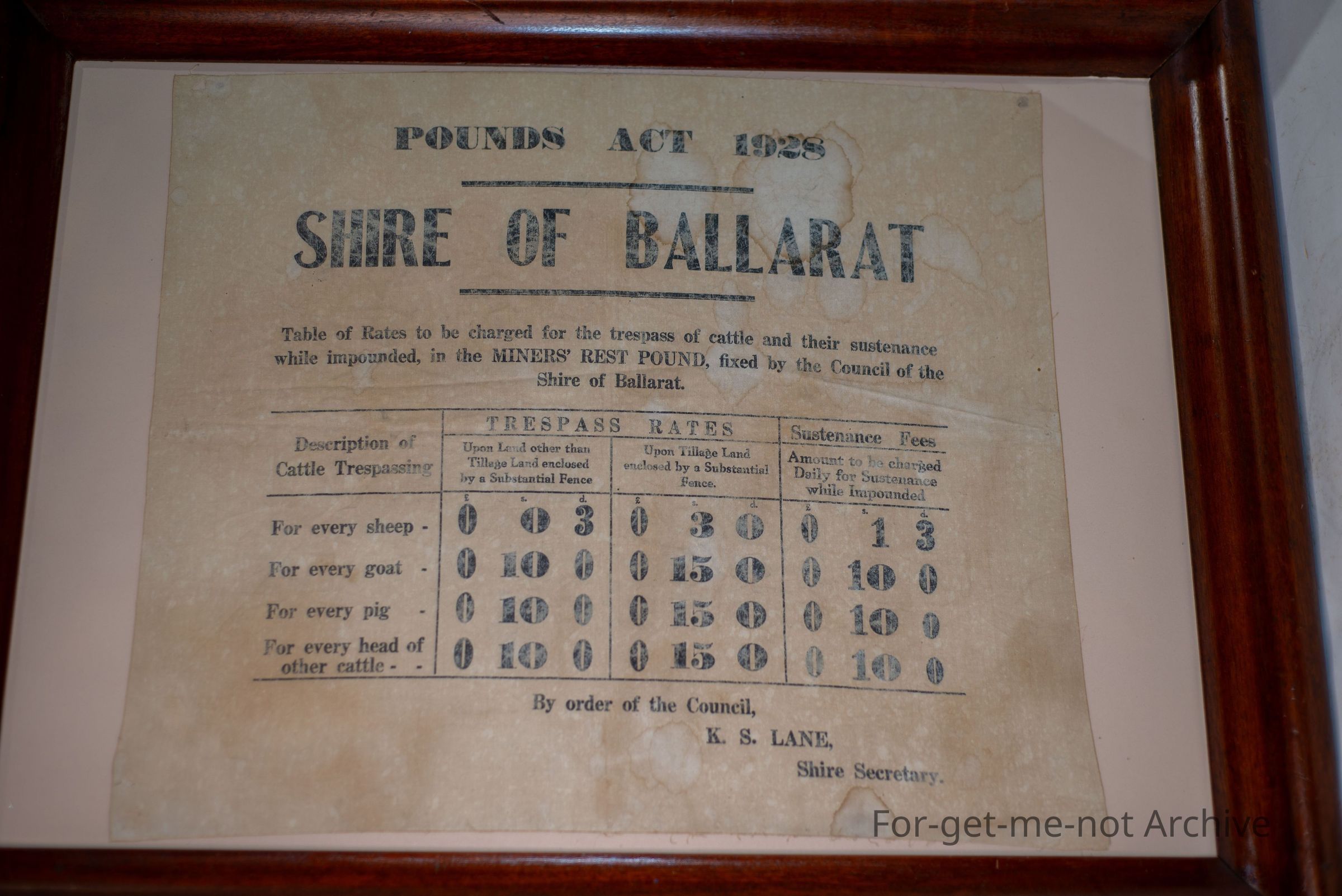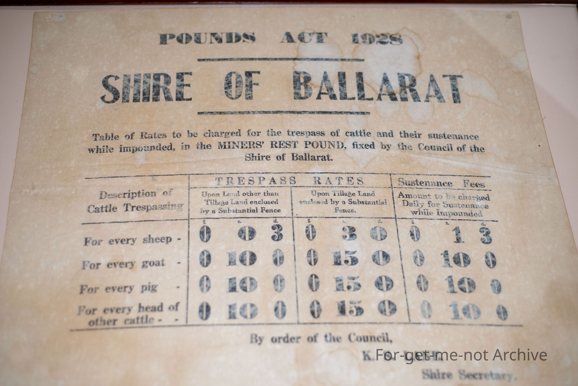 Printed cloth sign from the Shire of Ballarat displaying the rates to be charged for animals impounded by the council, K.S. Lane who was shire secretary in late 1950's