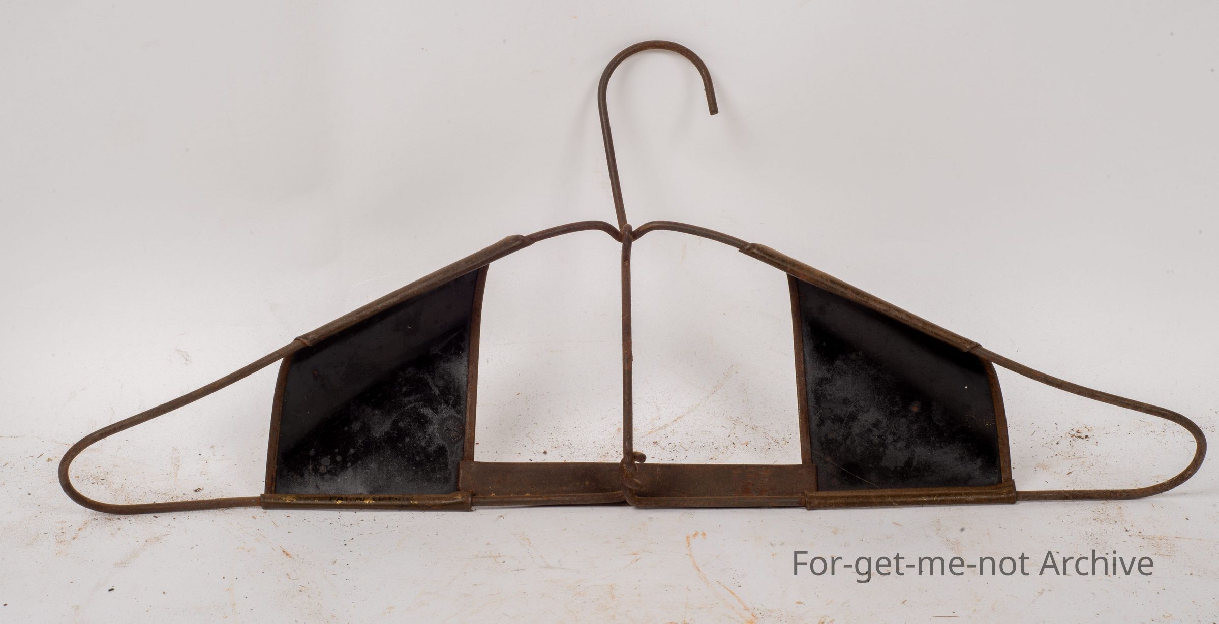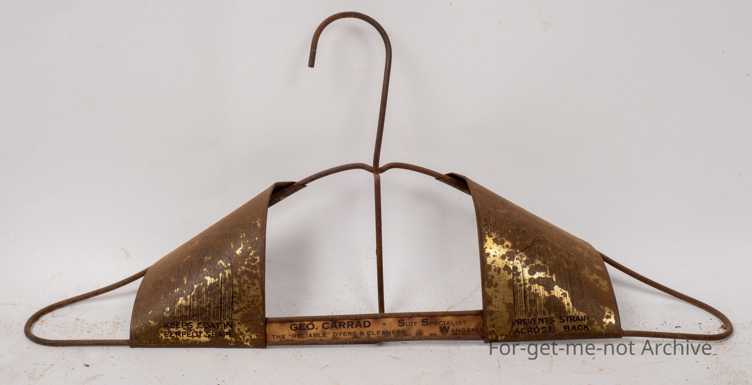 Another wire coat hanger. This one with tin brackets to keep the shoulder of a jacket in shape. This is for this has advertising George Carrad Suit Specialist, the Reliable Dyers and Cleaners. Keeps clothing in perfect shape.Collection