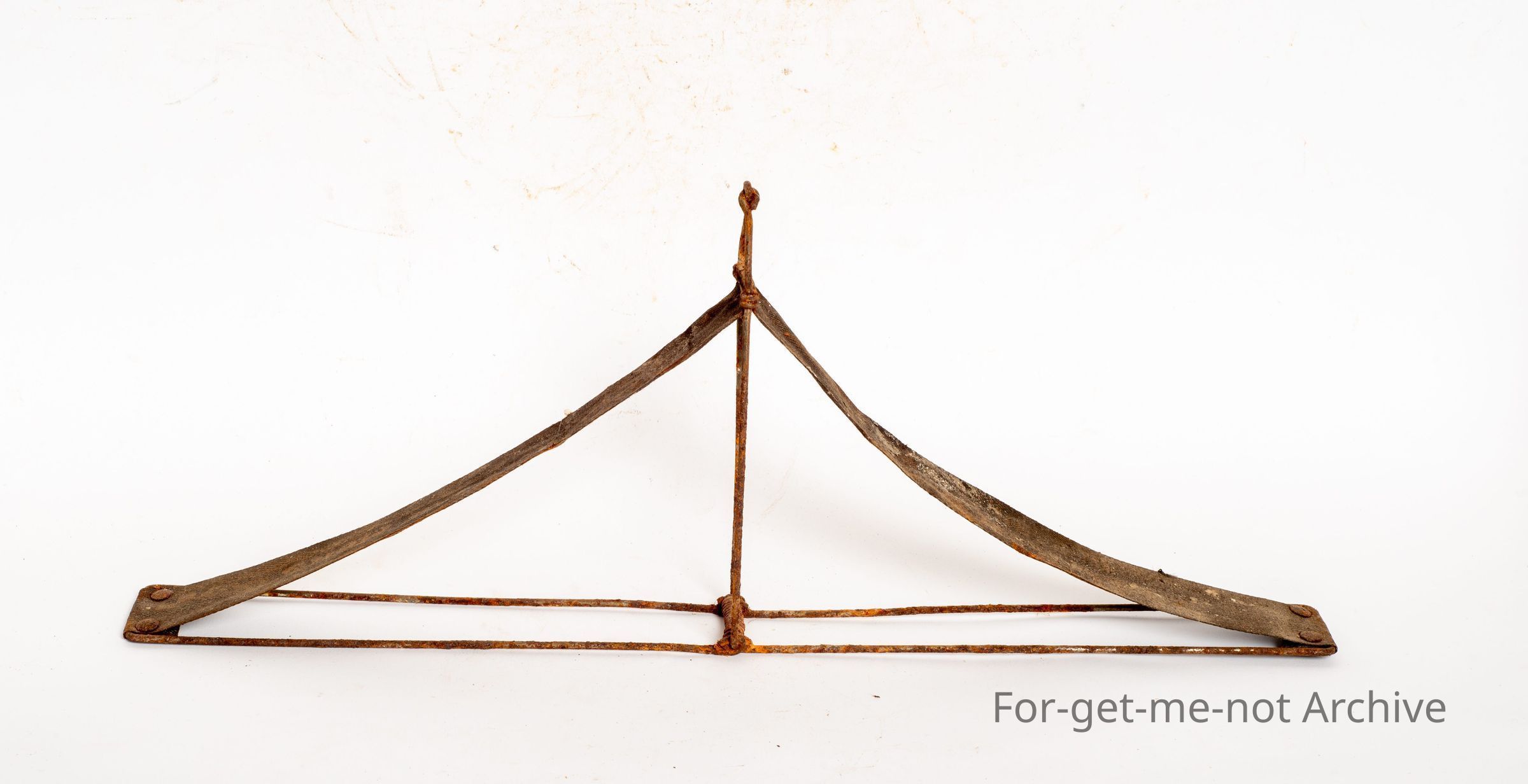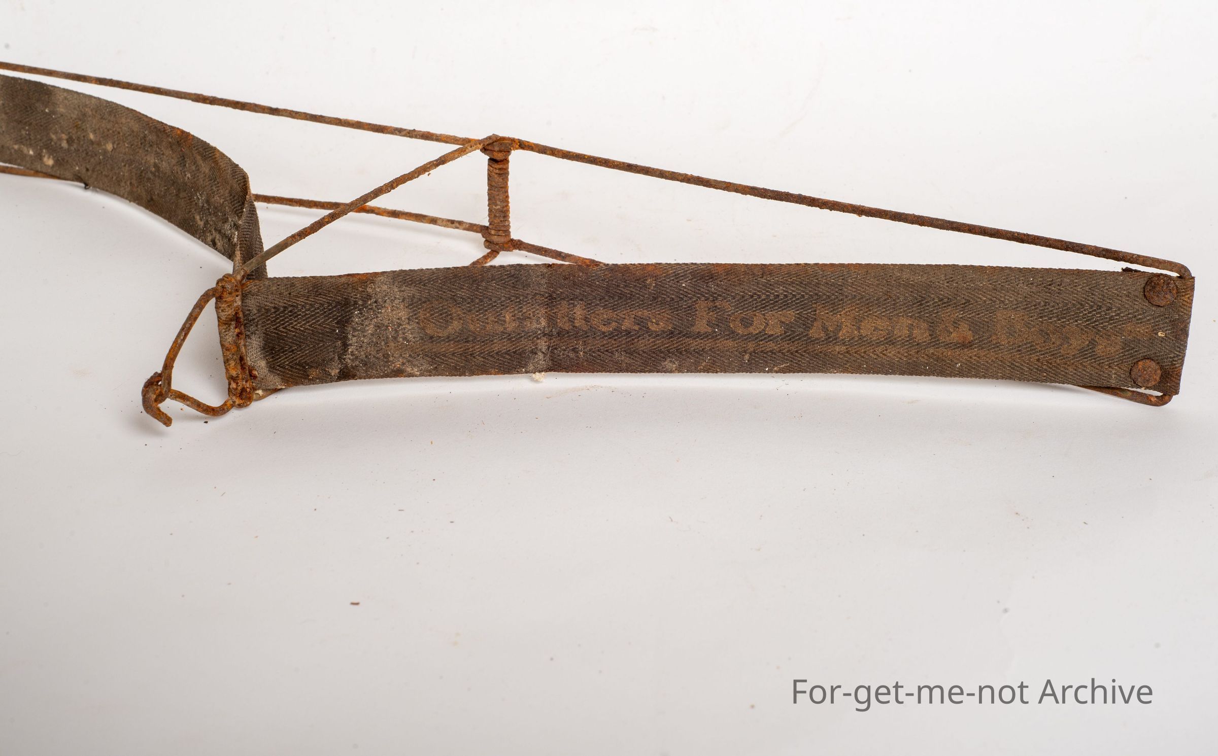 This is a rather rustic, fold up coat hanger with 2 cotton pieces. Says Outfitters for men and boys. Can't work out the other name. Pretty poor condition value
