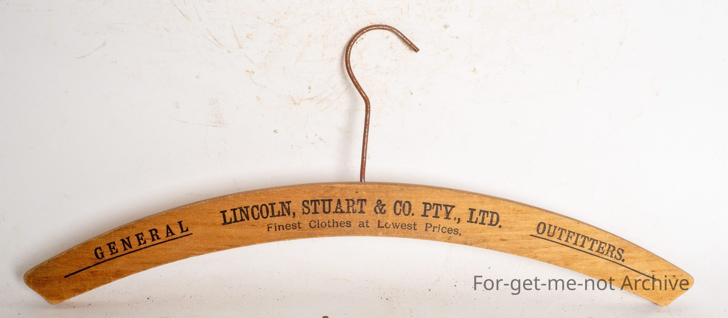 This is a wooden coat hanger, with advertising. Lincoln Stewart and Co for finest clothes at lowest prices.