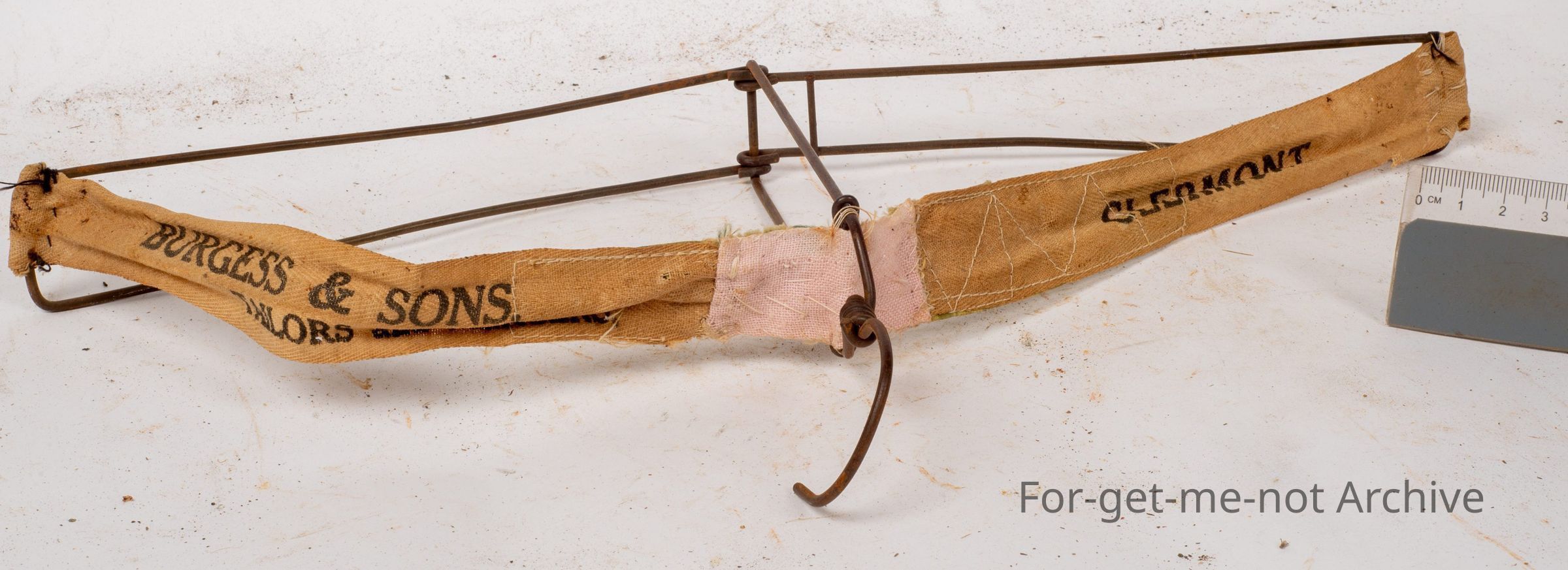 This is another early wire work coat hanger. This one has advertising on , textile straps, burgess and sun tailors and mercers. Claremont. Lovely early piece.