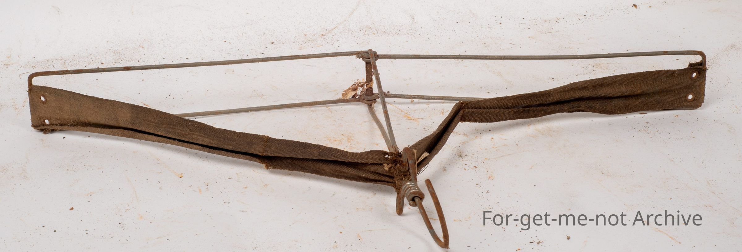 This is another foldaway coat hanger made of wire with a fabric piece along the top. This one doesn't appear to have any advertising. Not that's readable.