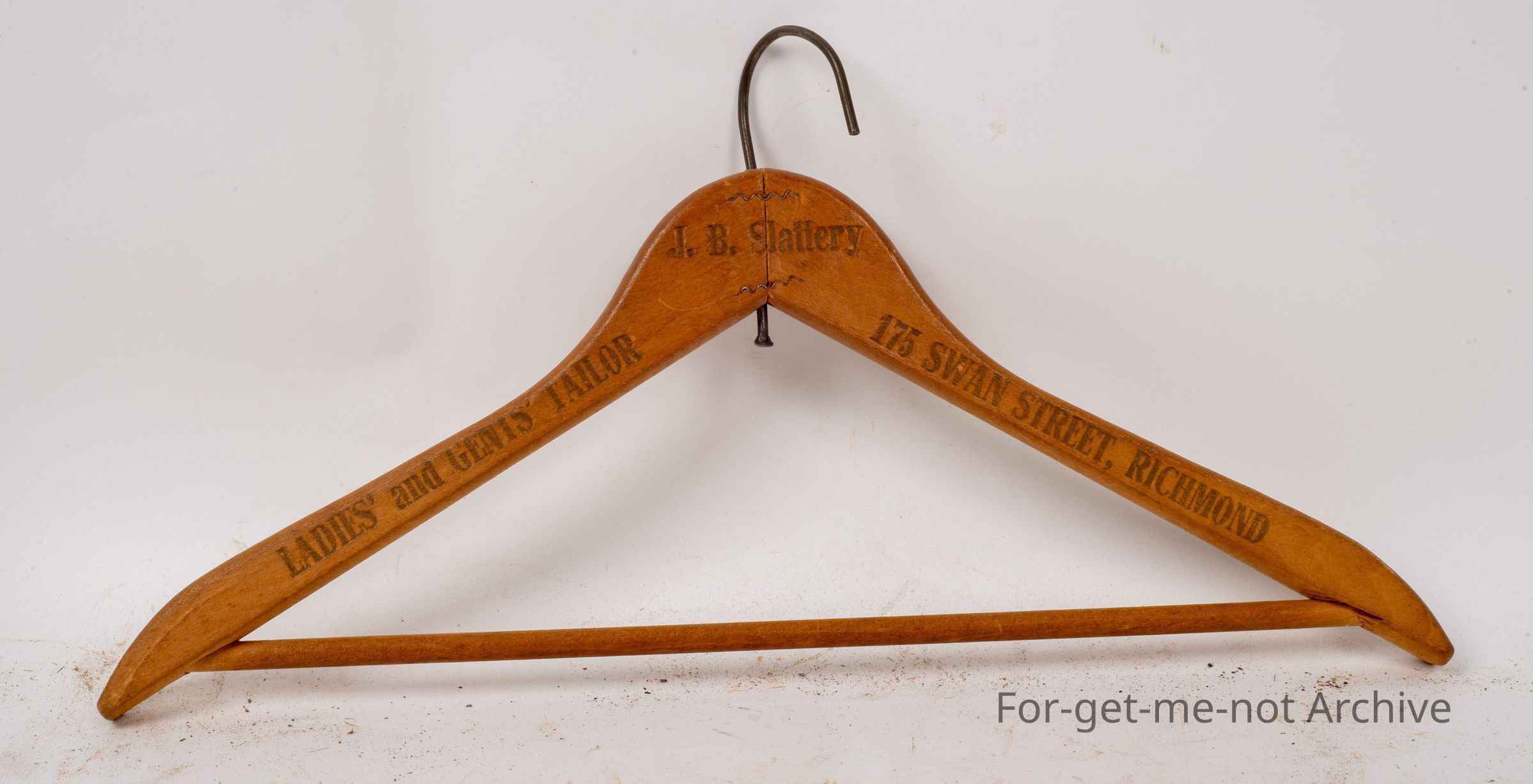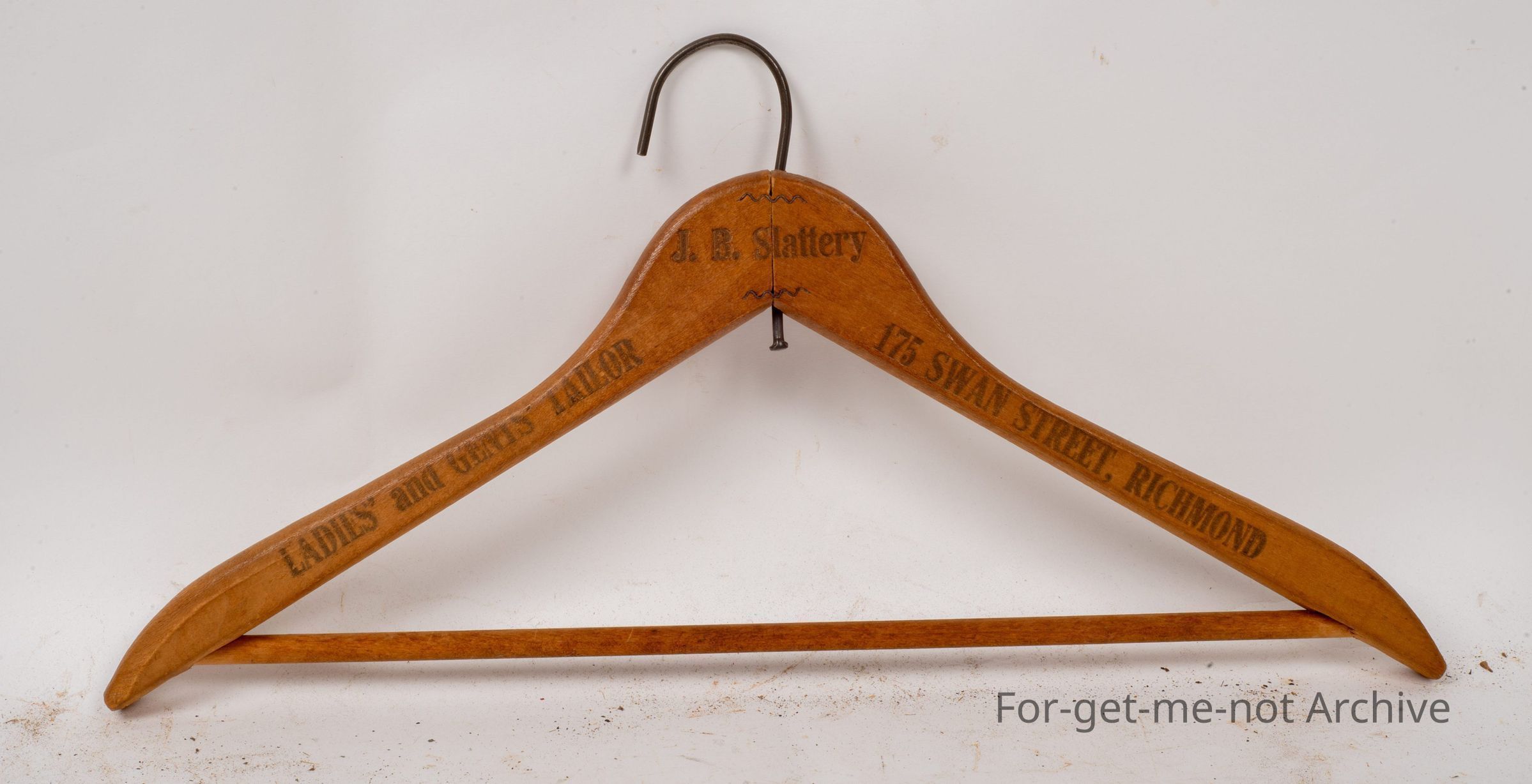 This time, a wooden coat hanger with advertising ladies and gents, Taylor. 175 Swan Street, Richmond. JB Slattery. Very good shape. Nice clear advertising,