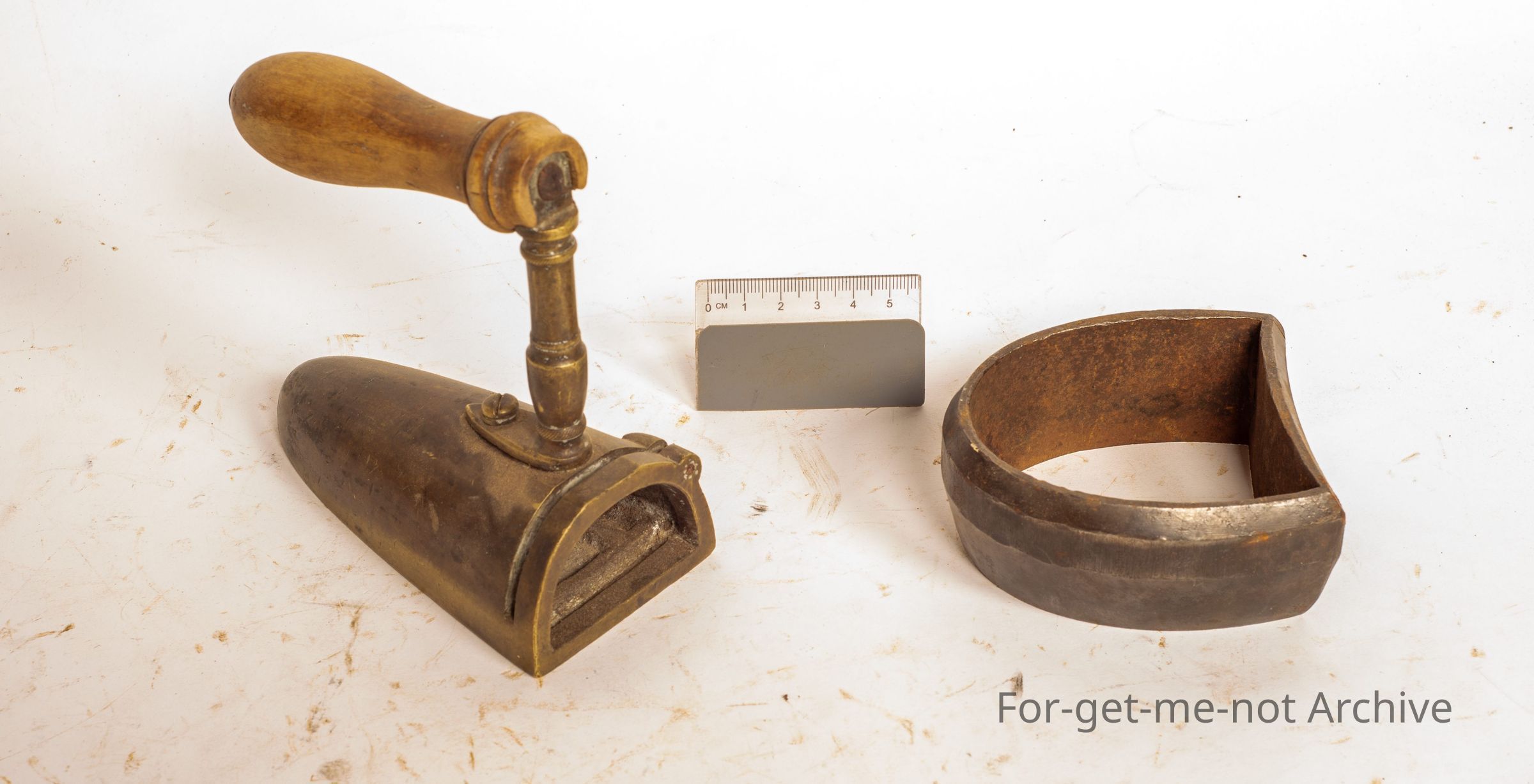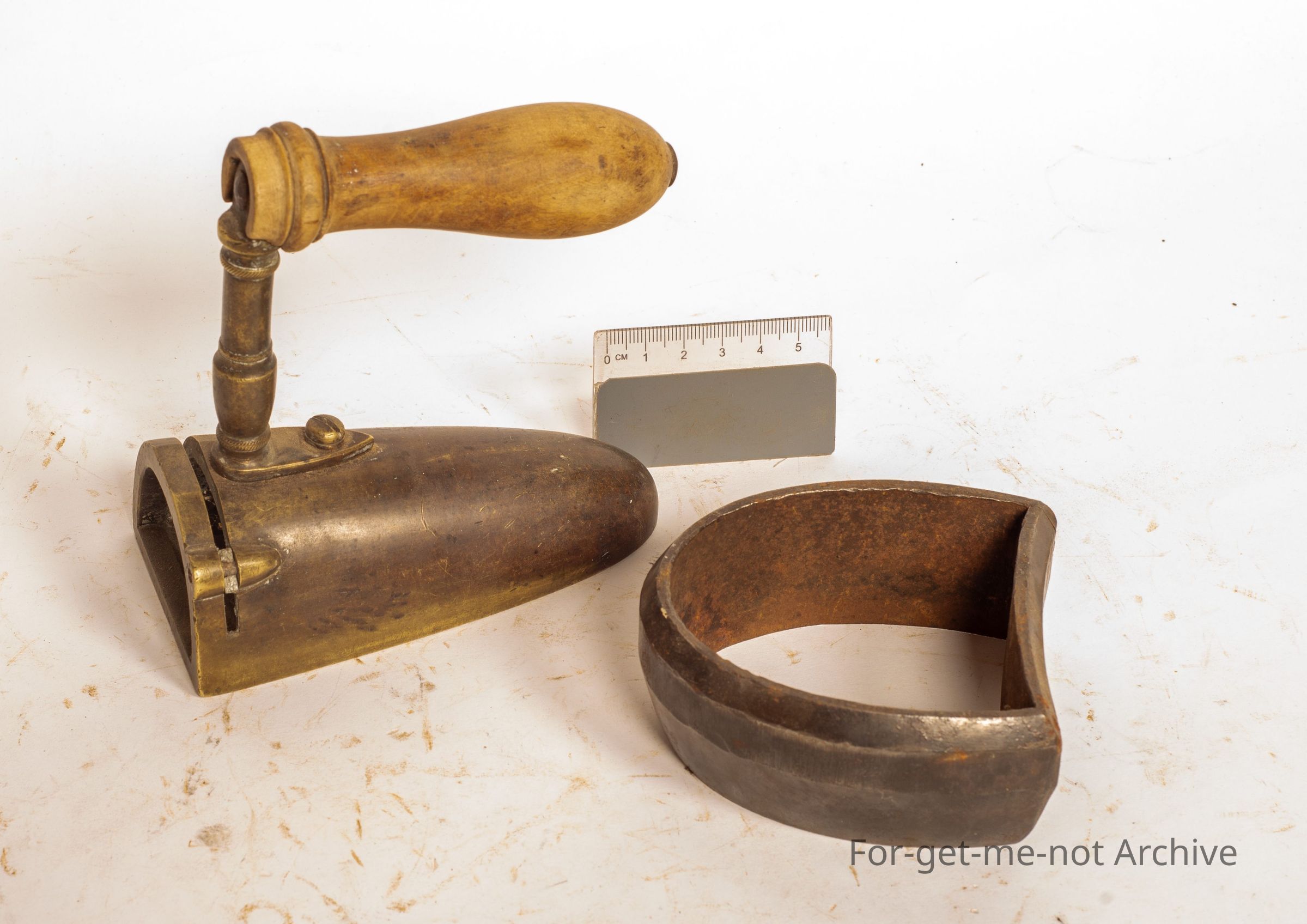 1 is a steel, cut out used to cut out the sole of a boot or the heel of a boot from a heavy leather hide. The second one is an iron with a wooden handle. This would have had originally a billet of steel heated, slid into it. The door which kept this the piece in there is missing. The body is made of brass. Interesting piece but incomplete.Collection
