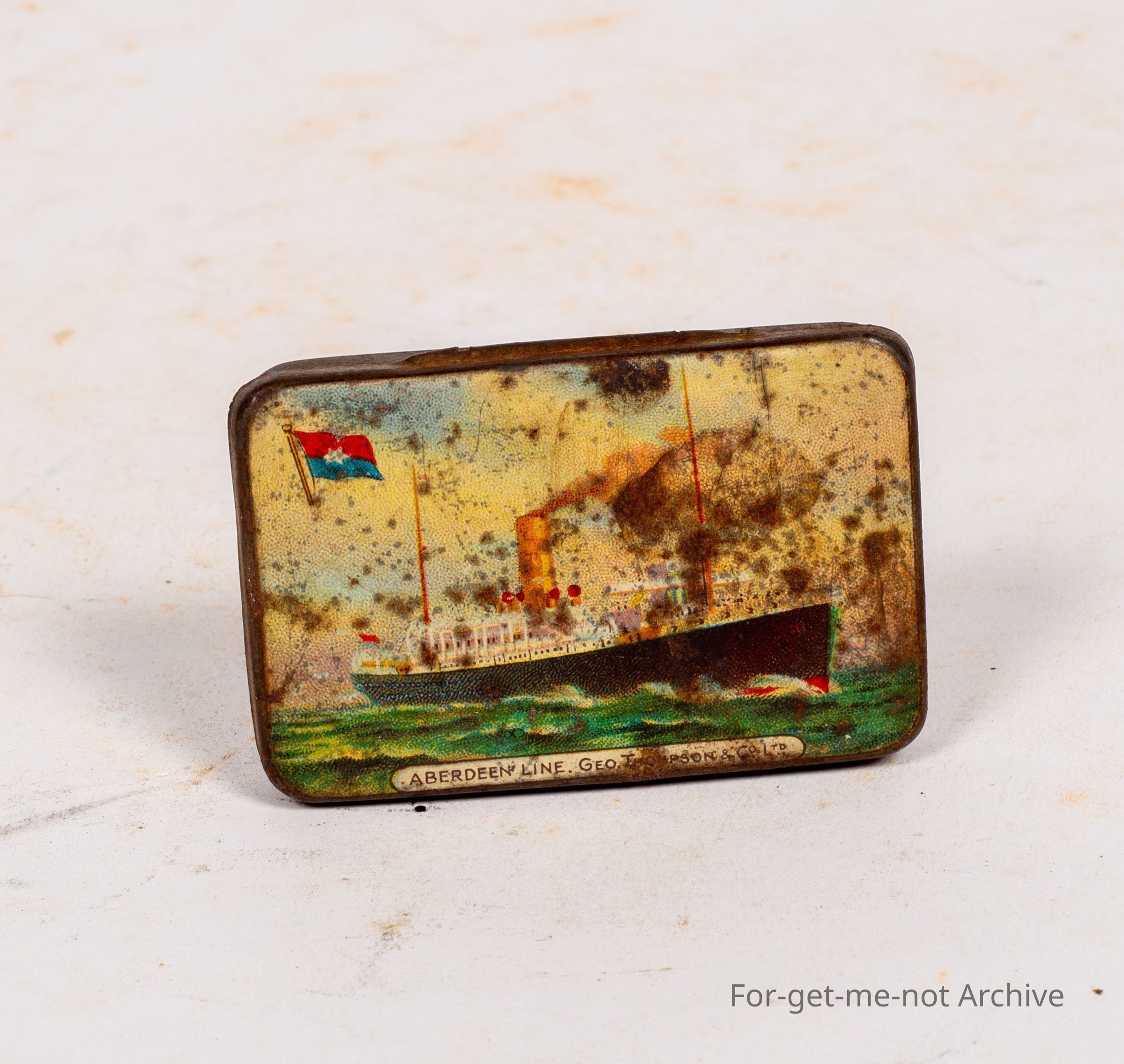 This is a sample Tin from Cadbury Bournville Striker on the Base. This Tin came out of a series, promoting, various, seagoing ships. This one is from the Aberdeen line. A bit down in condition, but a very difficult tin to get.Collection