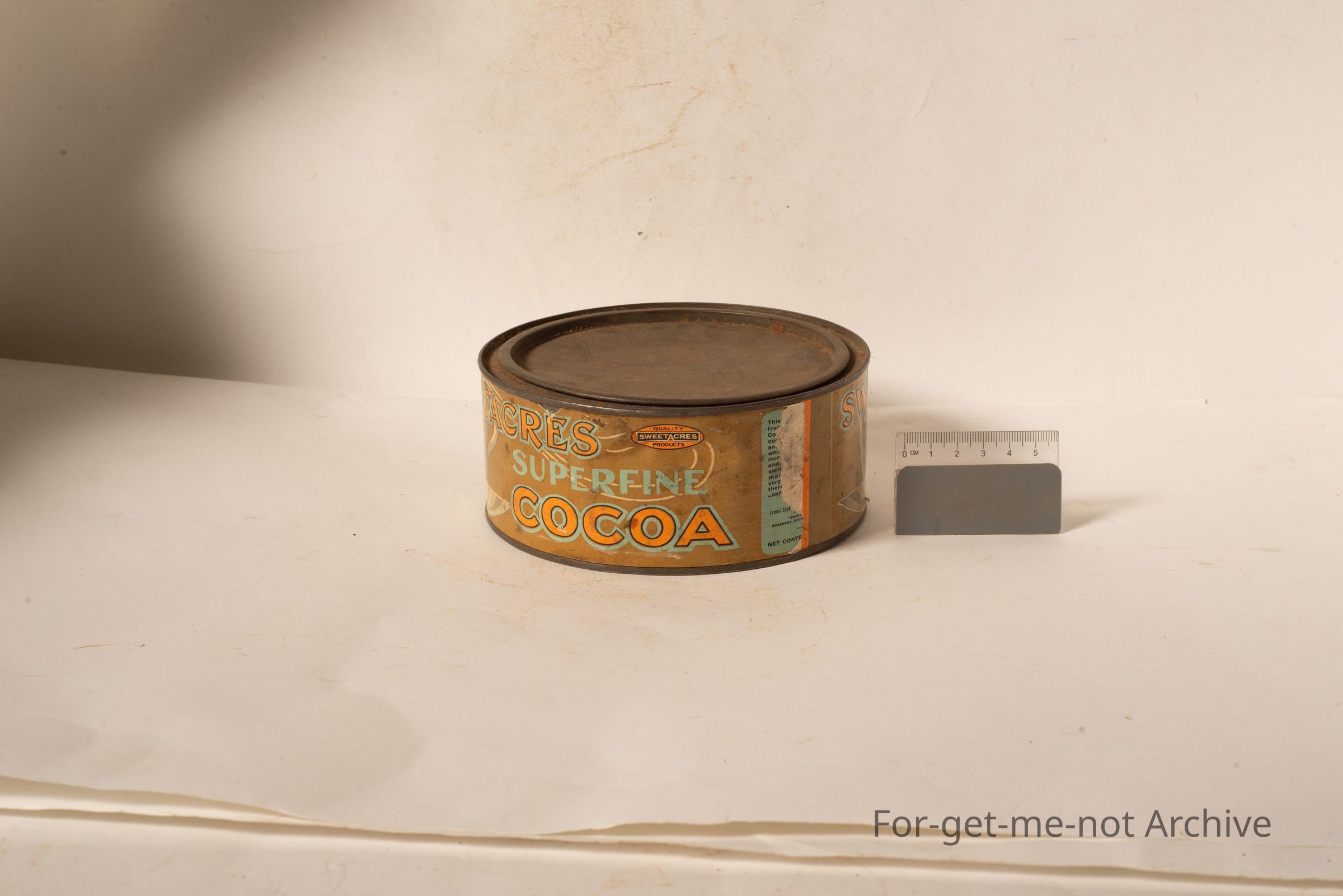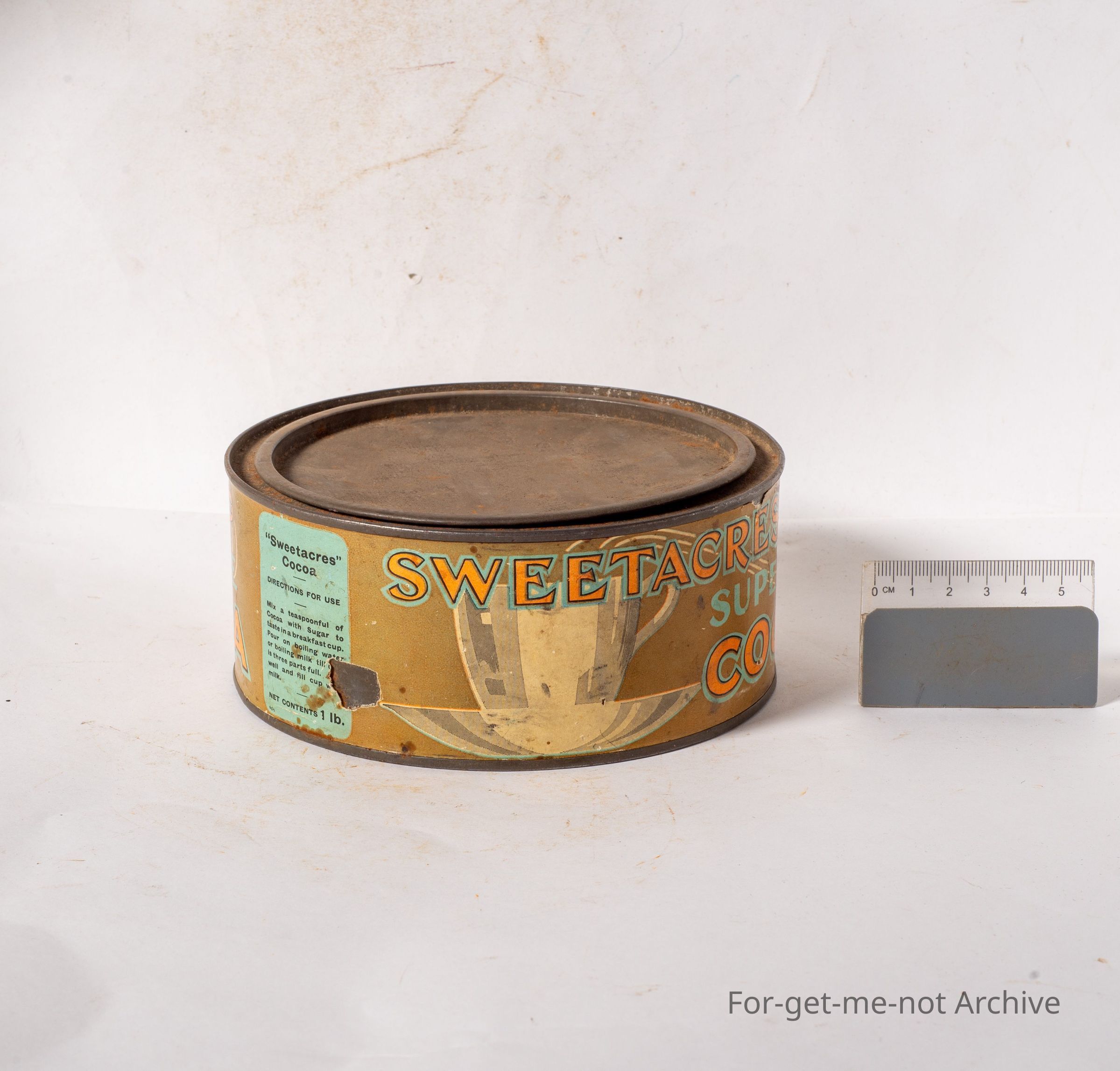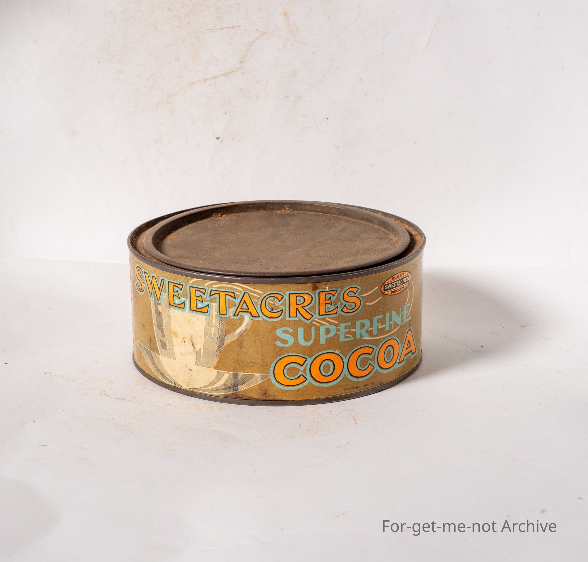 This is a round but squat tin from Sweet Acres Super Fine Cocoa. This is for drinking chocolate. Images of a cup. Not in bad order. A little bit faded. A paper label. Underneath it says "Tin Free - non returnable"Collection