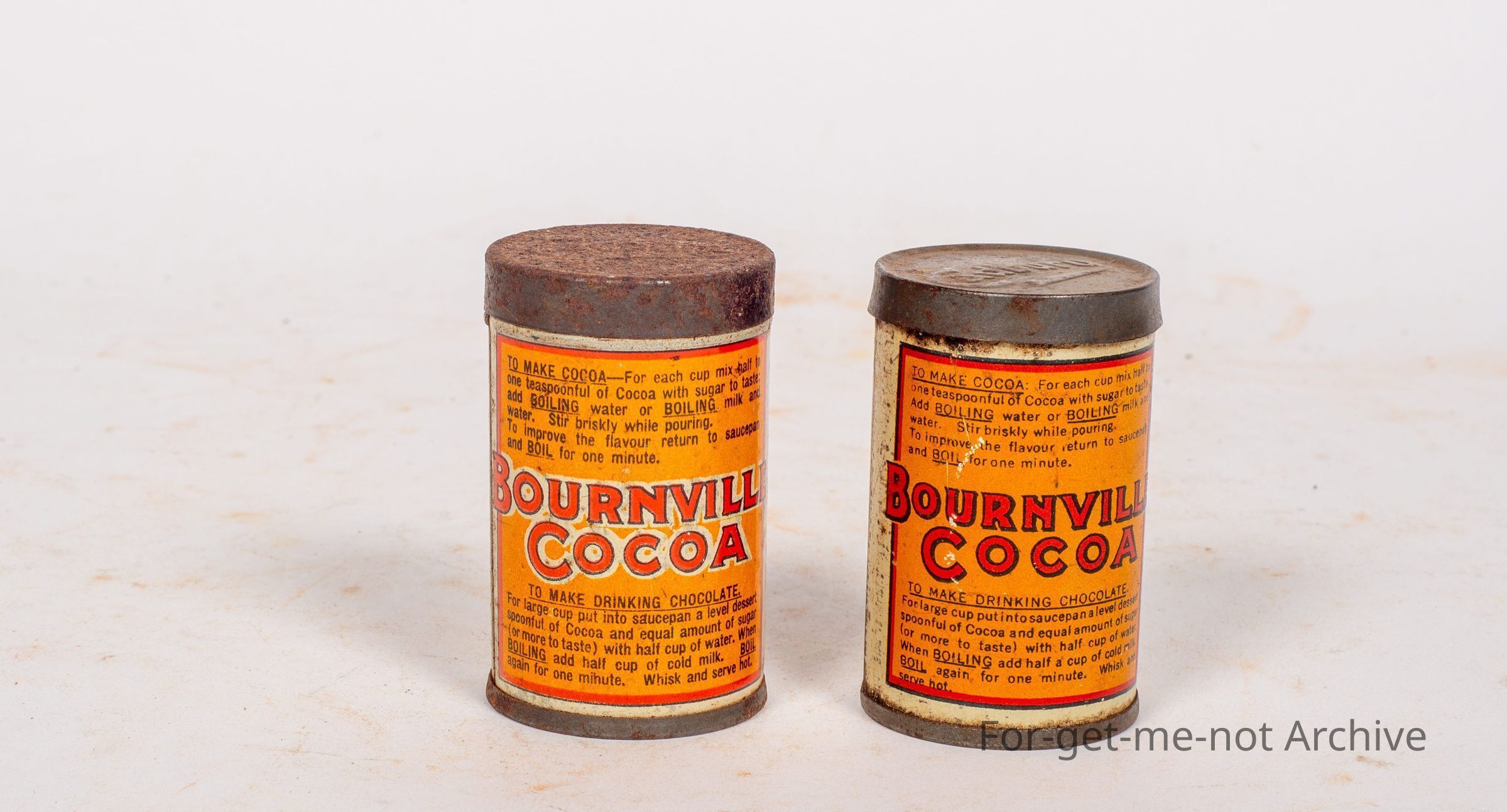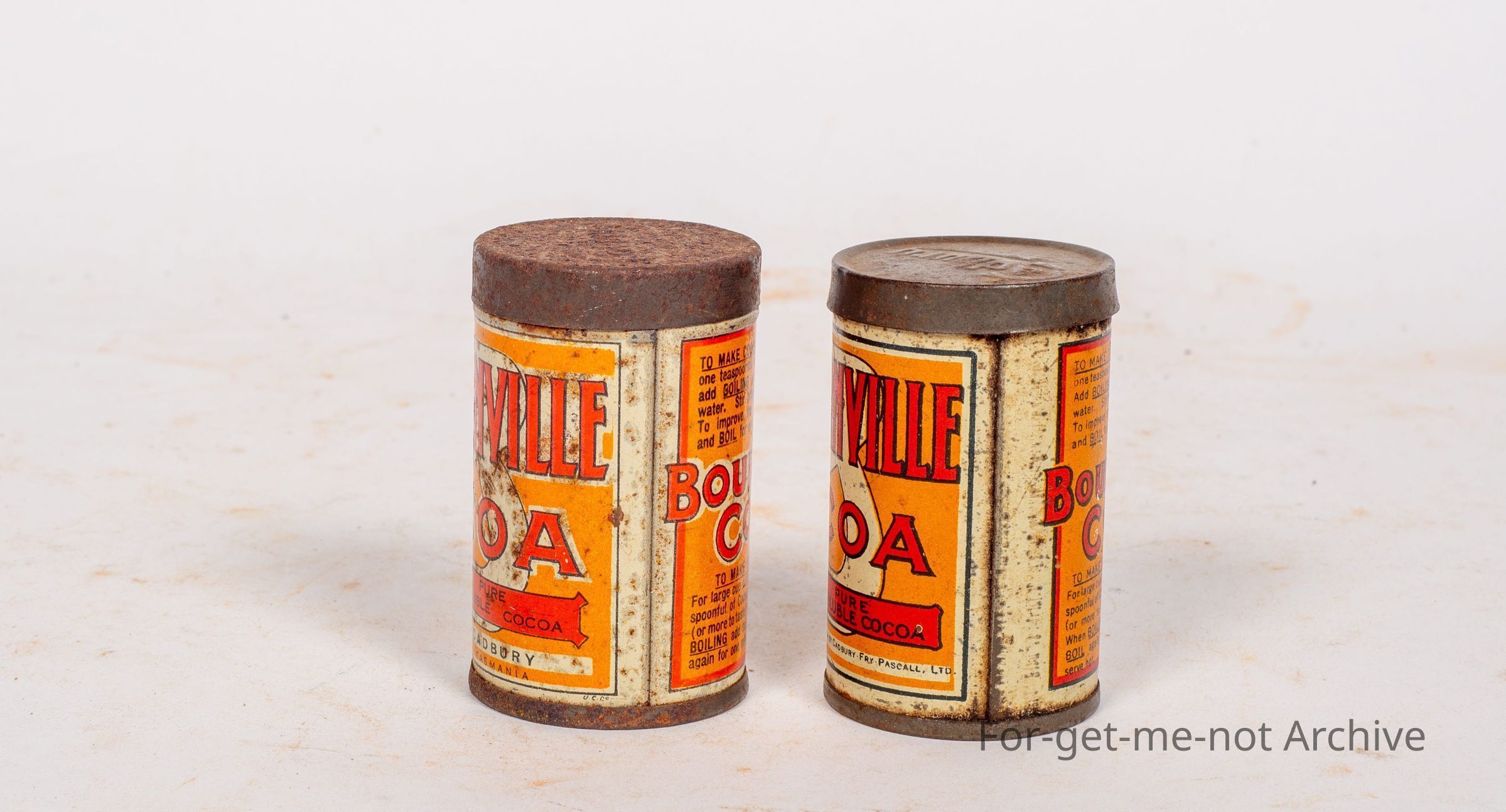 2 Bounville Cocoa Tins, pure soluble Cocoa. These tins do have a slight difference even though they're the same capacity. Both sample tins, One has the Cadbury image stamped on the lid, the other one doesn't. And the made by Cadbury at the bottom differs. a pair.Collection