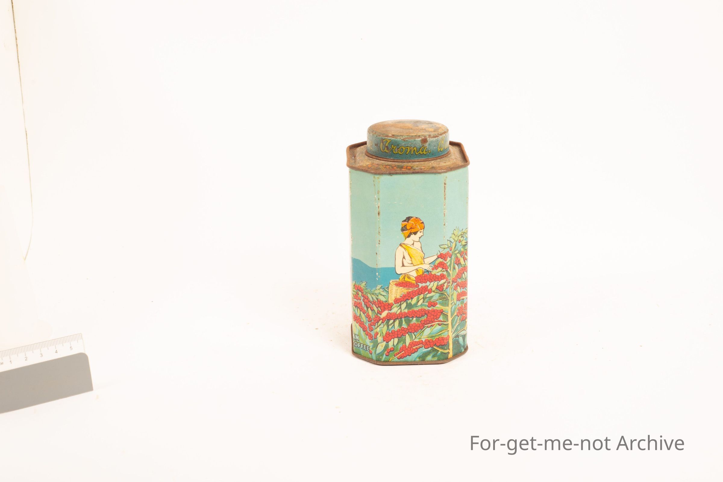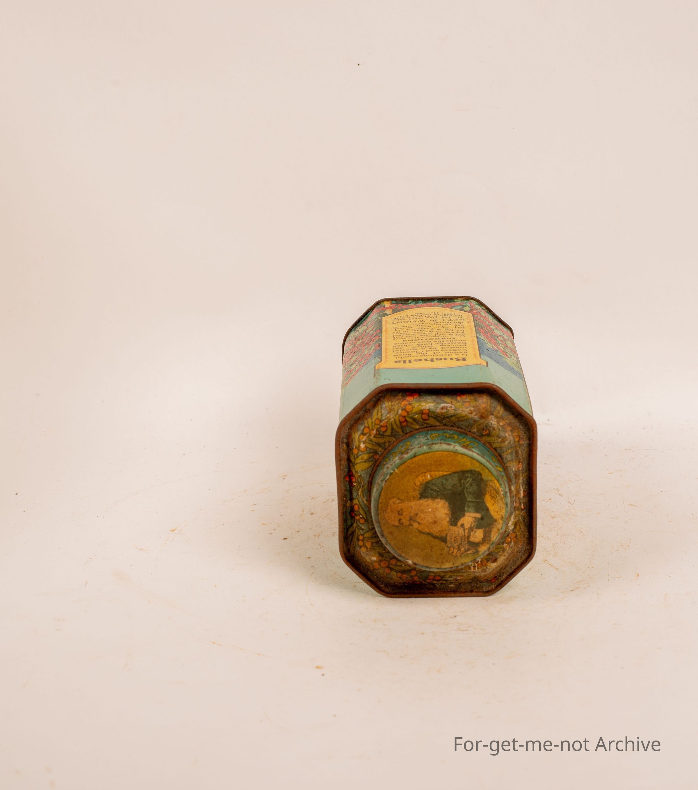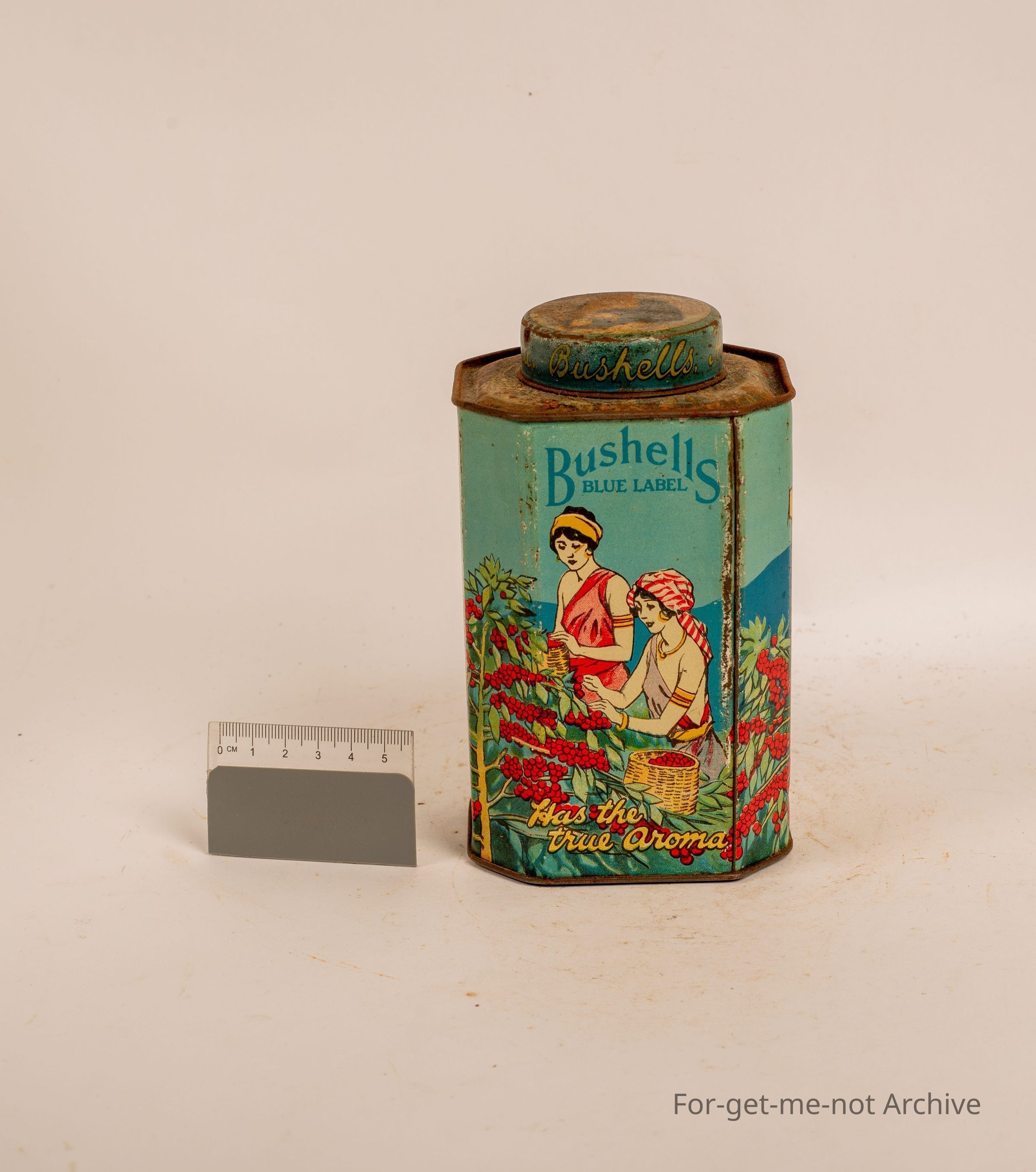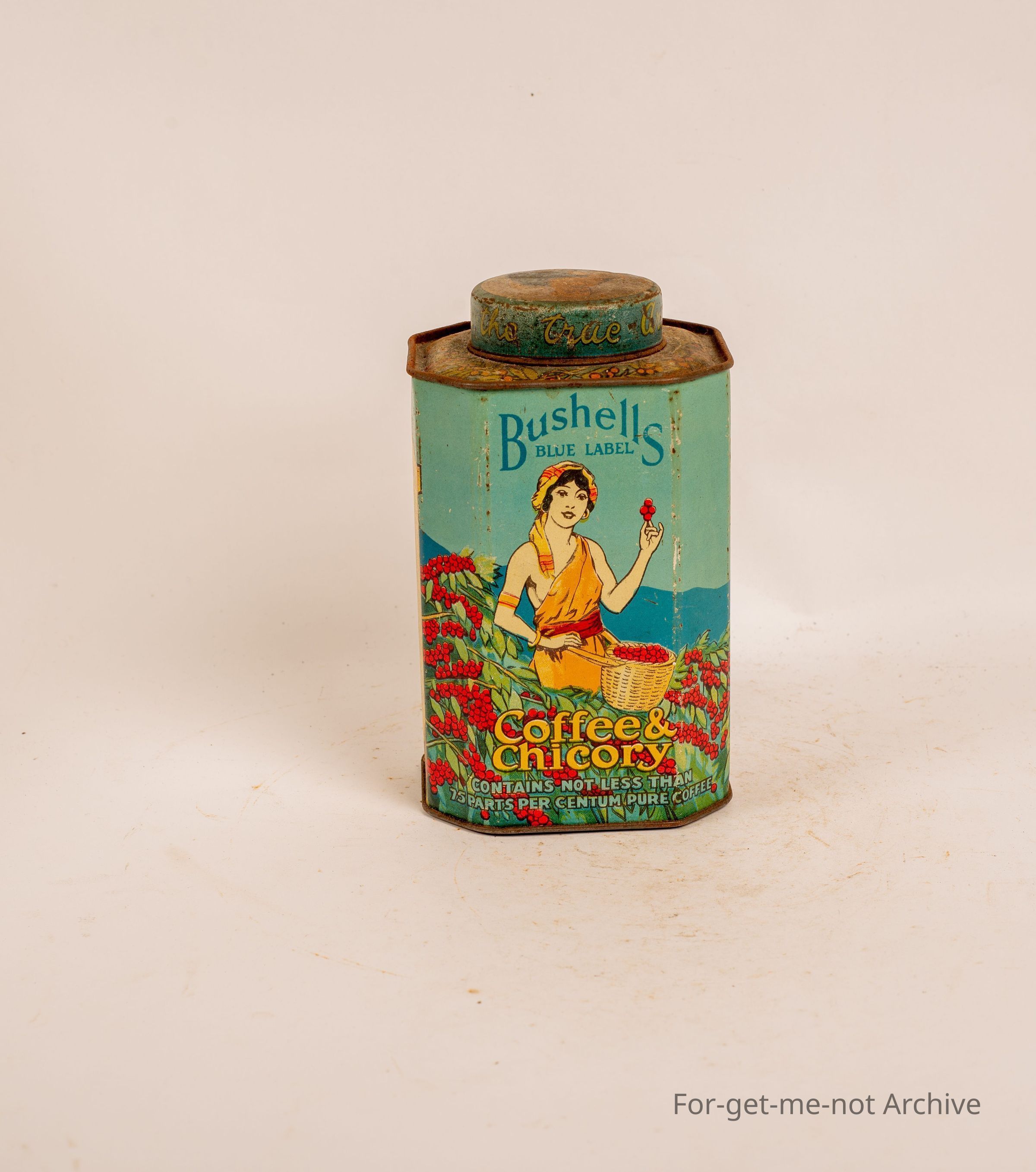 Bushels, coffee and chicory tin in very good order for its age, depicting pictures of tea pickers.