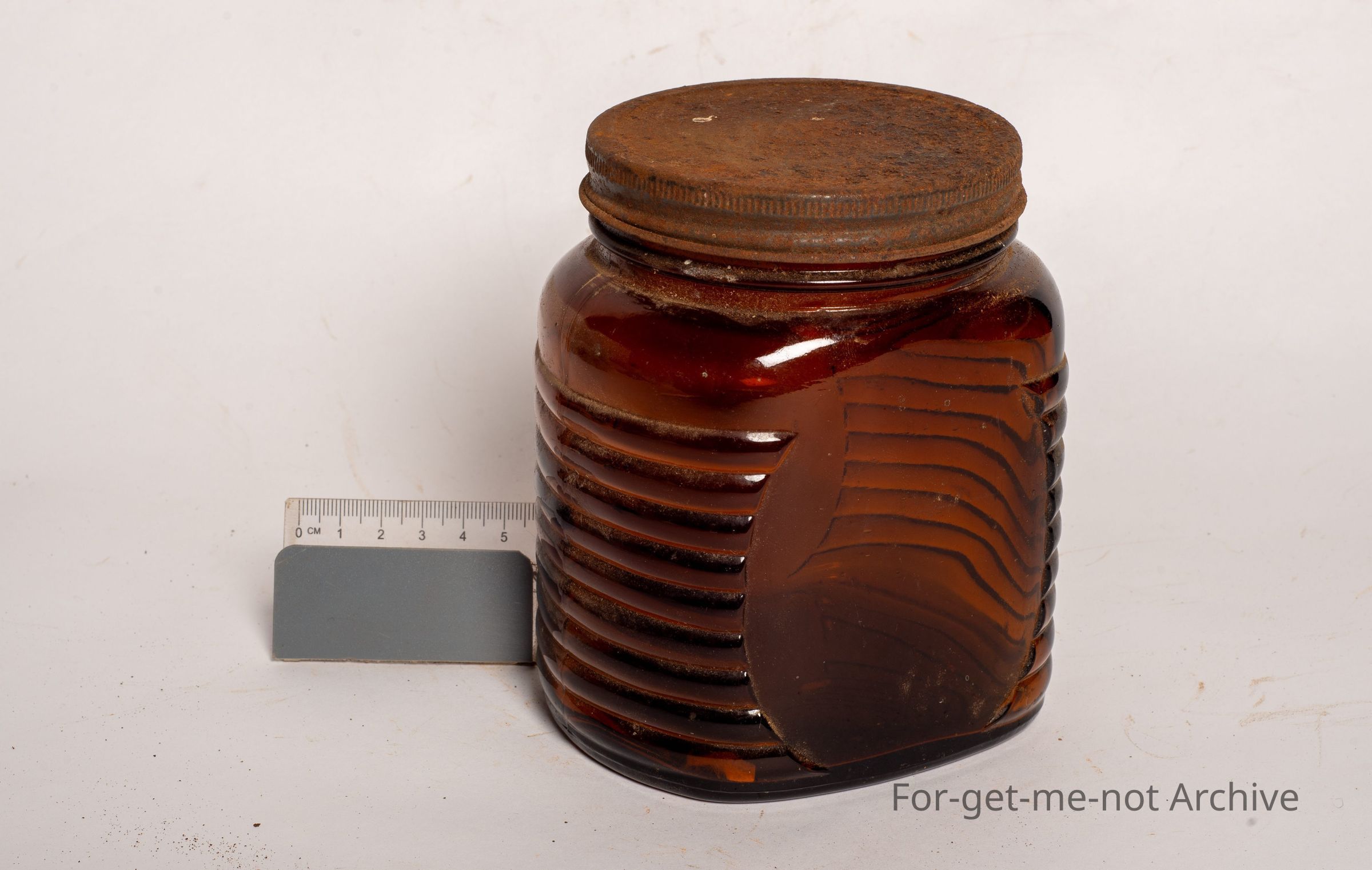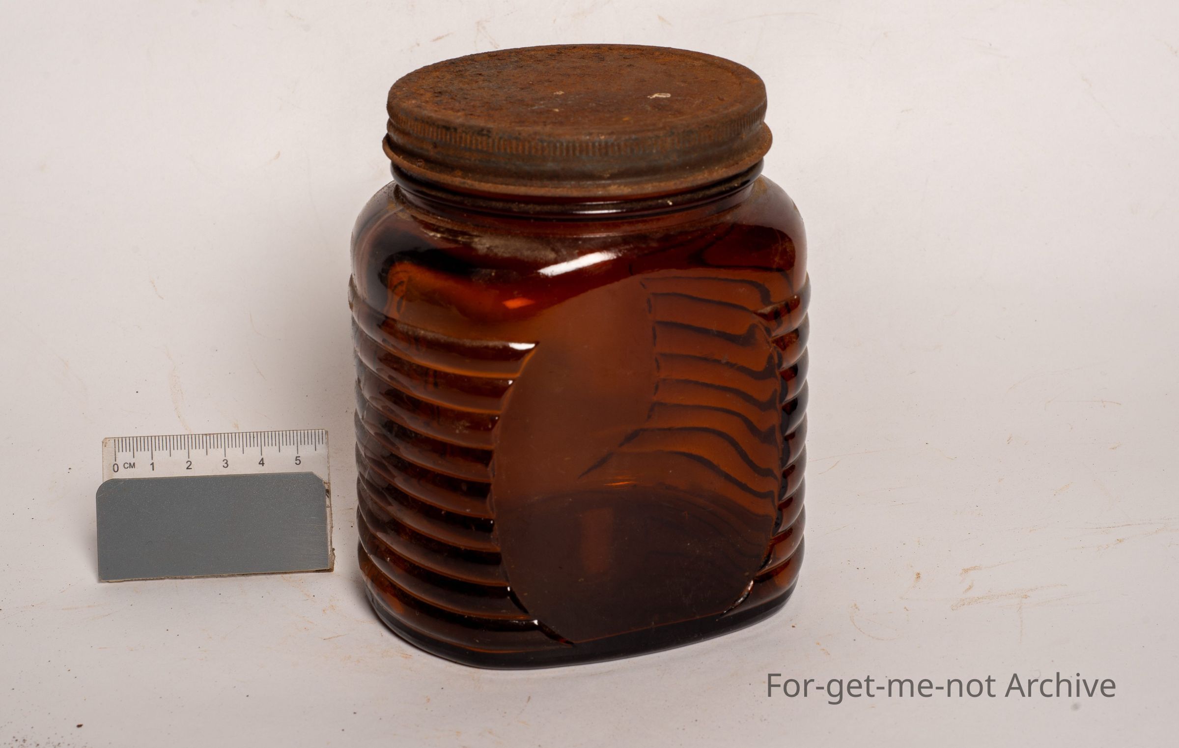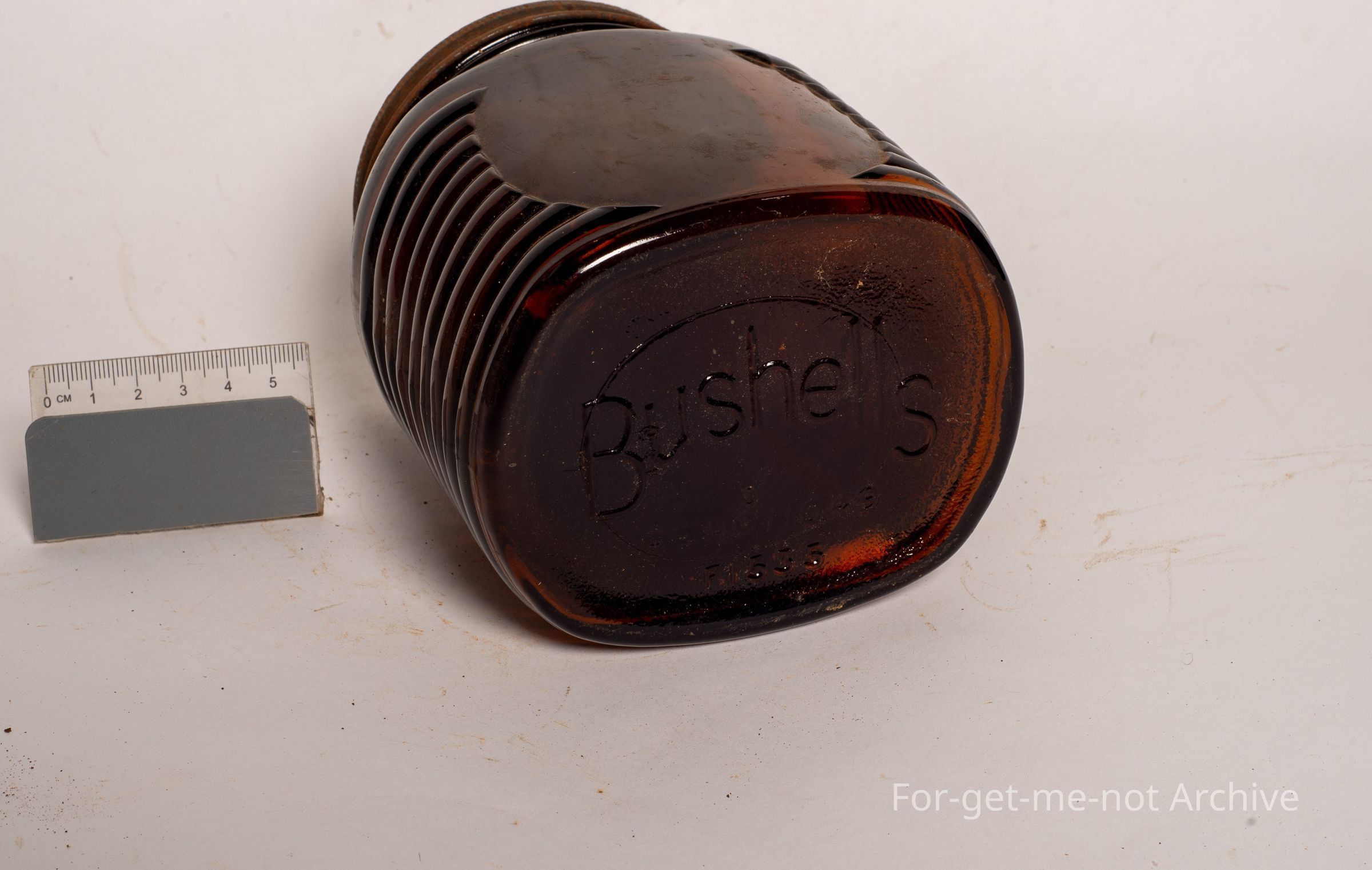 This is a beautiful amber glass Bushels, coffee jar. Ribbing around the outside. The label is missing. The chin, the lid is there, but pretty warm, embossed bushels on the base. Not many of these amber ones around in comparison to the clear glass.Collection