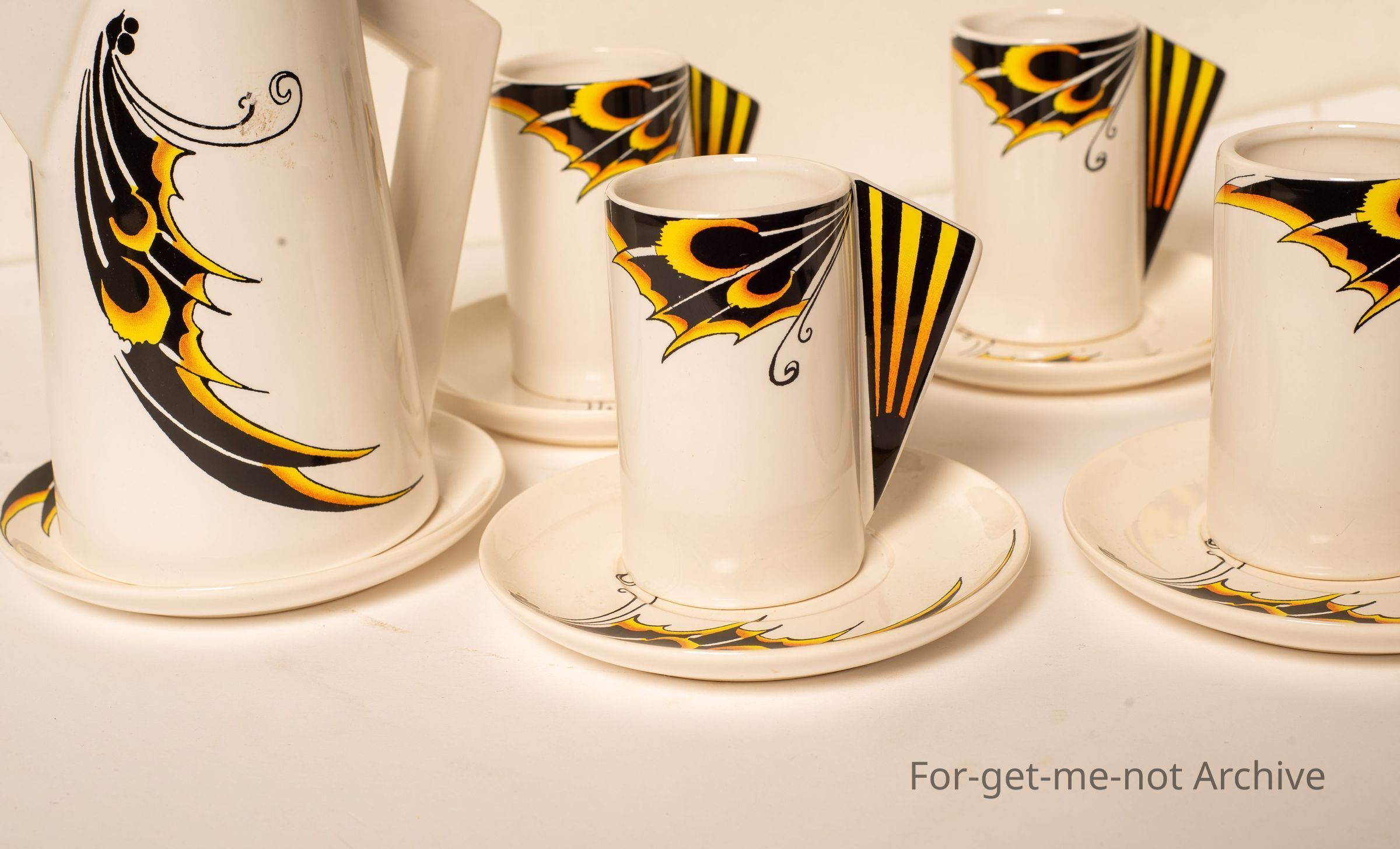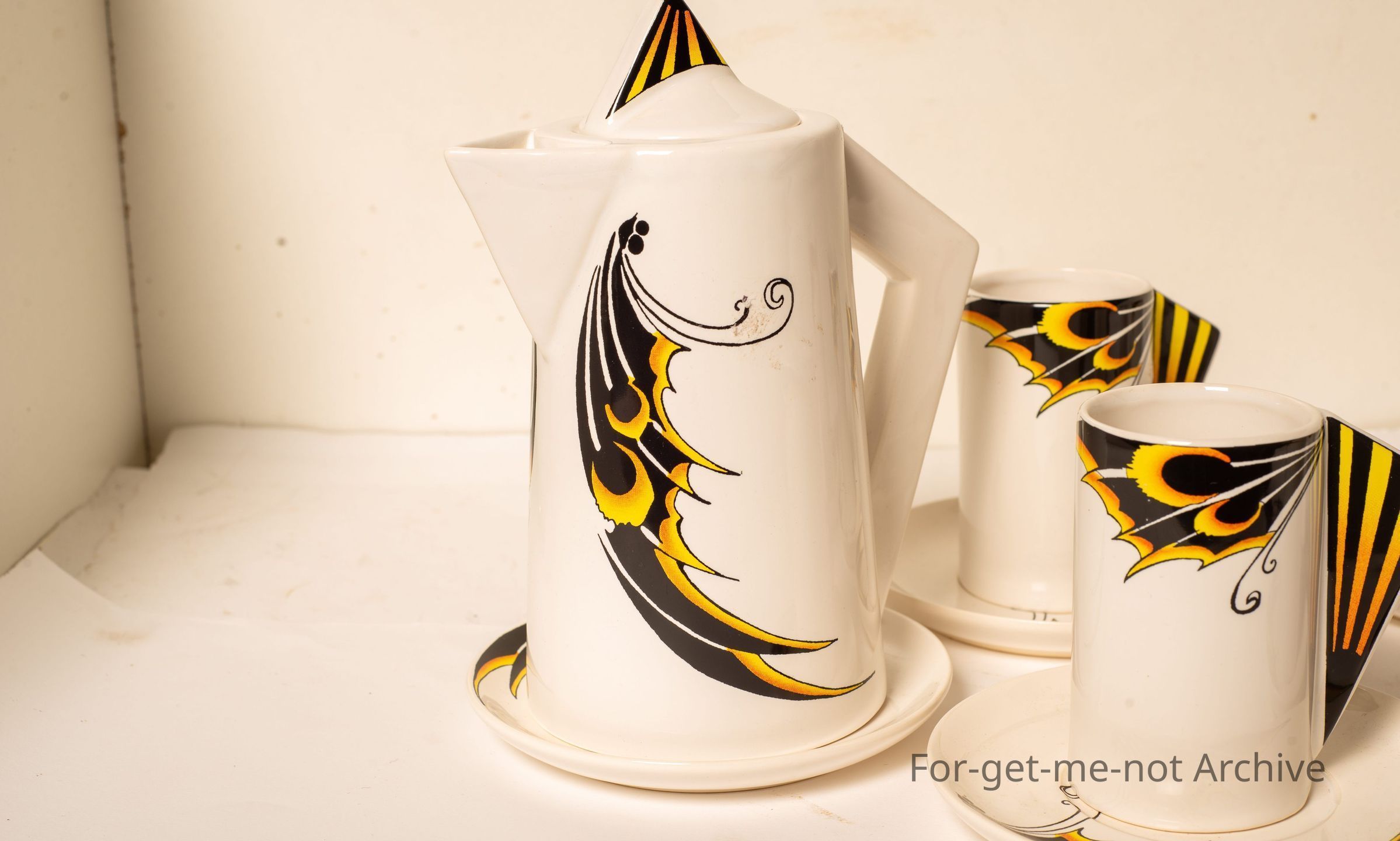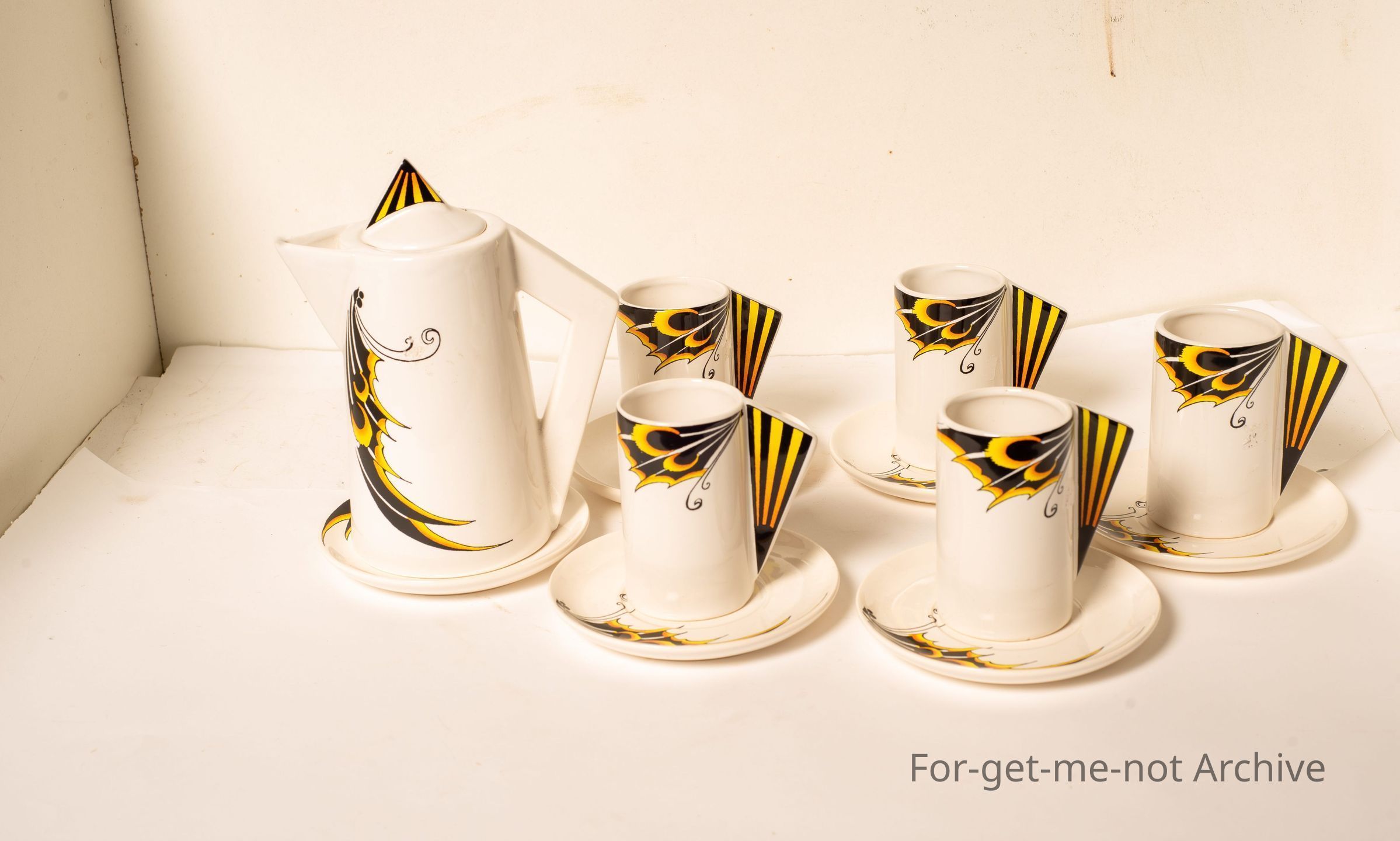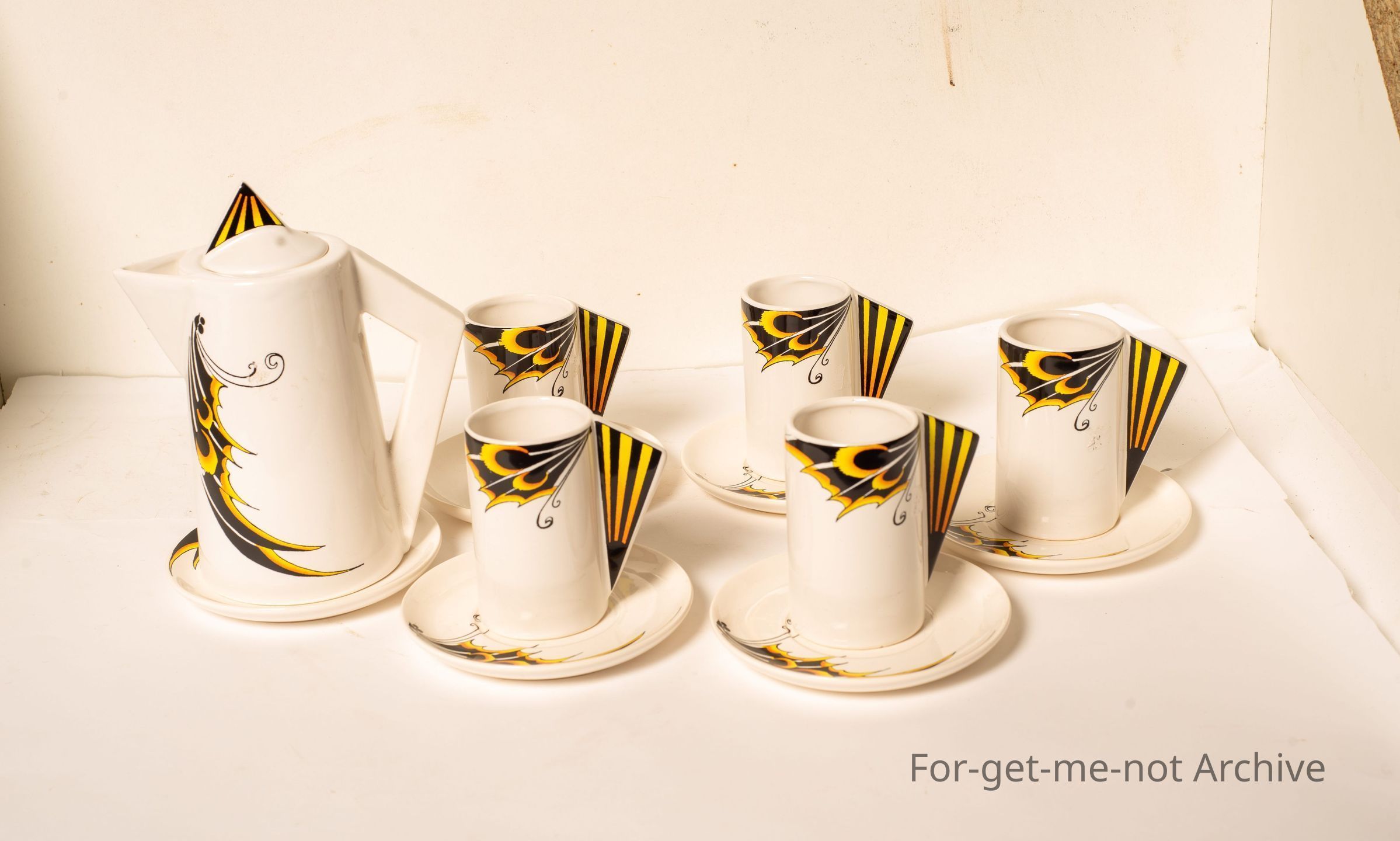 Is a, ceramic set of very unusual decorated coffee pot with 5 cups and saucers, reminiscent of Clarence Cliff, but no stamping.