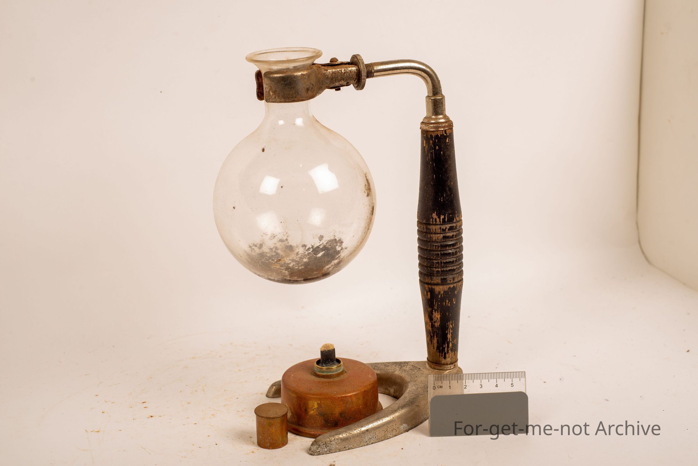 Glass coffee percolator with burner, wooden handle, lid for burner, incomplete.