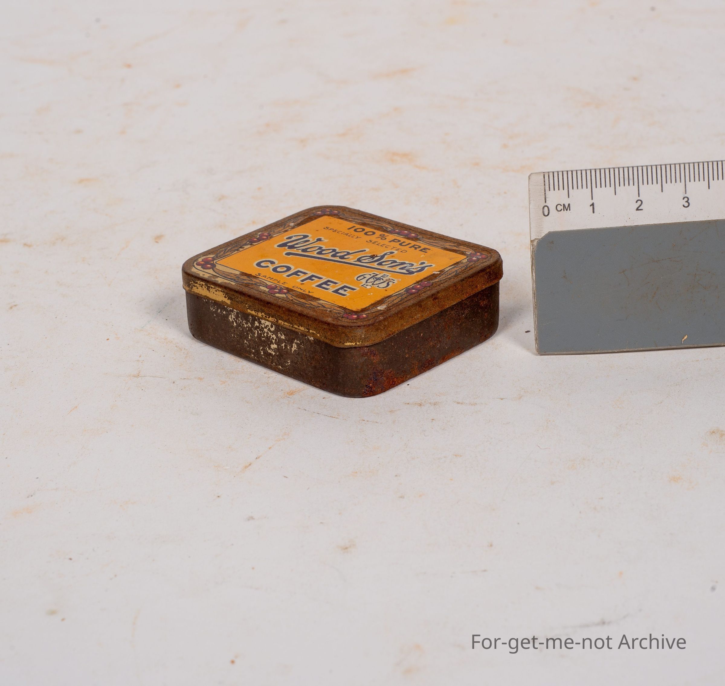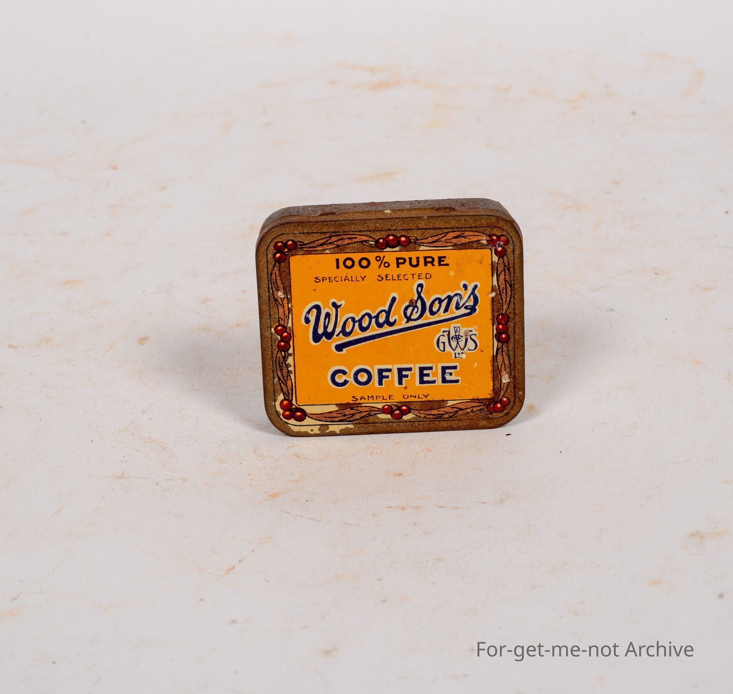 is a sample tin of wood, suns, coffee. 100% pure, specially selected. Image of coffee beans around the surrounds. Quite a rare tin.