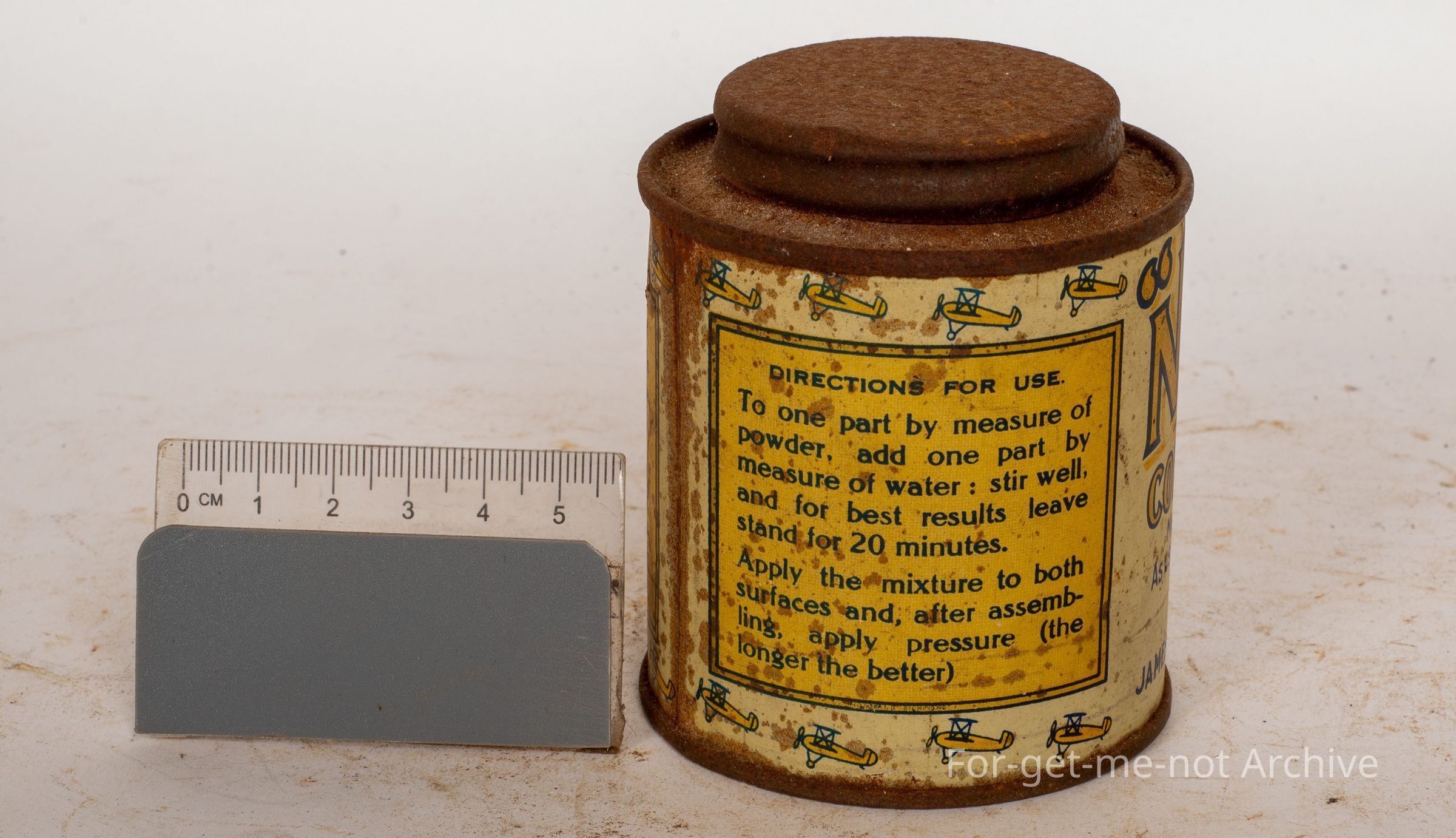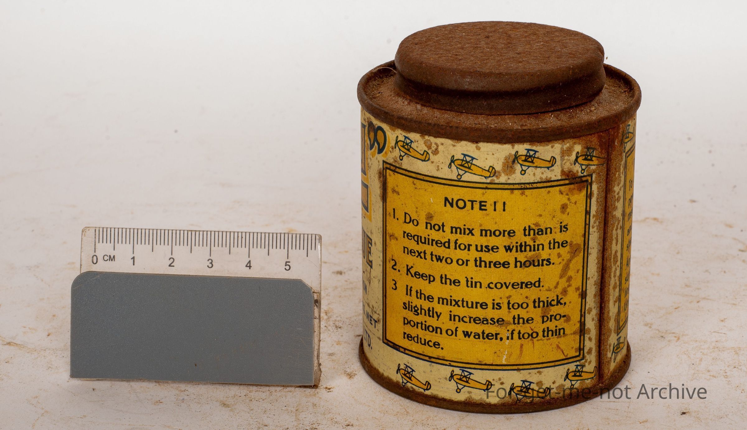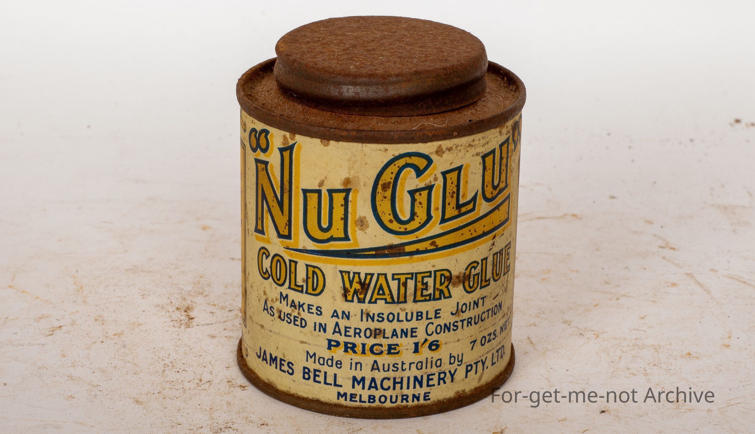 This is, about a half pint or 7 ounces tin of new glue. Cold water glue makes an insoluble joint used in aeroplane construction. Price, 1 and 6. Made in Australia by James Bell Machinery, Melbourne.Collection