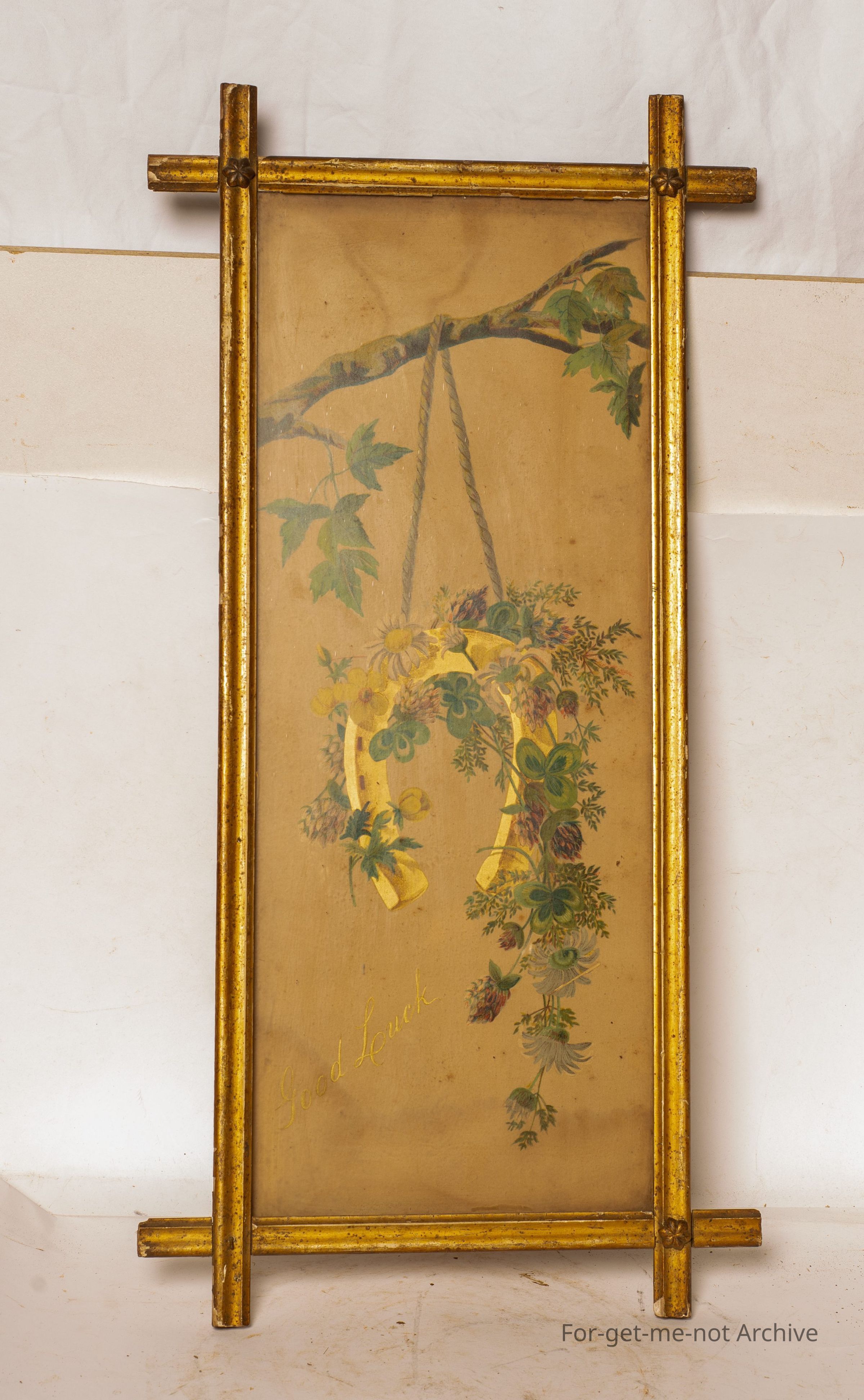 What I call a colonial frame of a sea of a horseshoe covered in in, plant vegetation It's in a cross corner frame, just depicting good luck. A wooden backing plate, probably quite old. Good conditionCollection