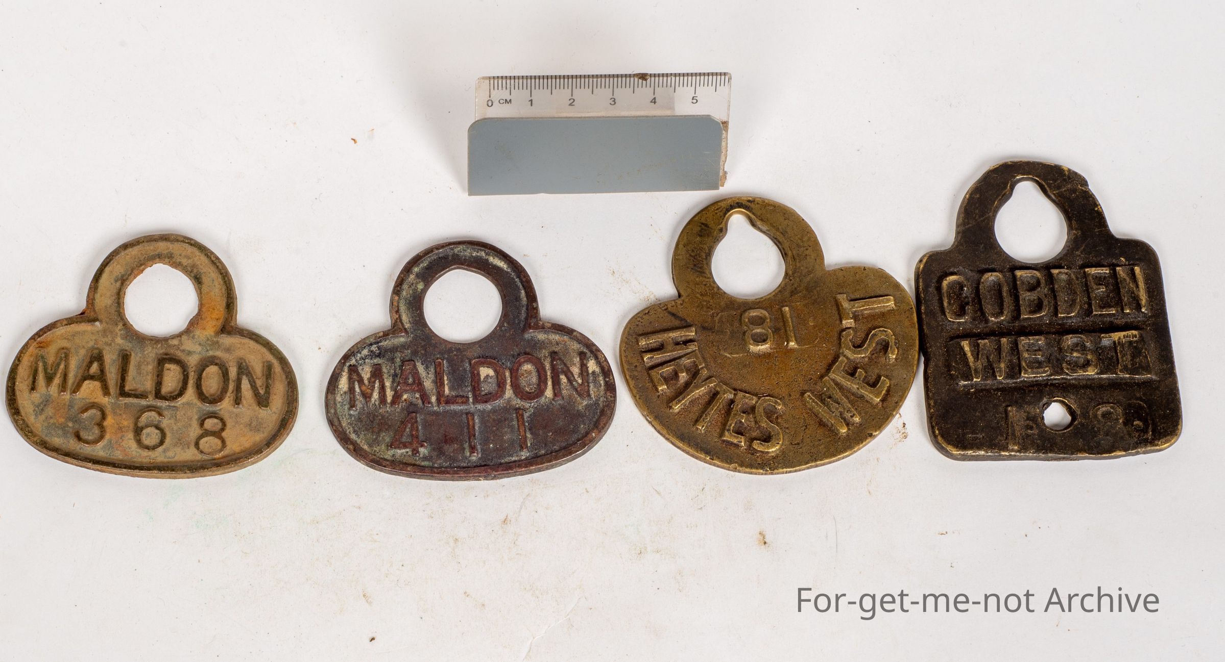 Another group of 4 cast iron common tags. The first one, Cobden West, Victoria. Second one, Heytesbury West, Victoria. Third one, Malden, Victoria. and the 4th one, Malden, Victoria.