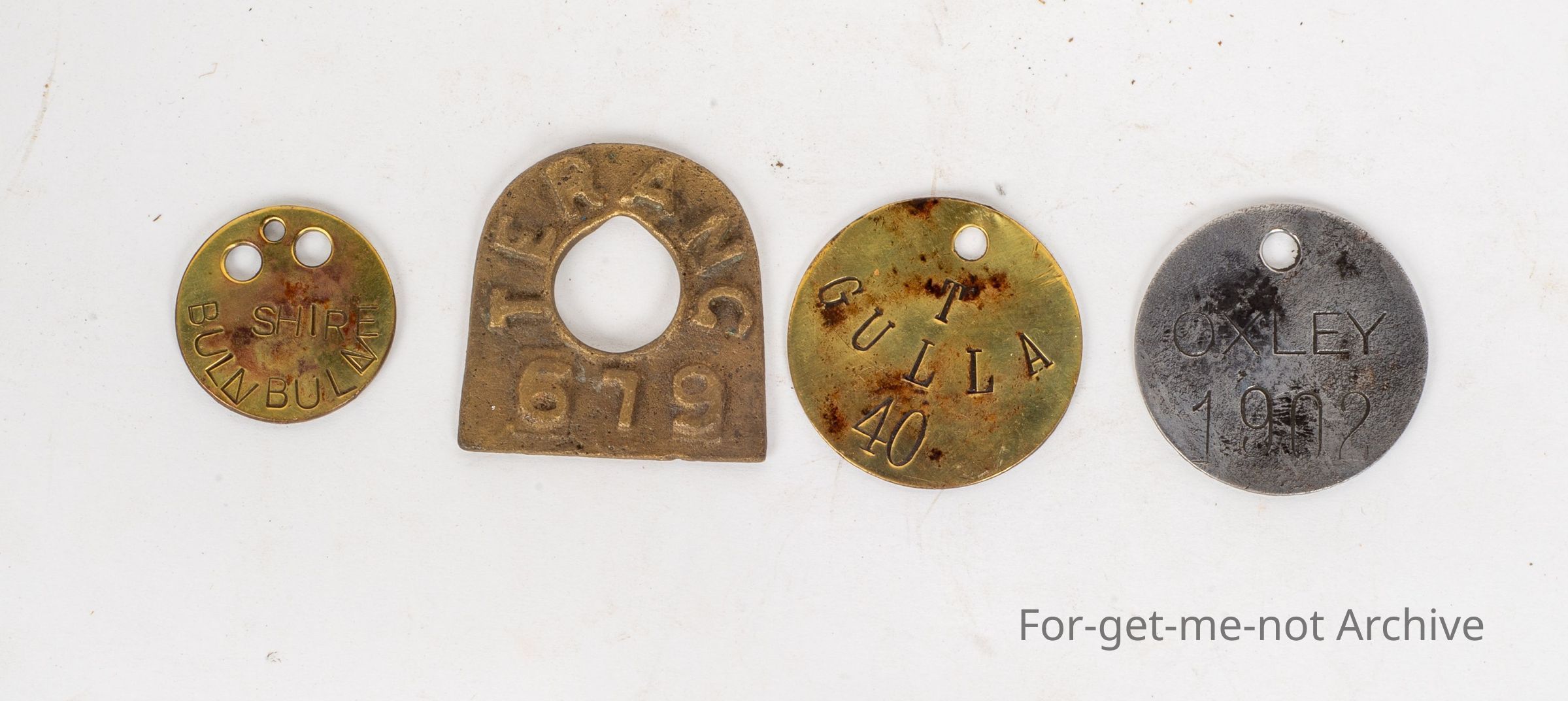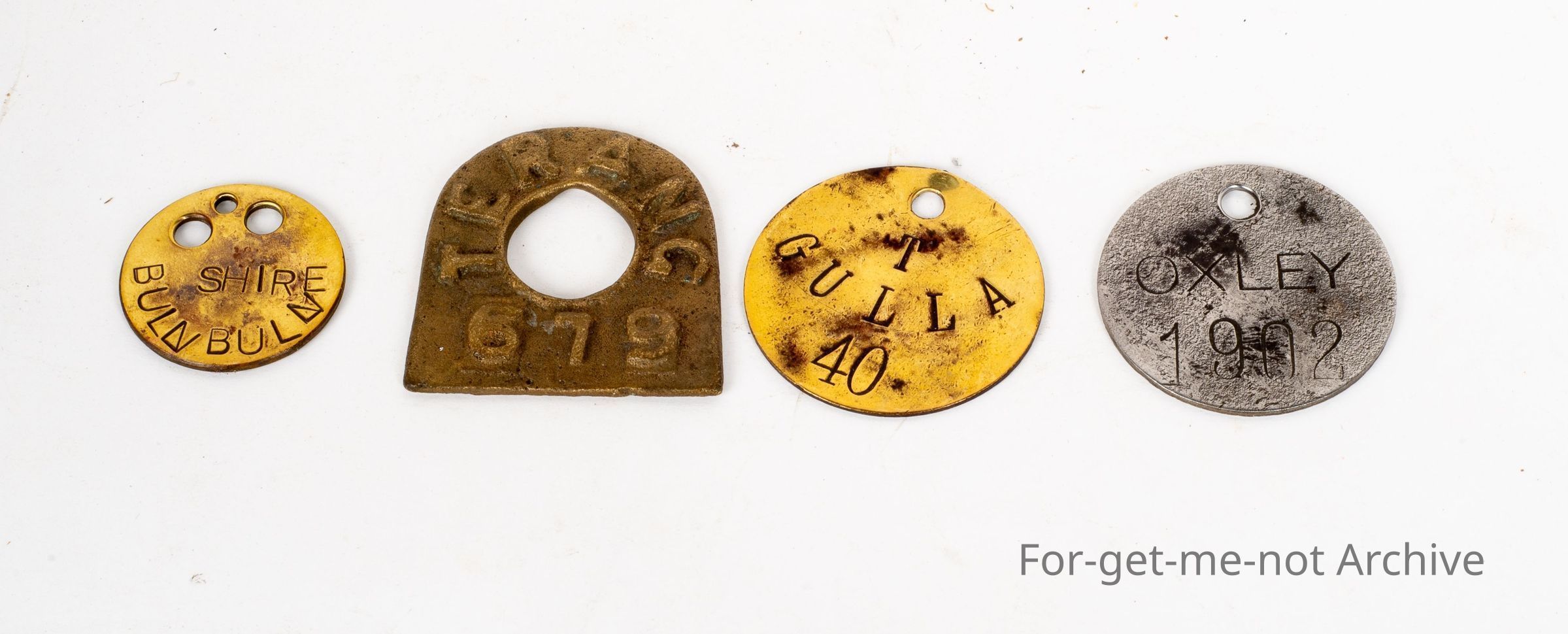 They were stamped on plate instead of casting. The first one is Shire of Buln Buln, Gippsland. The next one is a cast brass for Terang Victoria. The second one, third one is on, tin stamped Oxley 1902, and the third one is Tarnagulla, Victoria on press, stamped on brass. Wonderful group.Collection