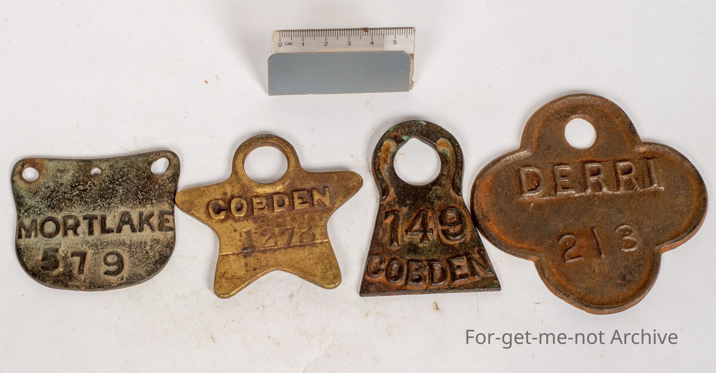 Another group of 4 cast brass common tags. First one, Cobden, Victoria. Second one, Cobden, different shape, a star one. 3rd one, Mortlake, Victoria. This one, instead of going around the neck, goes on the forehead and tied to the horns of a cow. 3rd one, a Derrinallum cast iron, but in very good shape.Collection