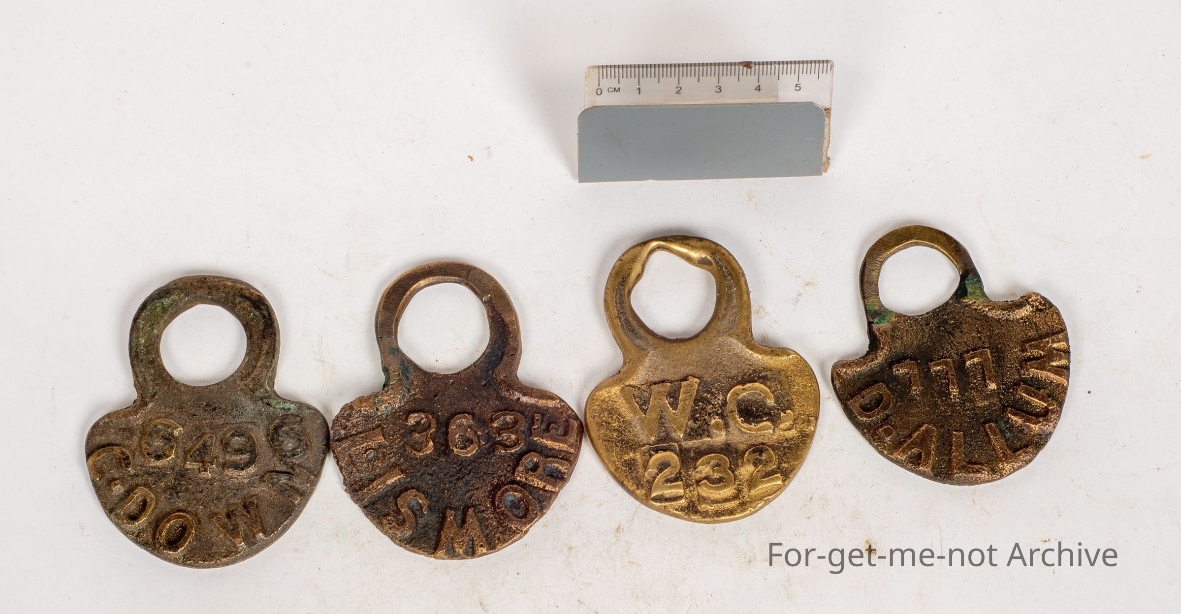 Another group of 4 cast brass common tags. First one, Lismore, Victoria. 2nd one, Camperdown, Victoria. 3 rd. one, Winchelsea, Victoria. Last one, Glenelg, Victoria.
