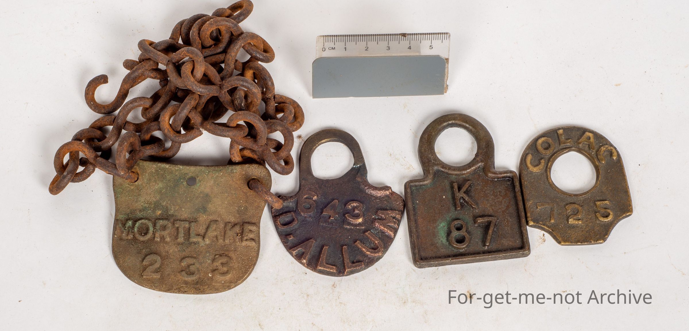 Another group of 4 cast brass common tags. First one, Mortlake, Victoria. 3rd one, Derrinallum, Victoria. 3rd one, Colac. And the 4th one, Korumburra, Gippsland.