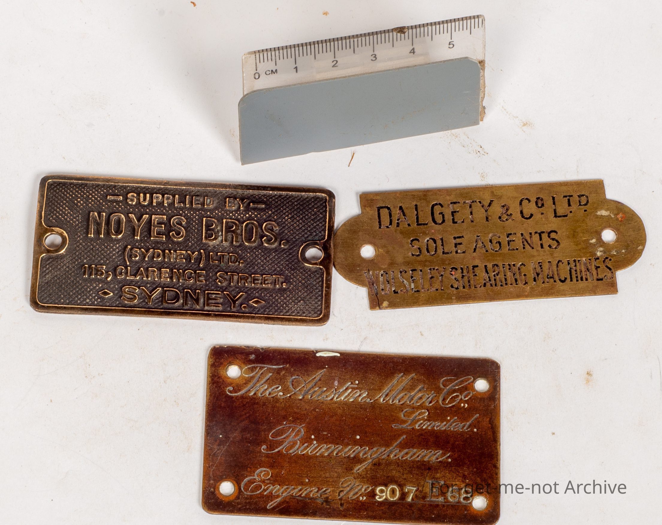 The first one, Dalgety and Co, sole agents, Wolseley Shearing Machine. The second one, supplied by Noyse Brothers, Clarence Street, Sydney, beautiful piece. 3rd one, the Austin Motor Company Limited, Birmingham, engine number 907. Lovely bits,Collection