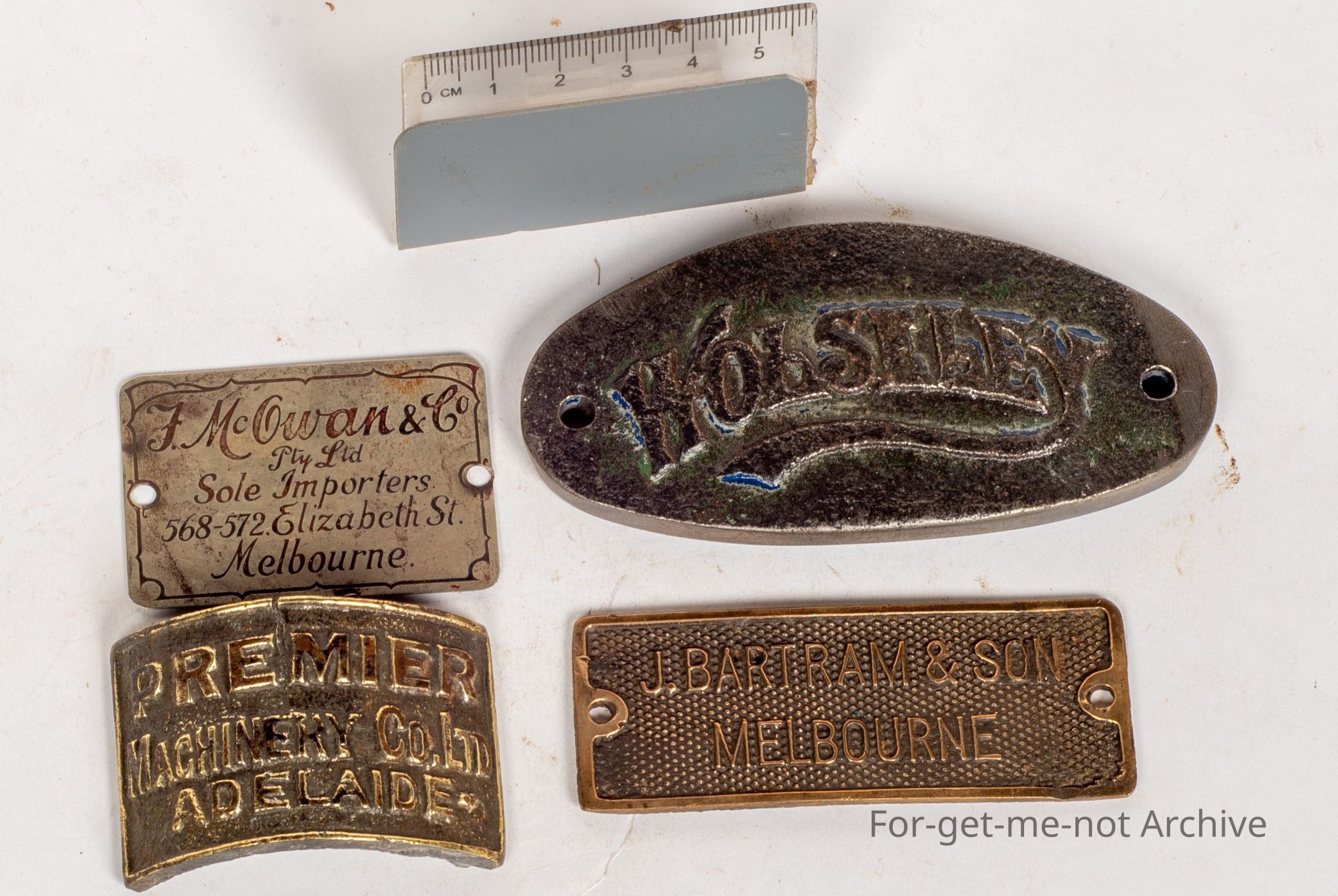 Cast Brass. The first one, Jay Bartram and Son Melbourne. The second one, F McGowan, Sole Importers, Elizabeth Street, Melbourne. The third one, Premier Machinery Company Adelaide, curved, cast brass. And the 4th one, cast iron, slightly curved from Wolseley, which would have been on one of his stationary motors.Collection