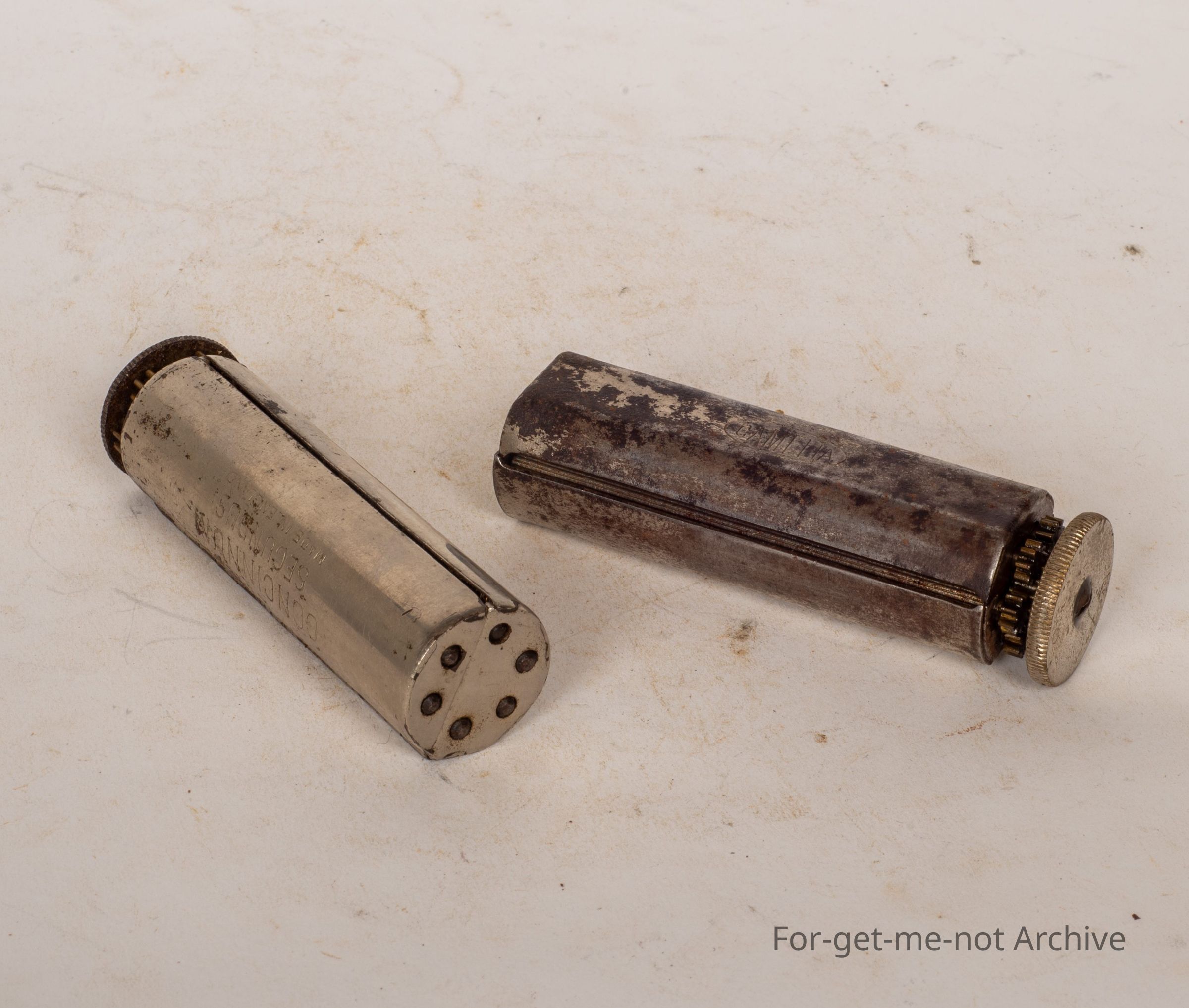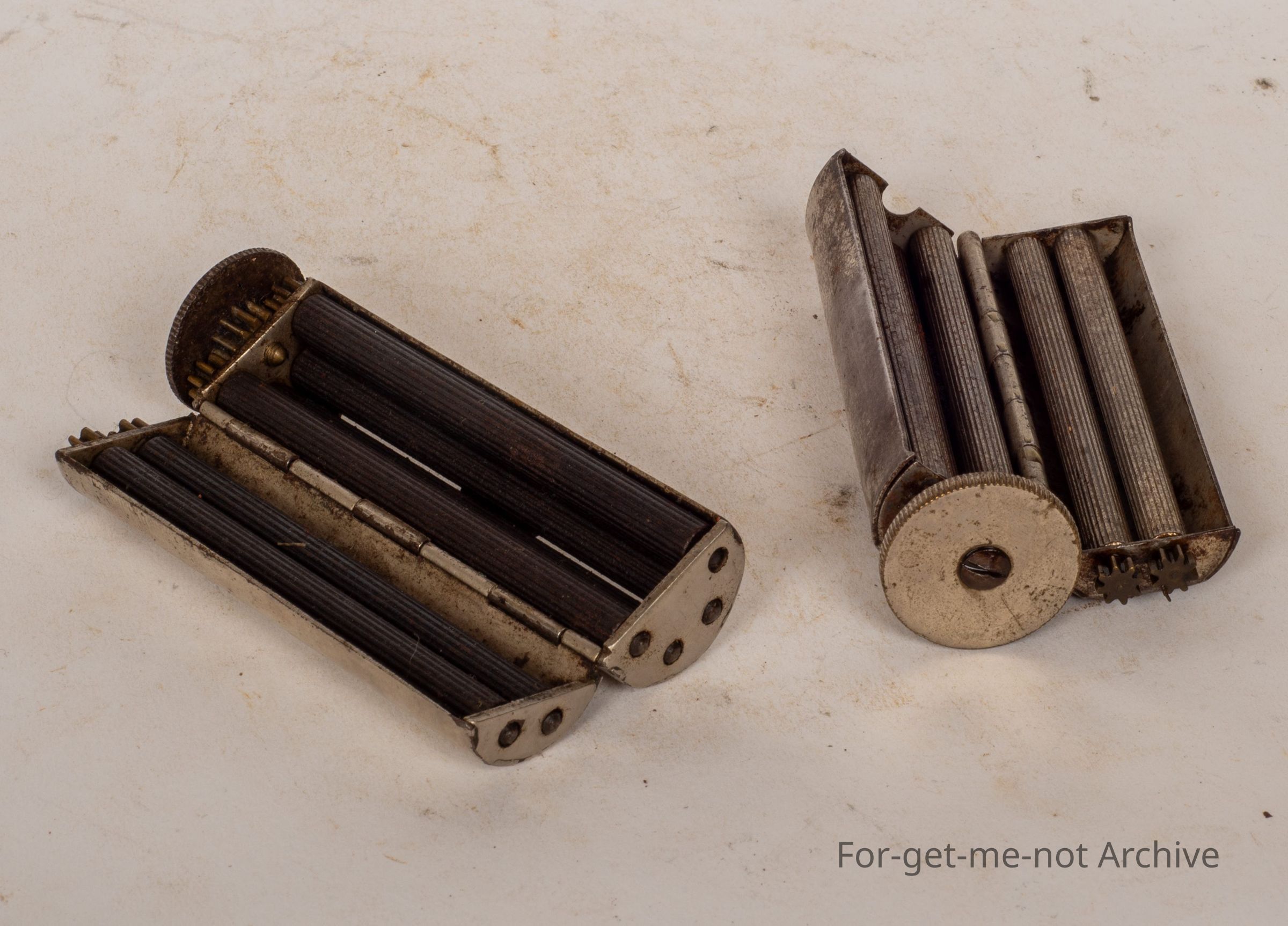 These are 2 little, cigarette rolling machines. Both in working order. Beautifully made and geared things. Marvelous away they worked.