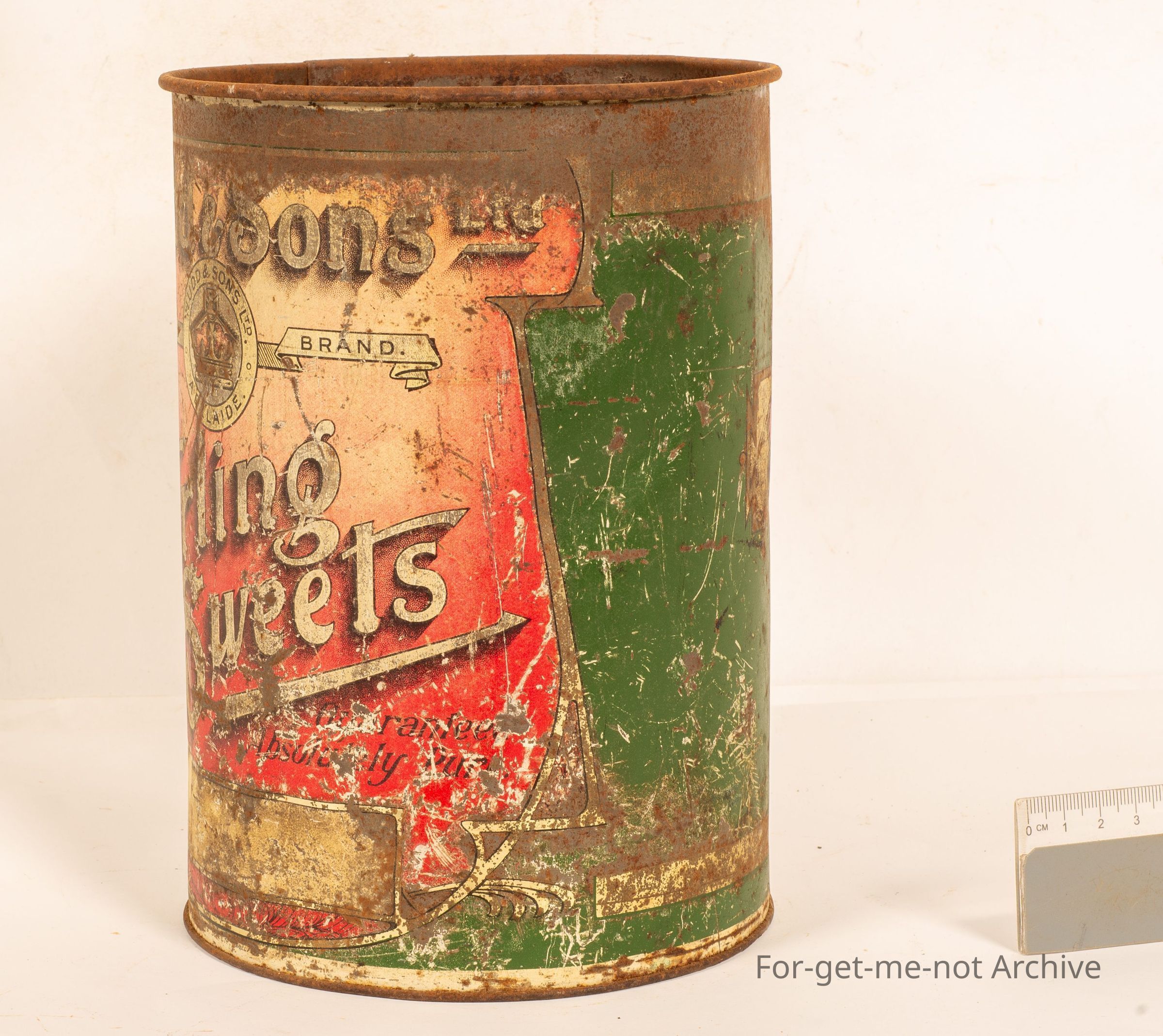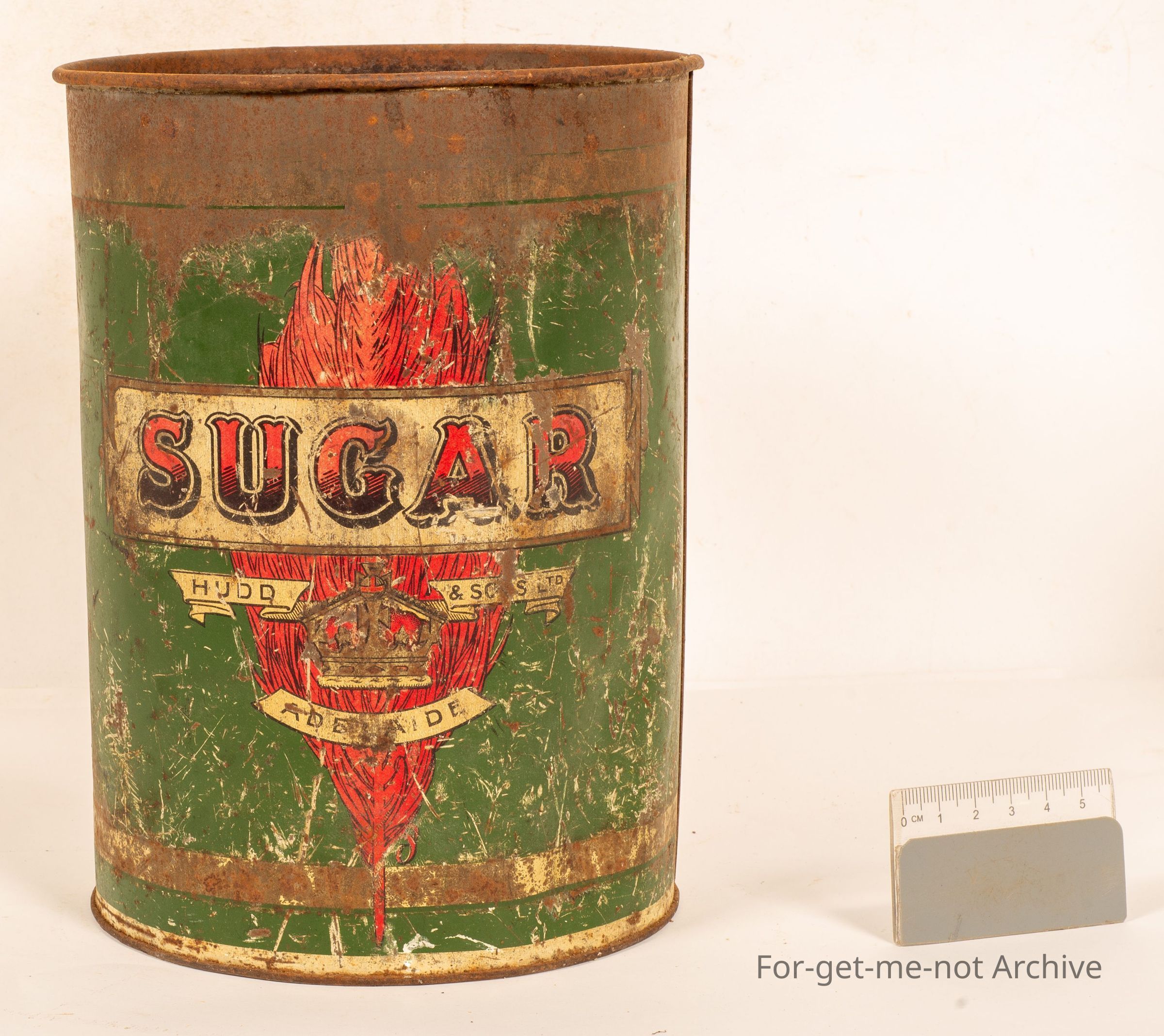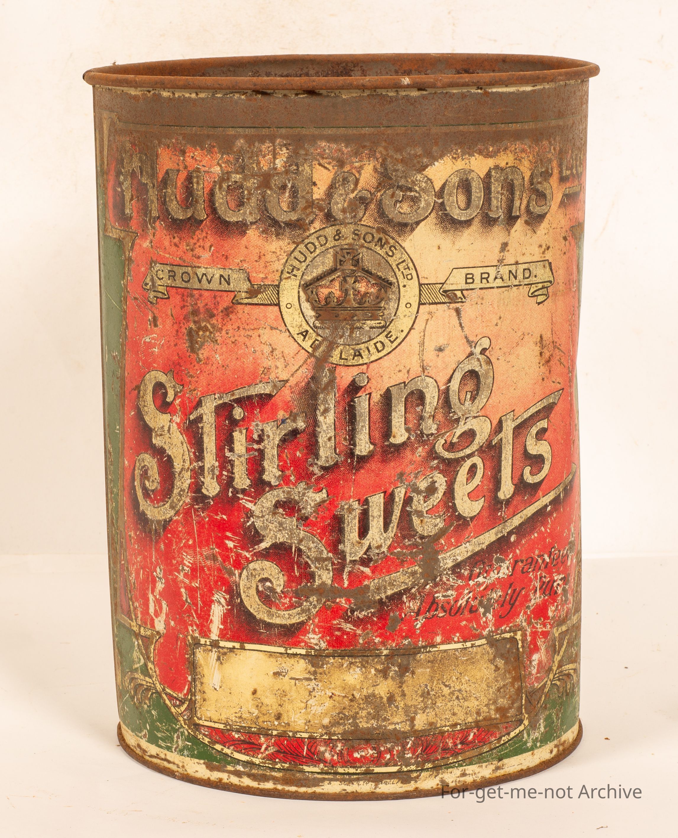 This is a tin from Hudd and Sons, Sterling Sweets, Crown brand. Tin in pretty down condition. From Hudd and Sons Adelaide. This would possibly be quite a rare tin. Would have been beautiful graphics when it was, in a better shape. However for that is probably a rare tin. Sugar on back for use as storageCollection