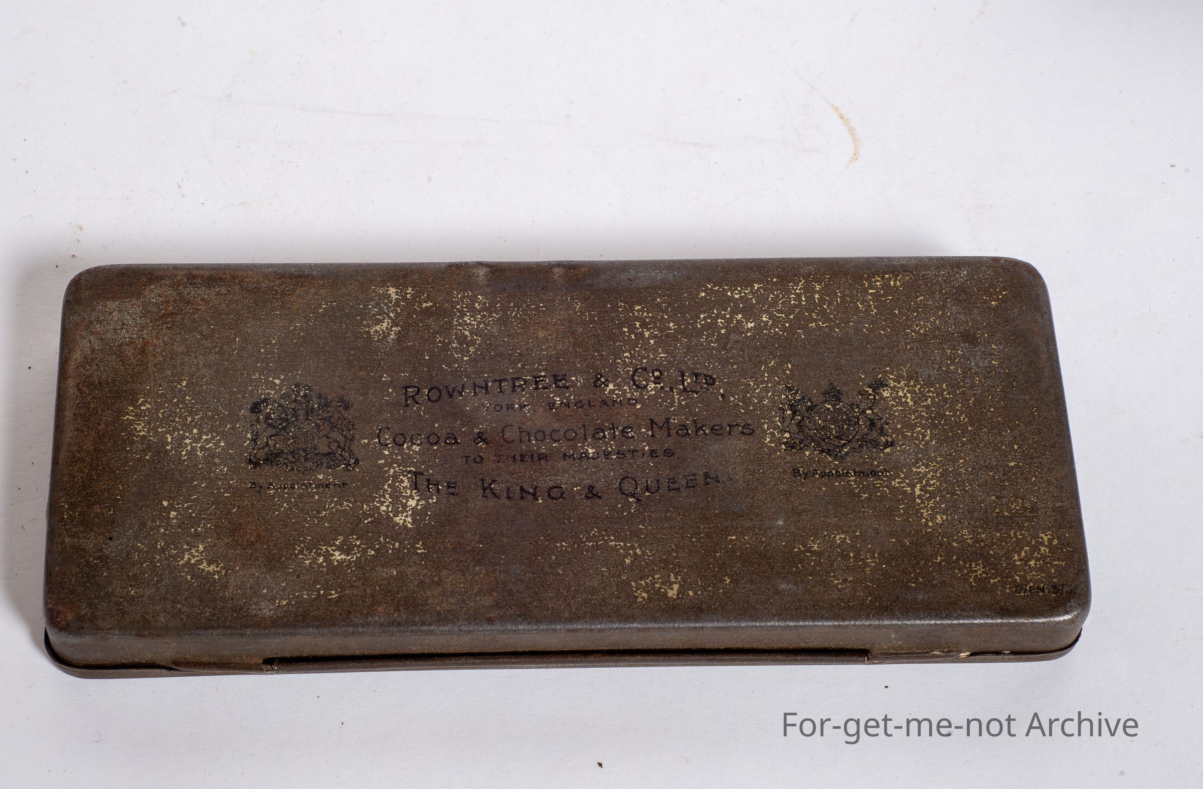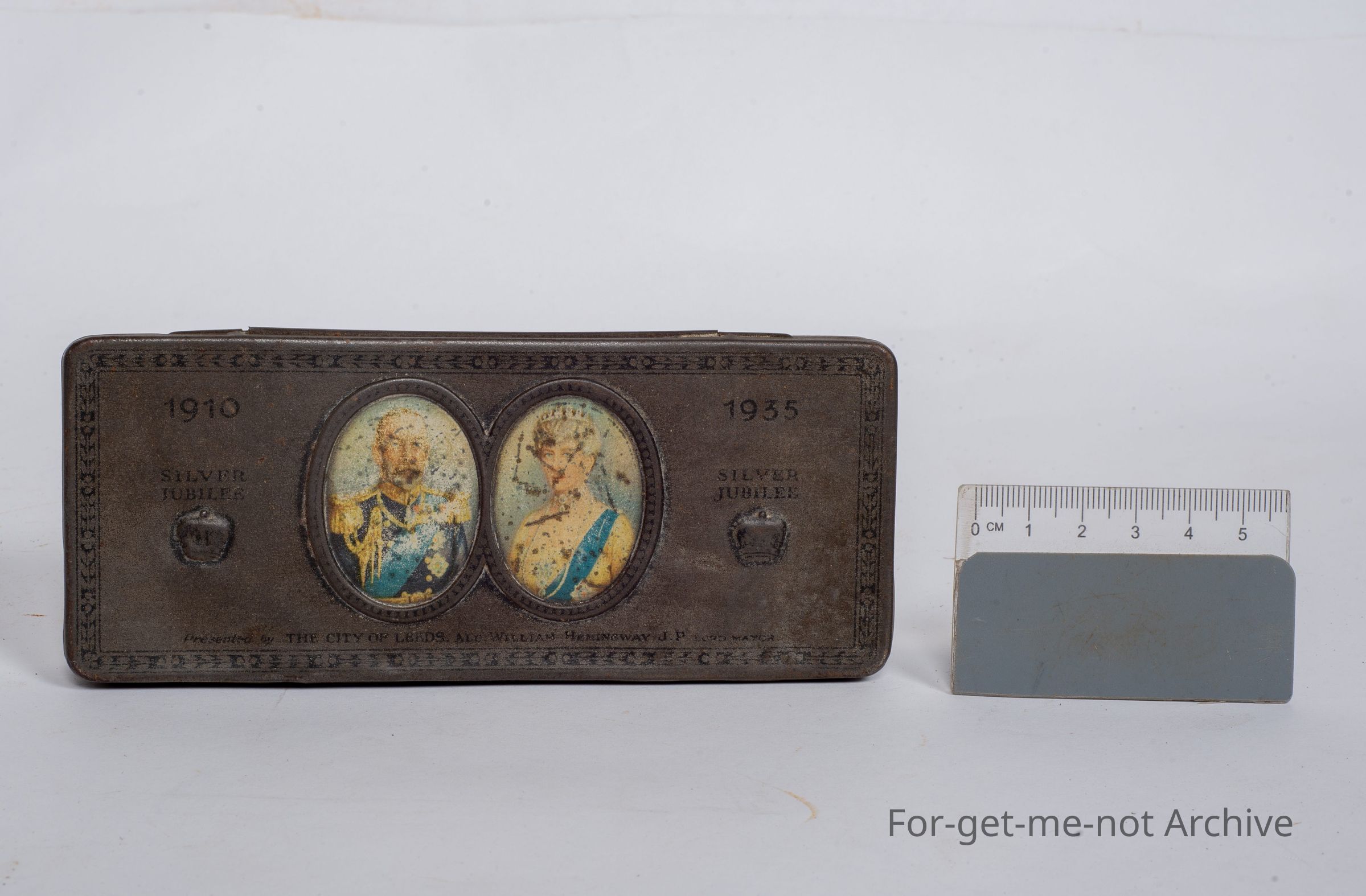 This is a small tin from Round Trees Chocolate, commemorating from 1910 to 1935, the Jubilee of the Queen Mother and father, presented to Hemingway. Silver Jubilee. Silver Jubilee.Collection