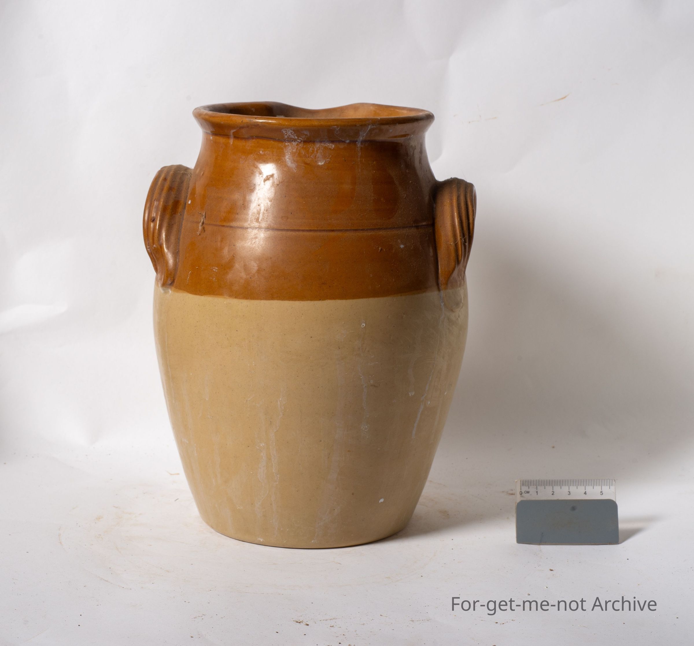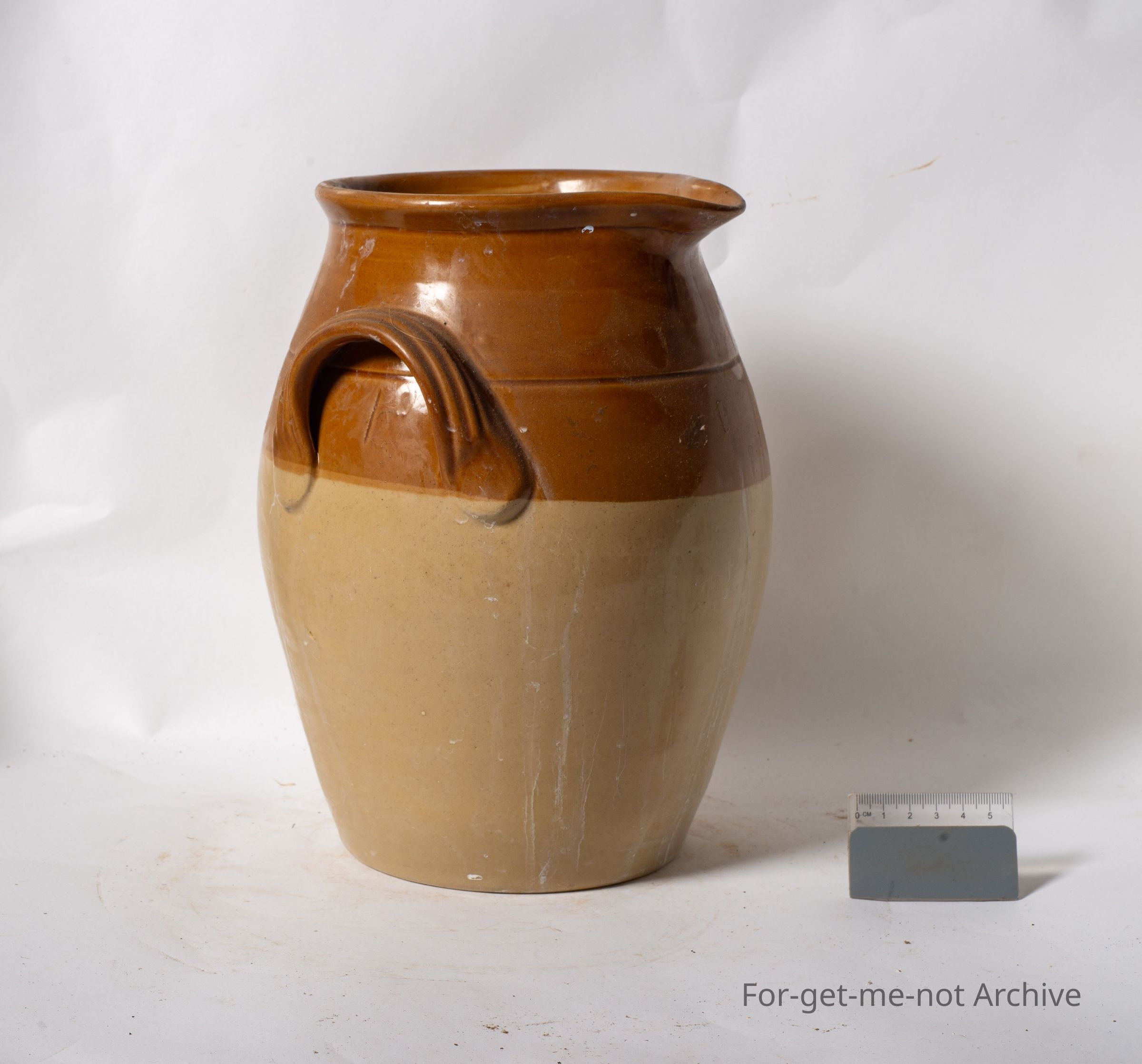 Ceramic Pottery, This is, an open top container. Got a pouring lip, 2 big handles, no stamping in a, in a semi oval shape. Very likely to be English rather than Australian.