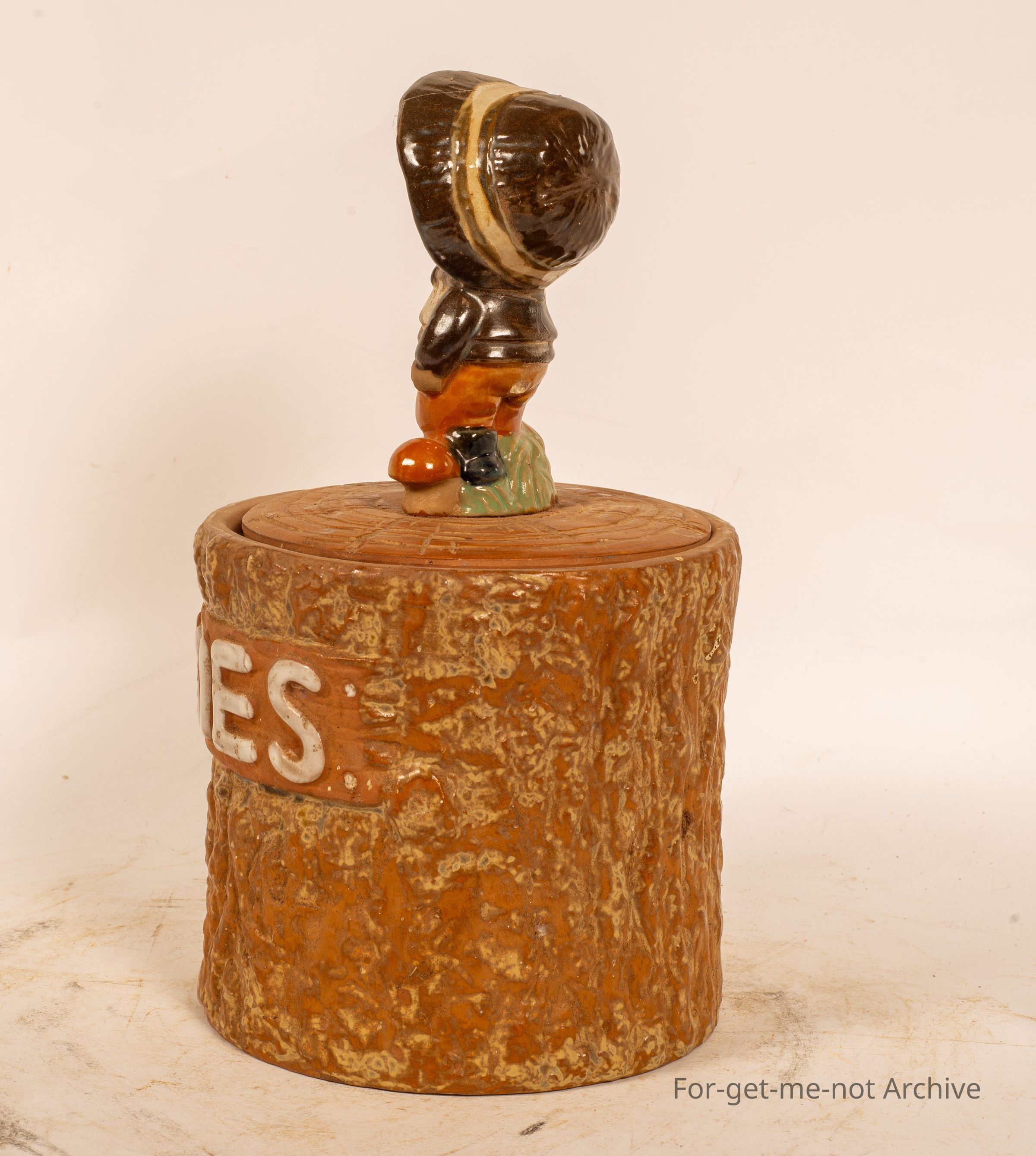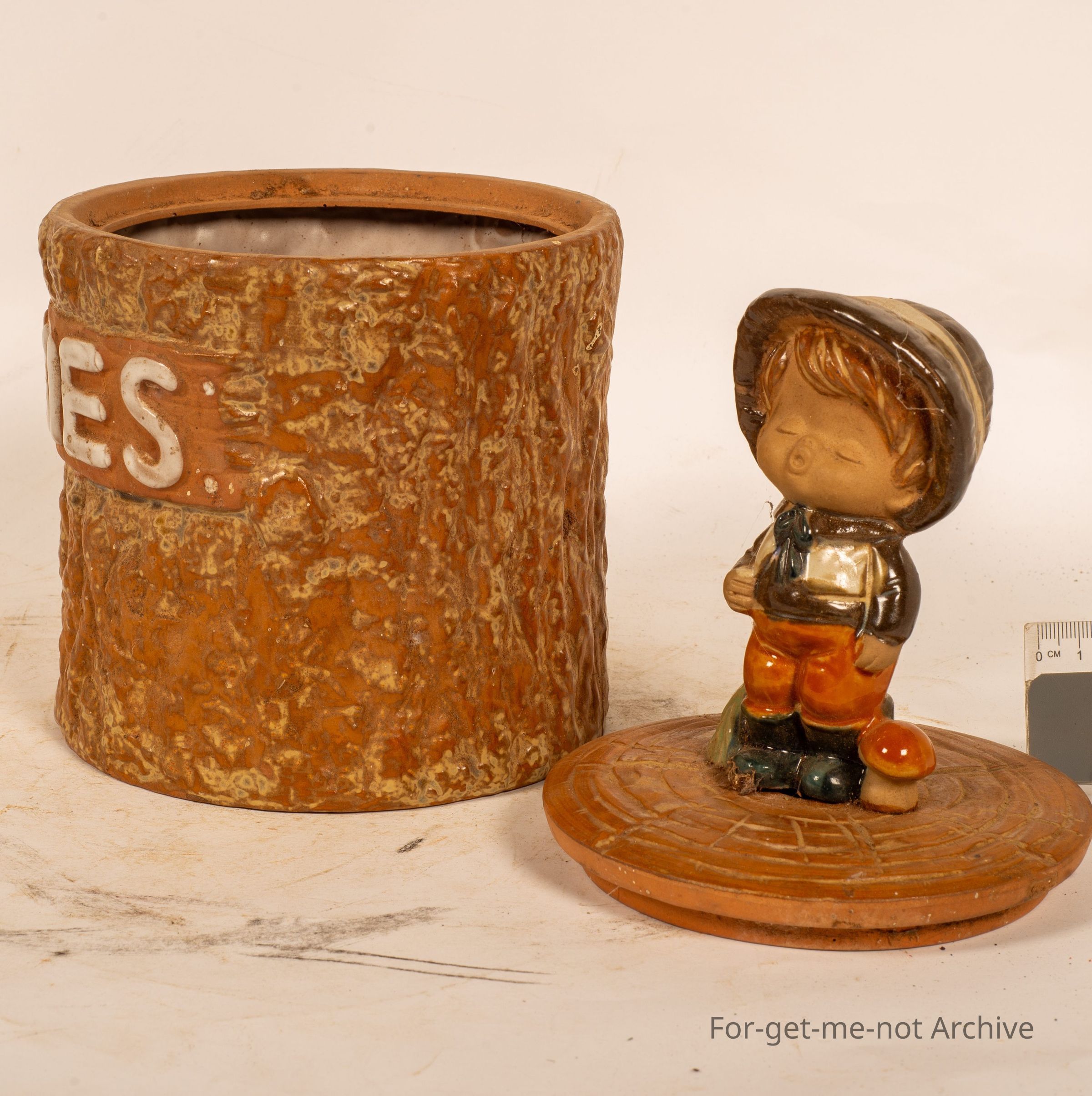 This is a another ceramic cookie jar. The top or the lid, features a boy with a hat on. These are like a terracotta make. A very cheap item.