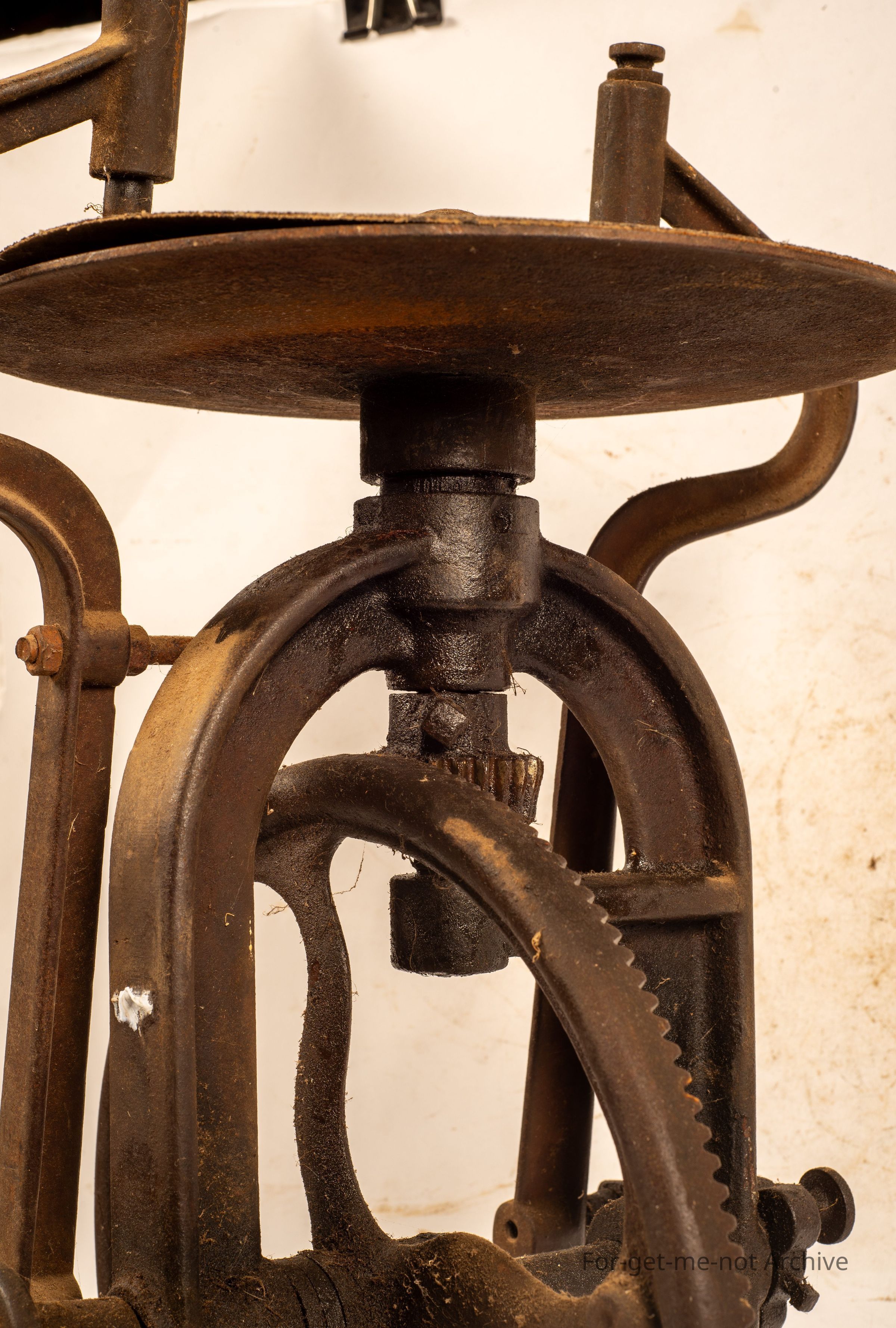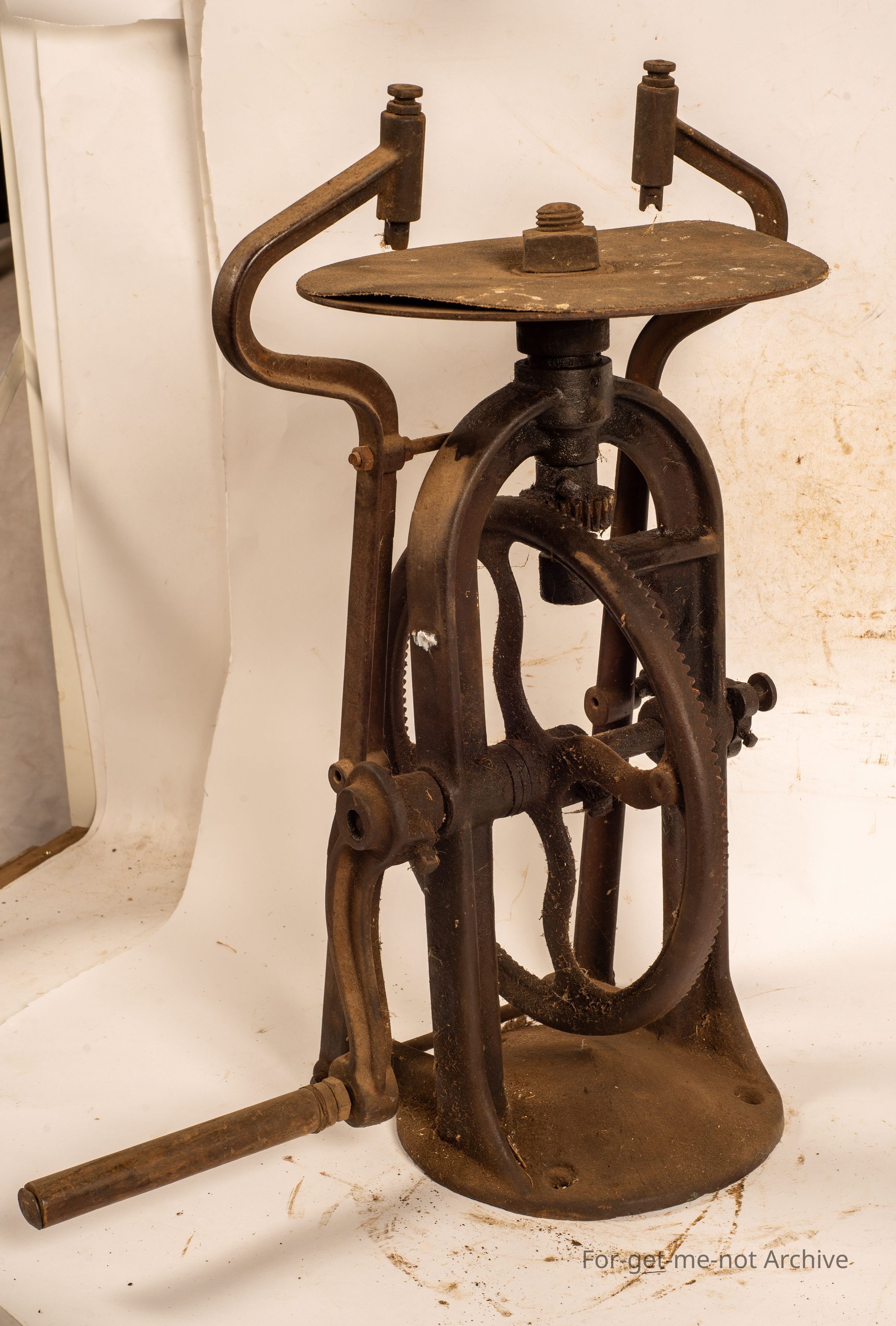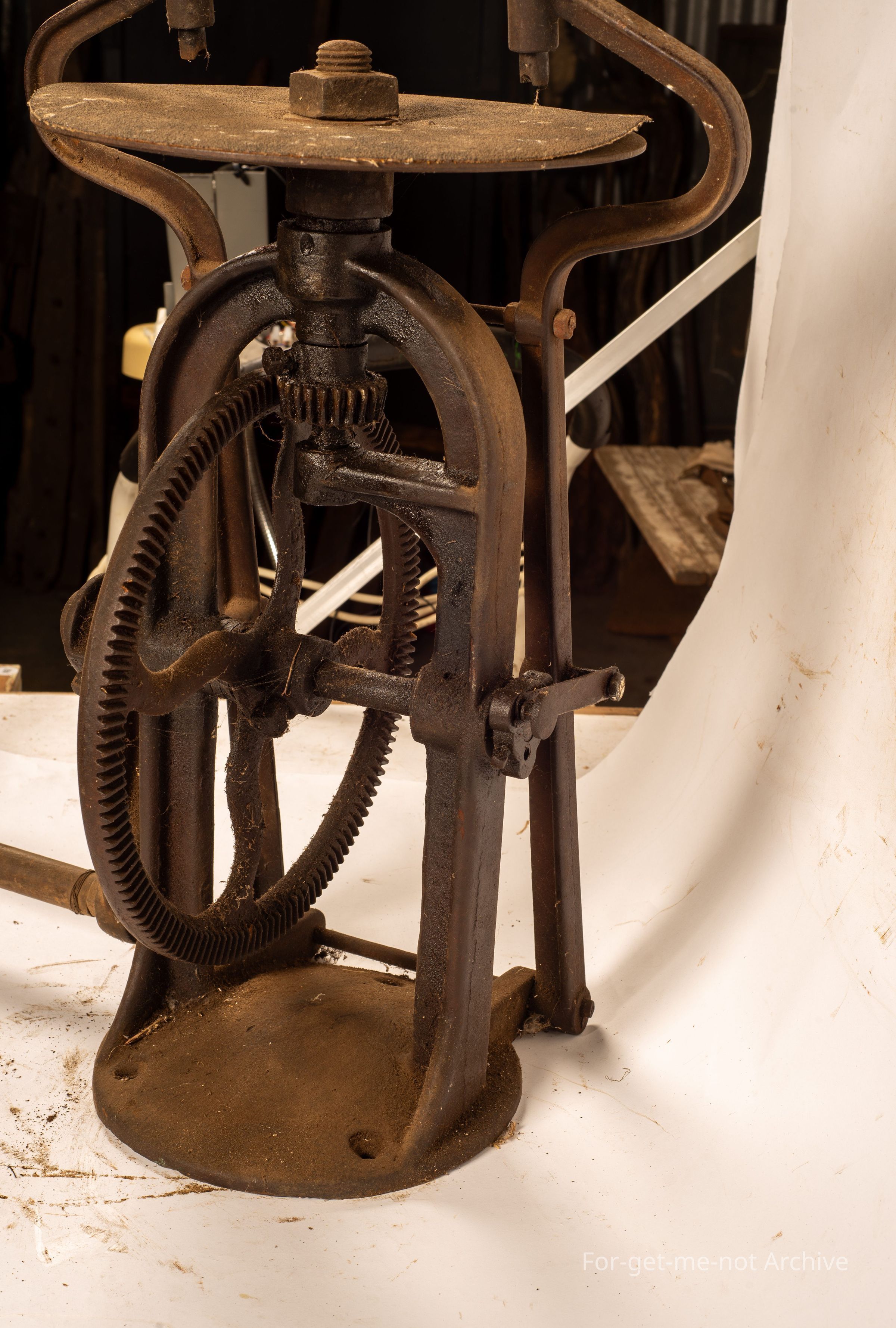This is another one of the hand operated Cooper comb and cutter Grinders. This one's an earlier one. Quite tall construction. The pressure plates oscillate across the top of the disc. Quite a rare piece.Collection