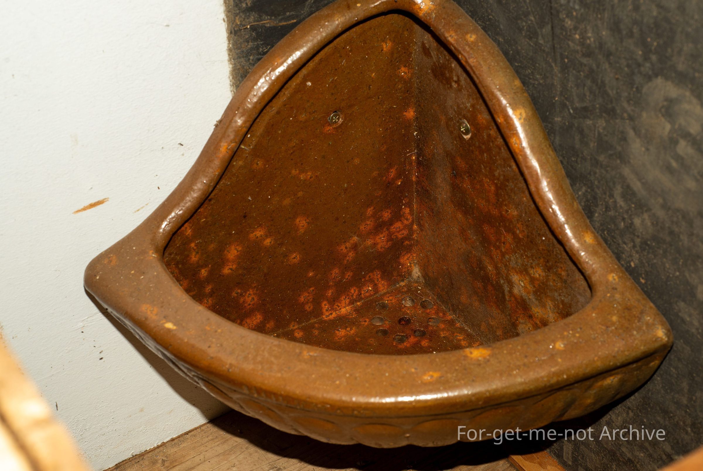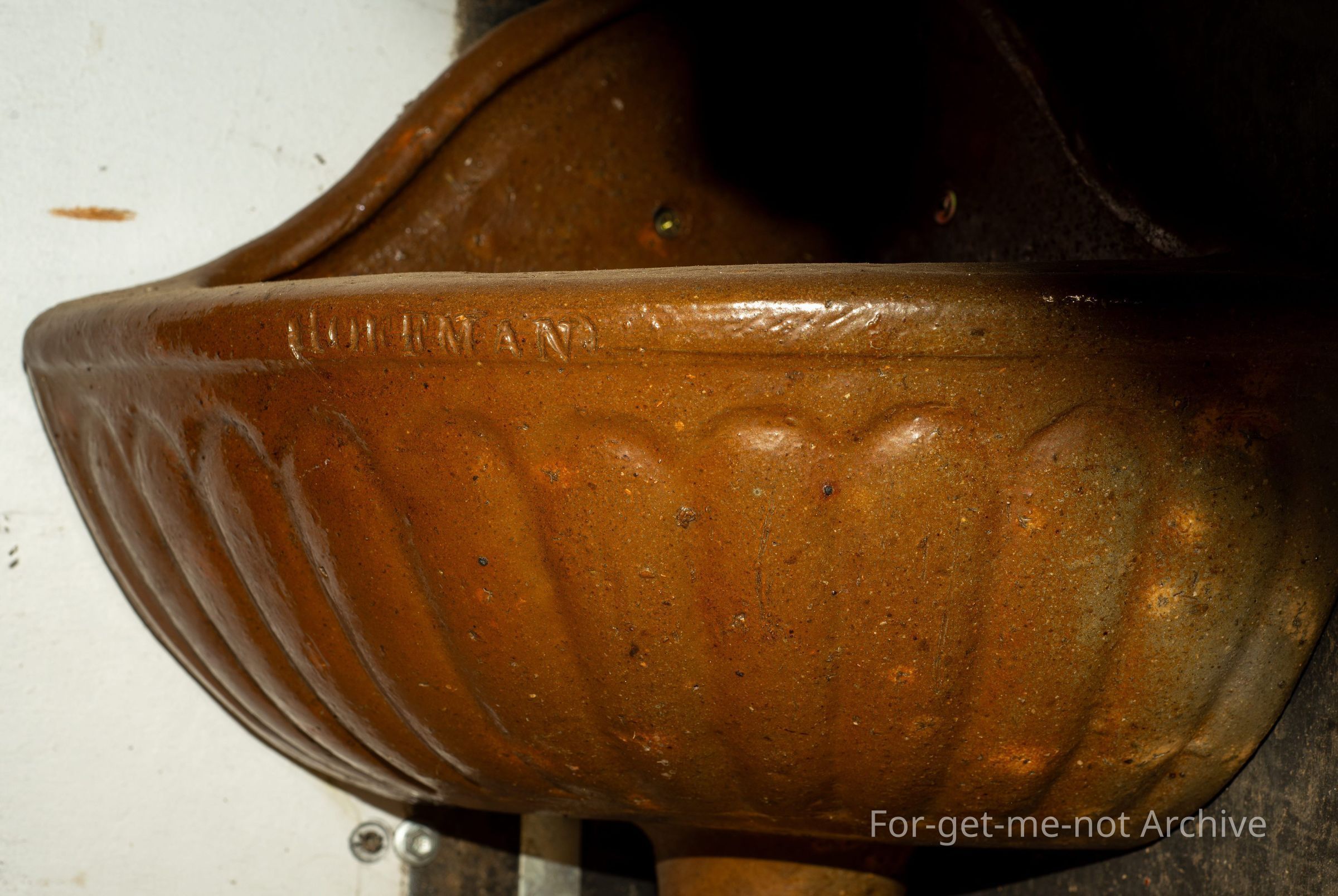 Item, stoneware, corner urinal. , this is quite a decorative piece, fitted into the corner of a lavatory for men. This by the glaze which is brown and the decoration, Possibly. It's Hoffman. Hoffman. Made by Hoffman Pottery Melbourne.Collection