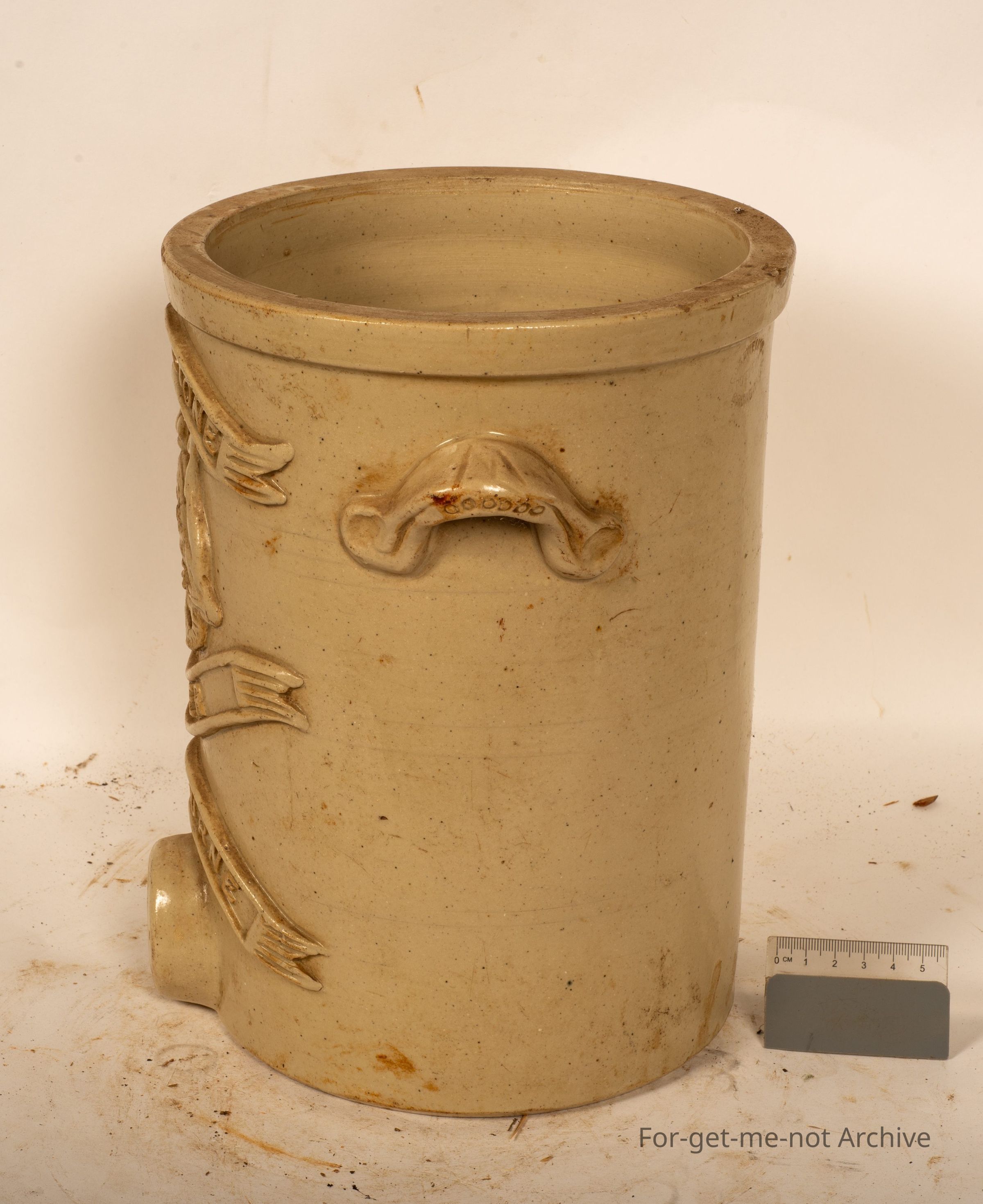 Stoneware Pottery ,This is the smallest of the water filters. This one has a coat of arms on the front featuring the emu and kangaroo. This is from Price or titled Price Dripstone Filter, Melbourne. The actual filter, the drips, the sandstone filter is not here. The lid's not here, but it is clearly stamped Cornwall's Brunswick Pottery.Collection