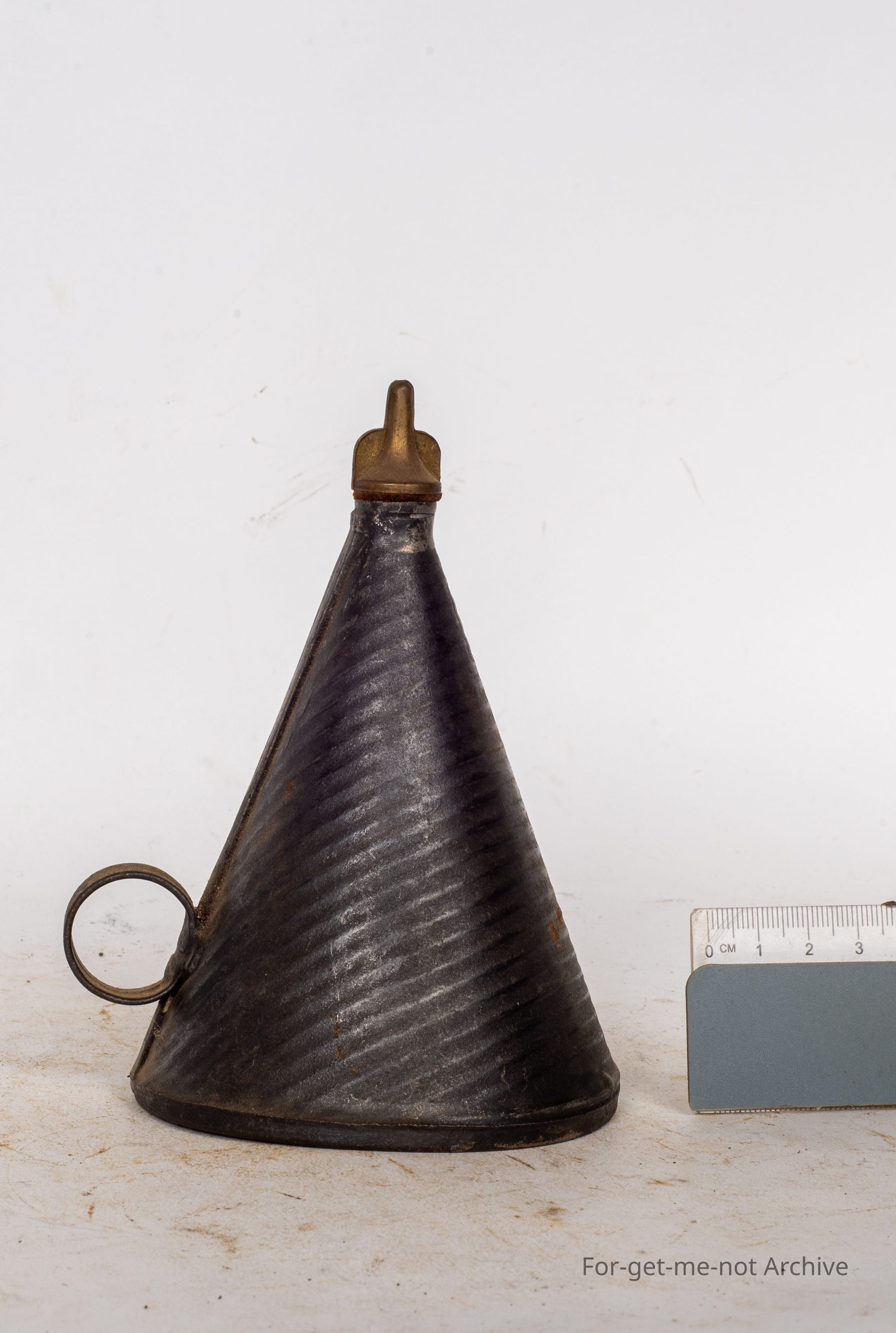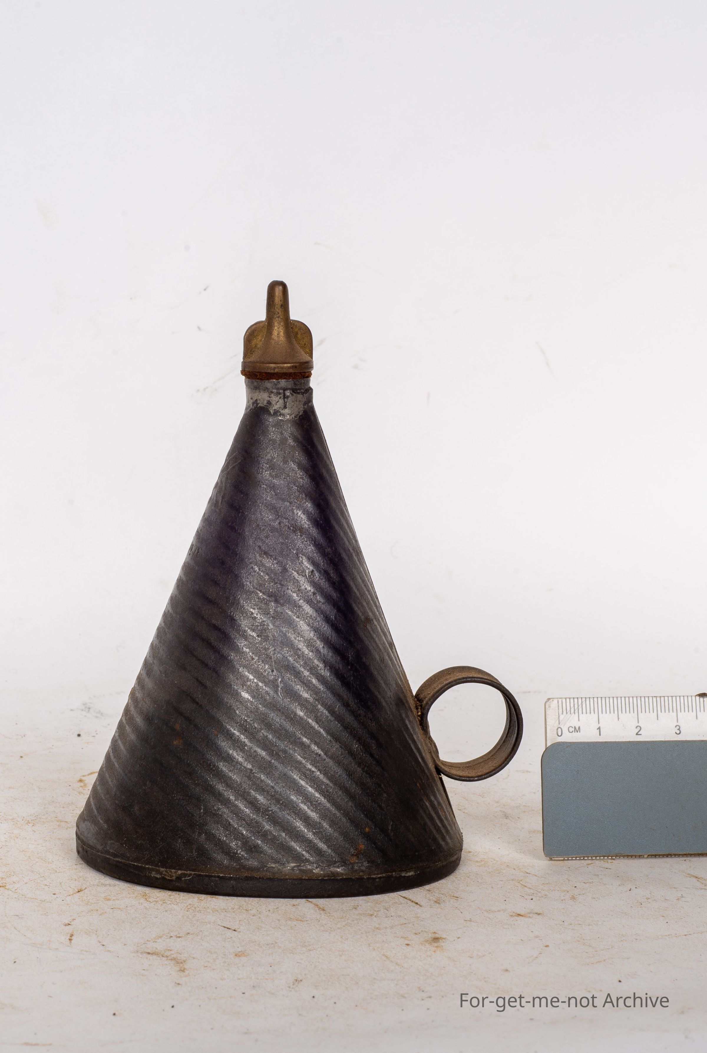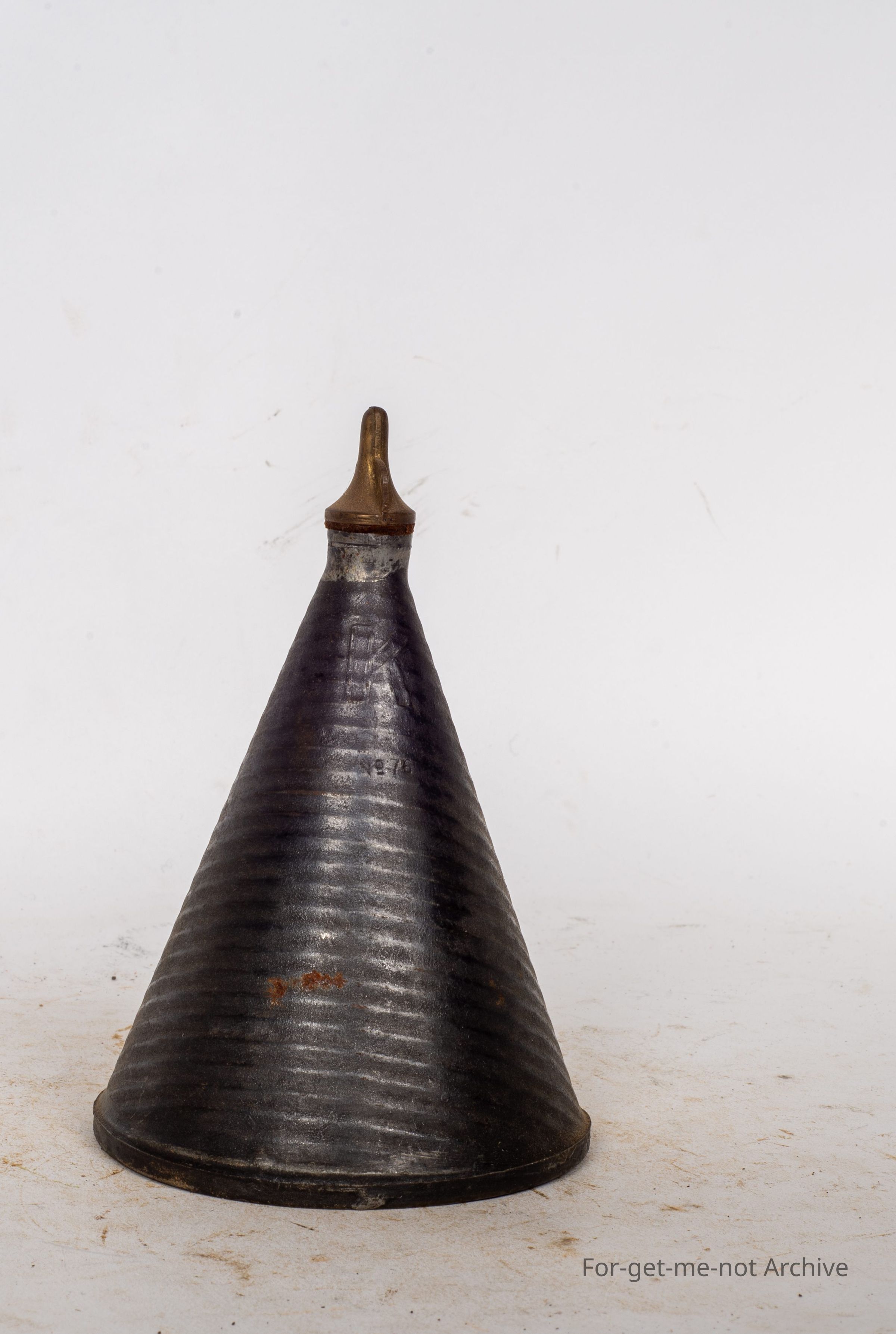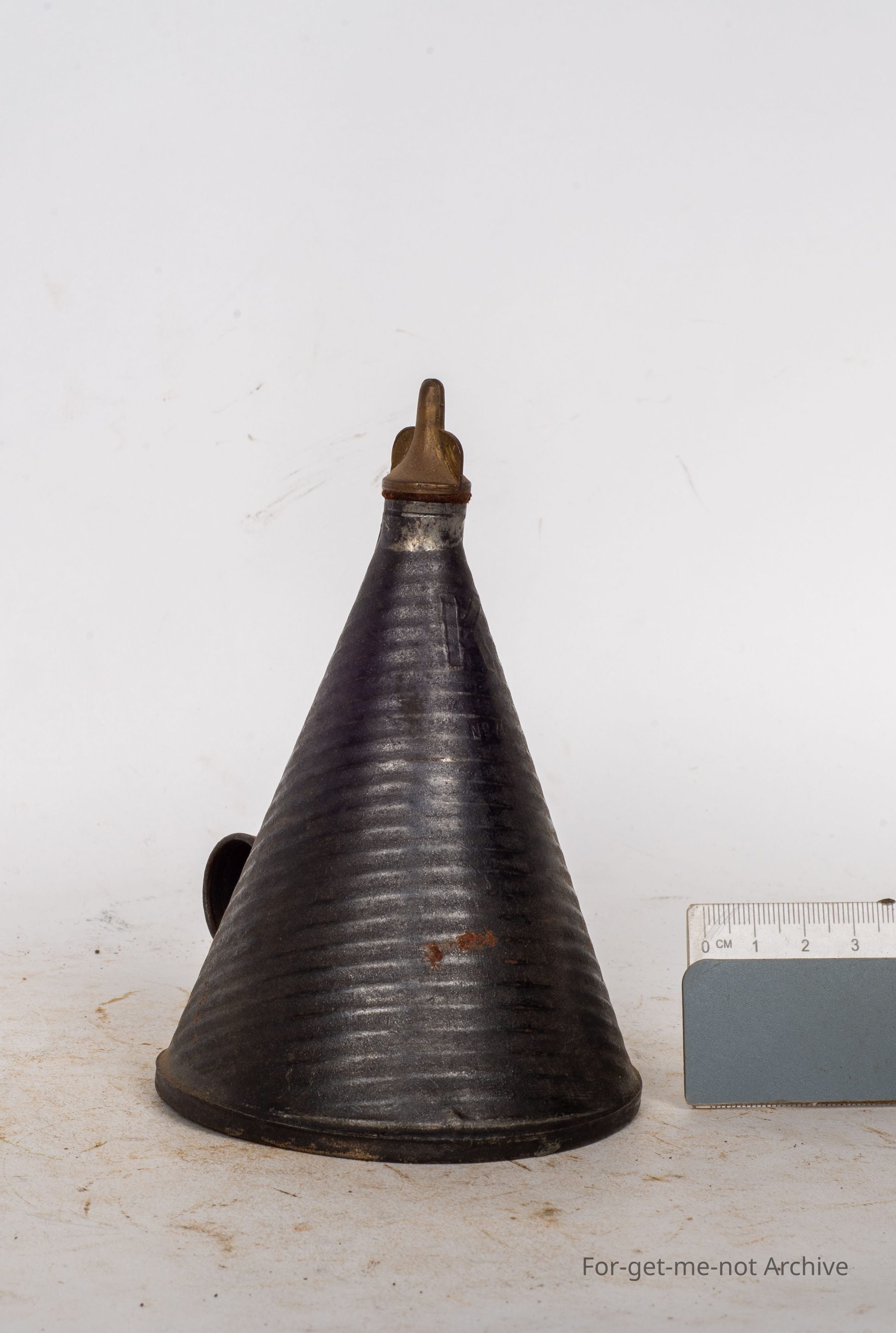 This is a beautifully, corrugated oil can made by Kay's. The corrugations are for the entire body from bottom to top. Very attractive work, cleverly made, good condition,